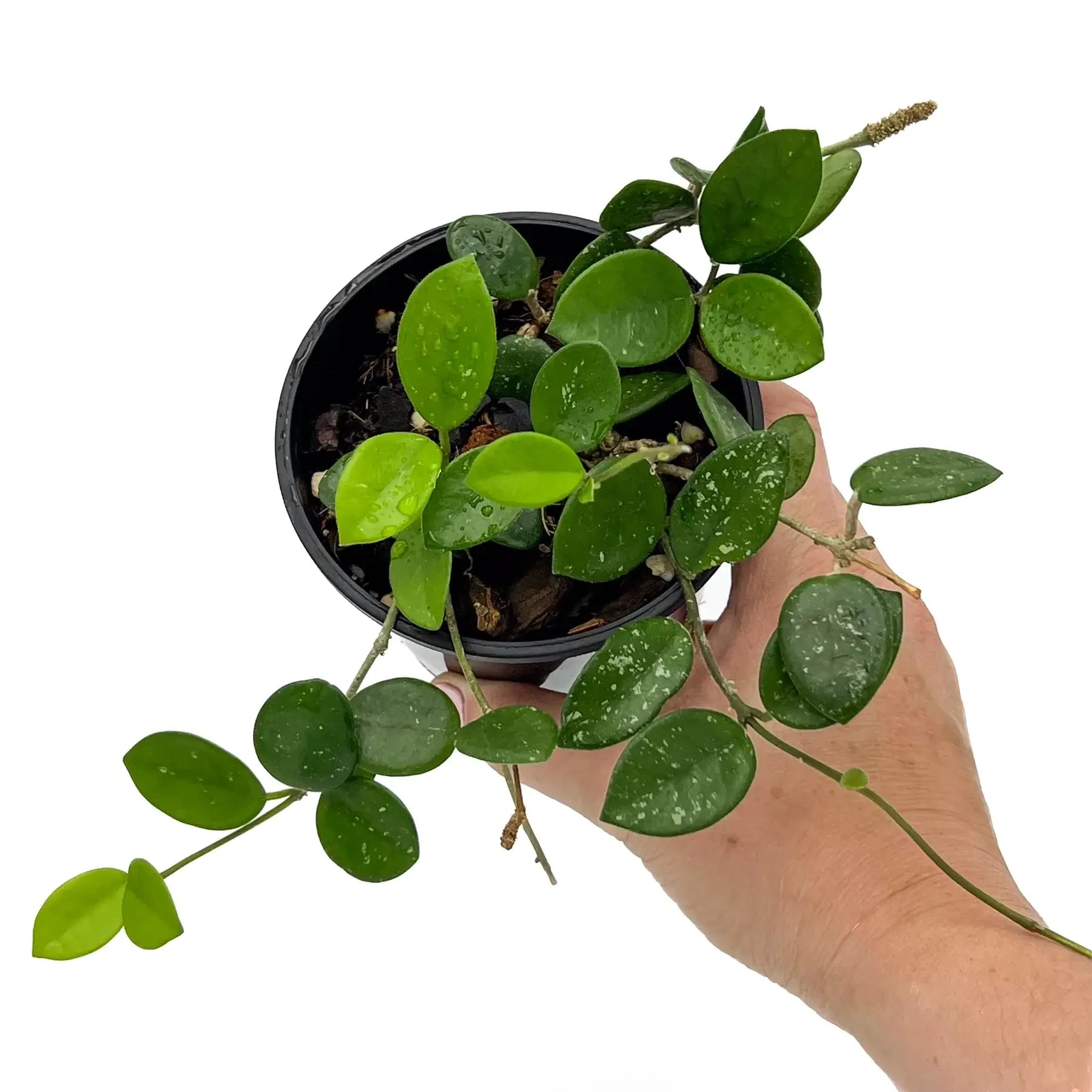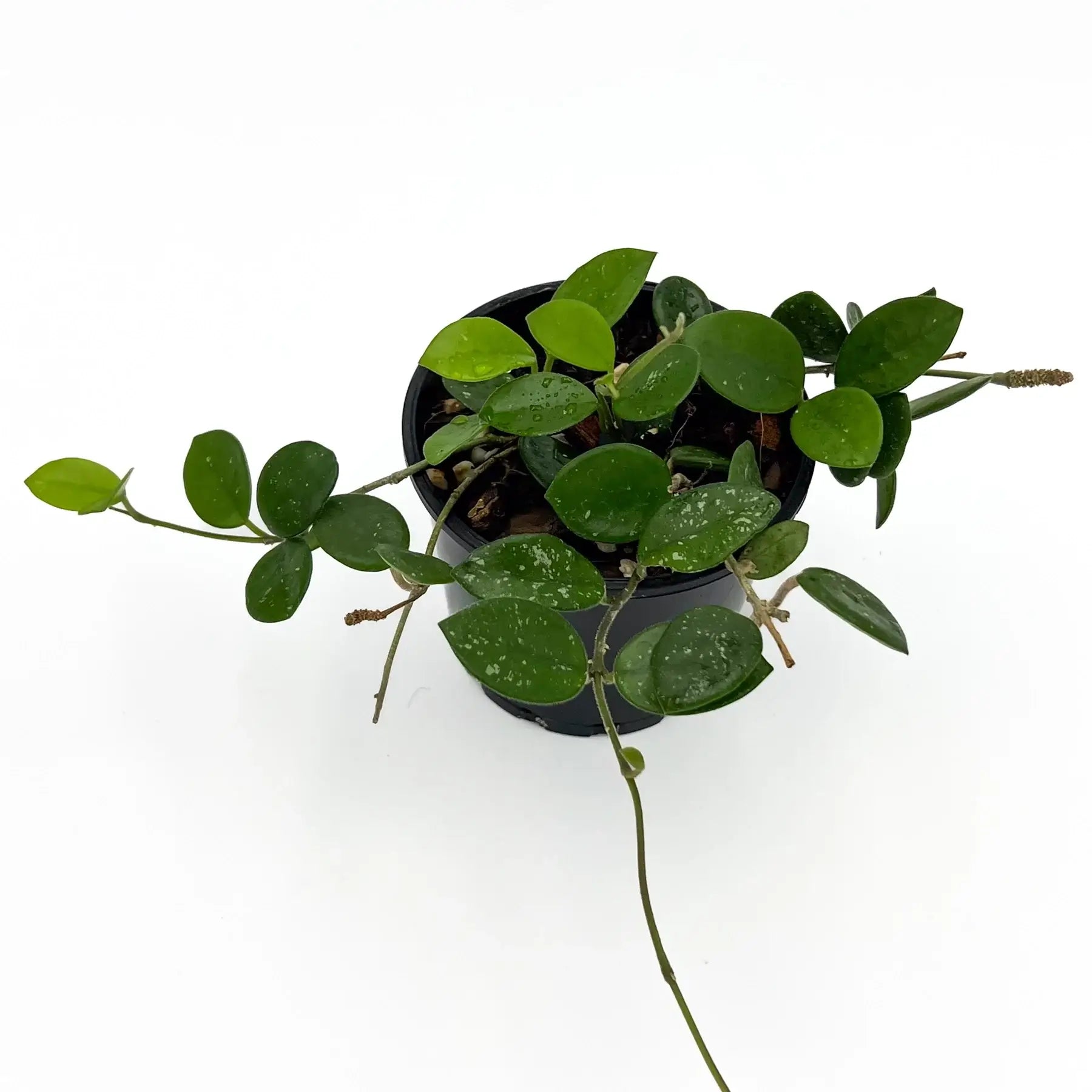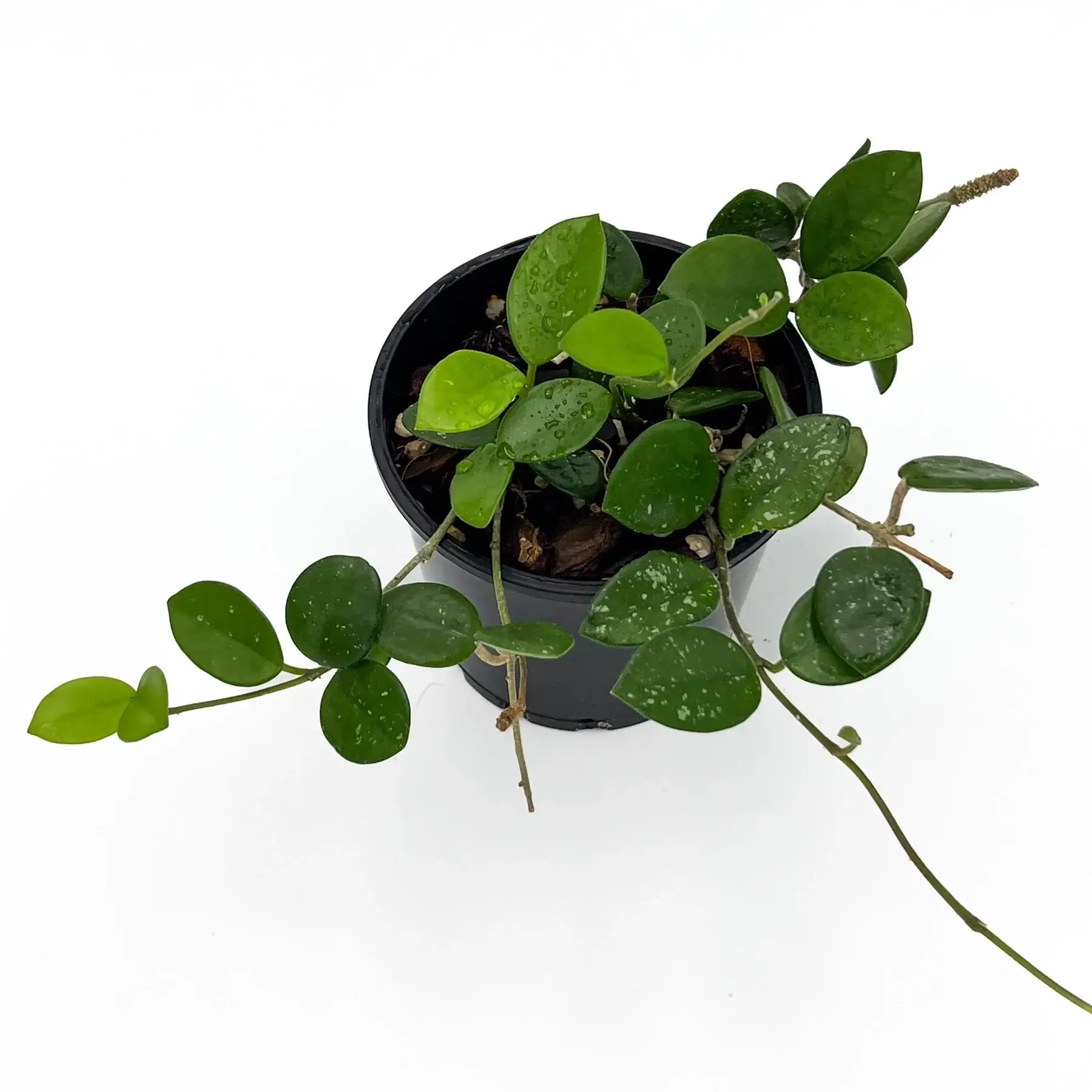 Hoya mathilde, a hybrid of Hoya carnosa and Hoya serpens, is a climbing plant known for its waxy, green leaves marked with white speckles. The leaves are thick and arranged on twisting stems, creating a dense foliage. It produces clusters of star-shaped, waxy flowers that range in colour from white to dark pink, appearing at the tips of its stems. This plant is well-suited for hanging baskets or trellises, where its compact vines can drape or climb, showcasing its glossy, speckled leaves in a simple, elegant manner.
