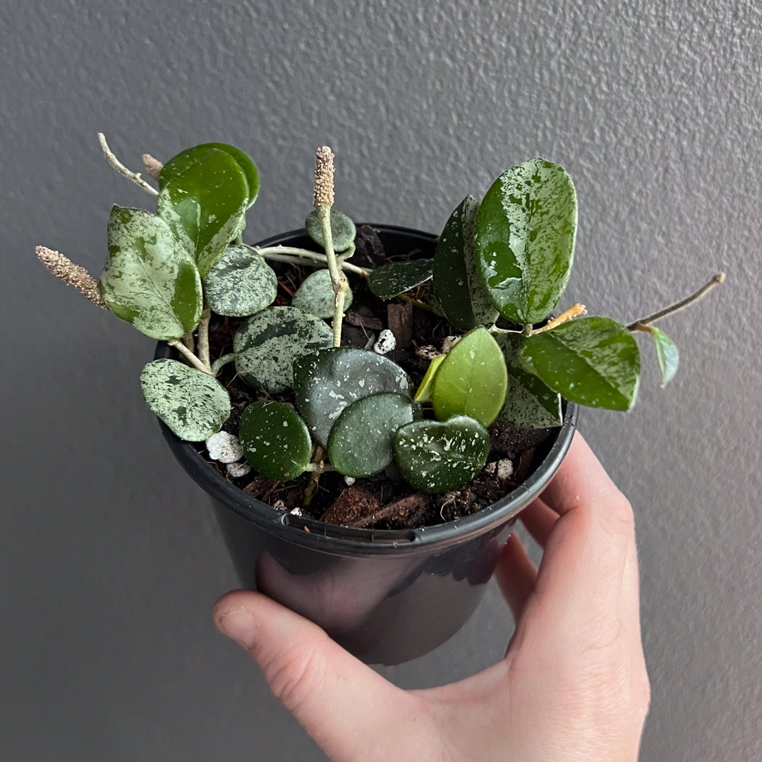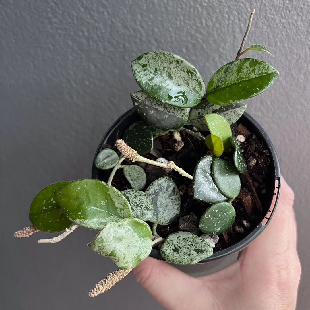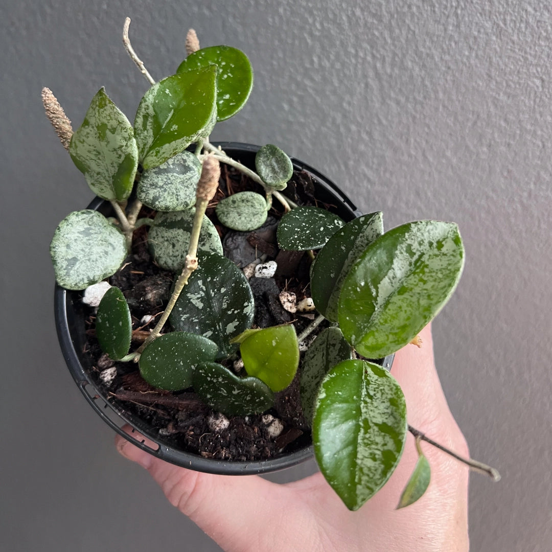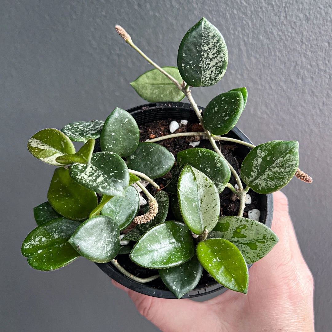 The Hoya mathilde 'Splash' is a gorgeous plant with small, splashy leaves measuring approximately 2cm x 1.5cm. It is a resilient and fast-growing plant with thick, rounded green leaves. The leaves display random silver speckling, which can become more pronounced when the plant is positioned in a well-lit area. While it can trail downwards, it readily climbs nearby structures. The Hoya mathilde 'Splash' produces lovely baby pink flowers that emit a gentle and sweet fragrance. It blooms early and frequently. The Hoya mathilde 'Splash' is a hybrid of the Hoya carnosa and the Hoya serpens. The flowers are flat and pubescent, measuring up to 15mm in diameter. They feature a red-centred baby pink corona and typically appear in clusters of up to 16 flowers per umbel. These nectar-producing flowers exude a delightful scent lasting up to five days.