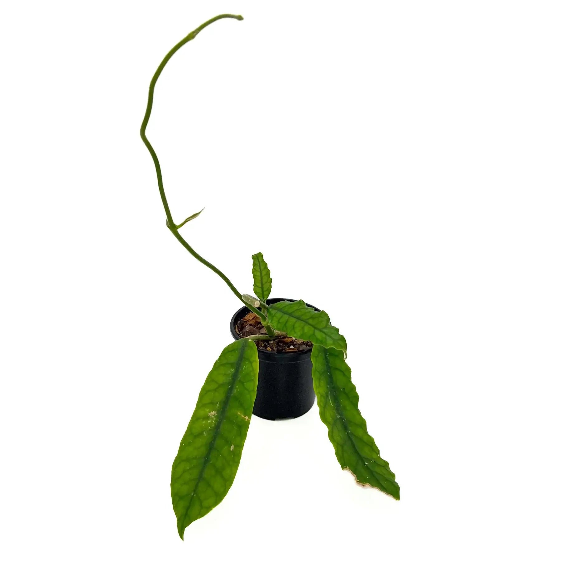The Hoya globulosa 'villosa' IML 0905 H117 features thick, velvety leaves with a suede-like texture, deep green colour, and distinctive indentations. When exposed to sunlight, it turns red. This Hoya produces clusters of fragrant, dusty-pink star-shaped flowers, each 13mm wide, with a hot pink-cantered pale pink corona. Up to 35 flowers per umbel emit a light, pleasant fragrance. Formerly known as sp. Welsh Mountain Zoo