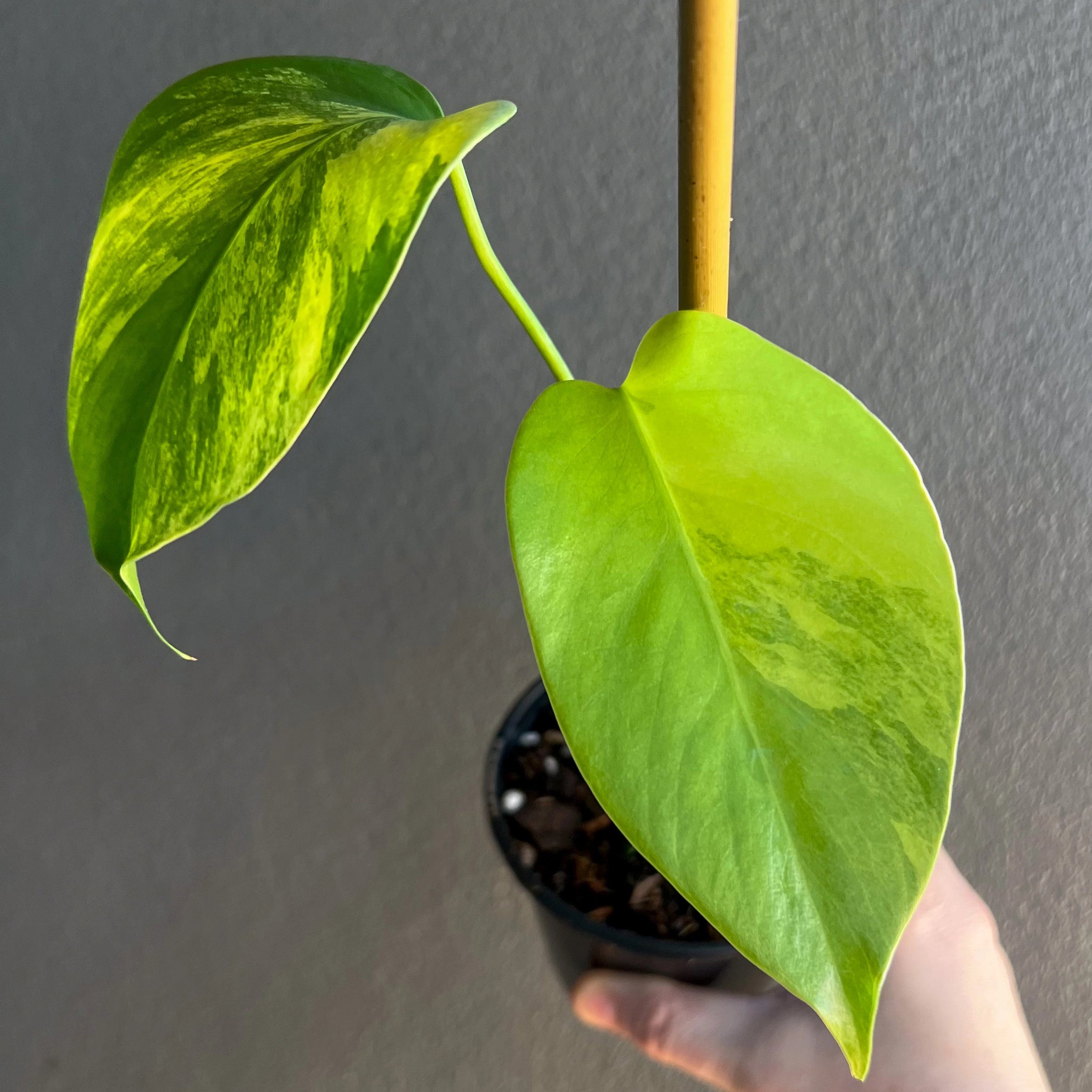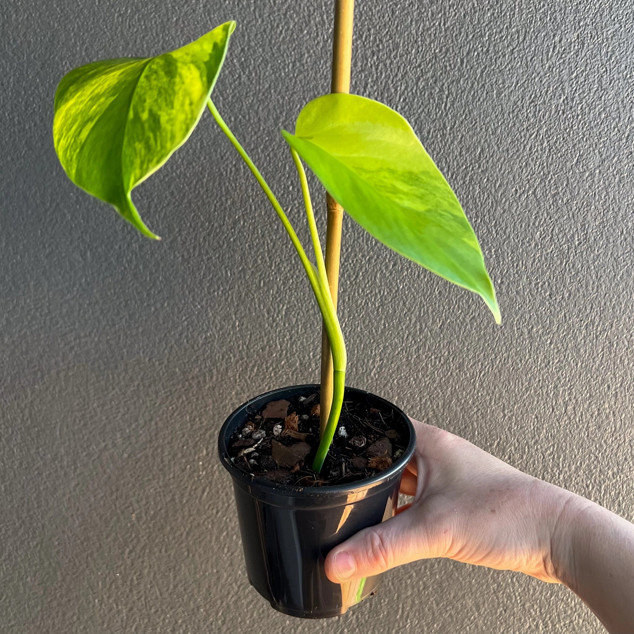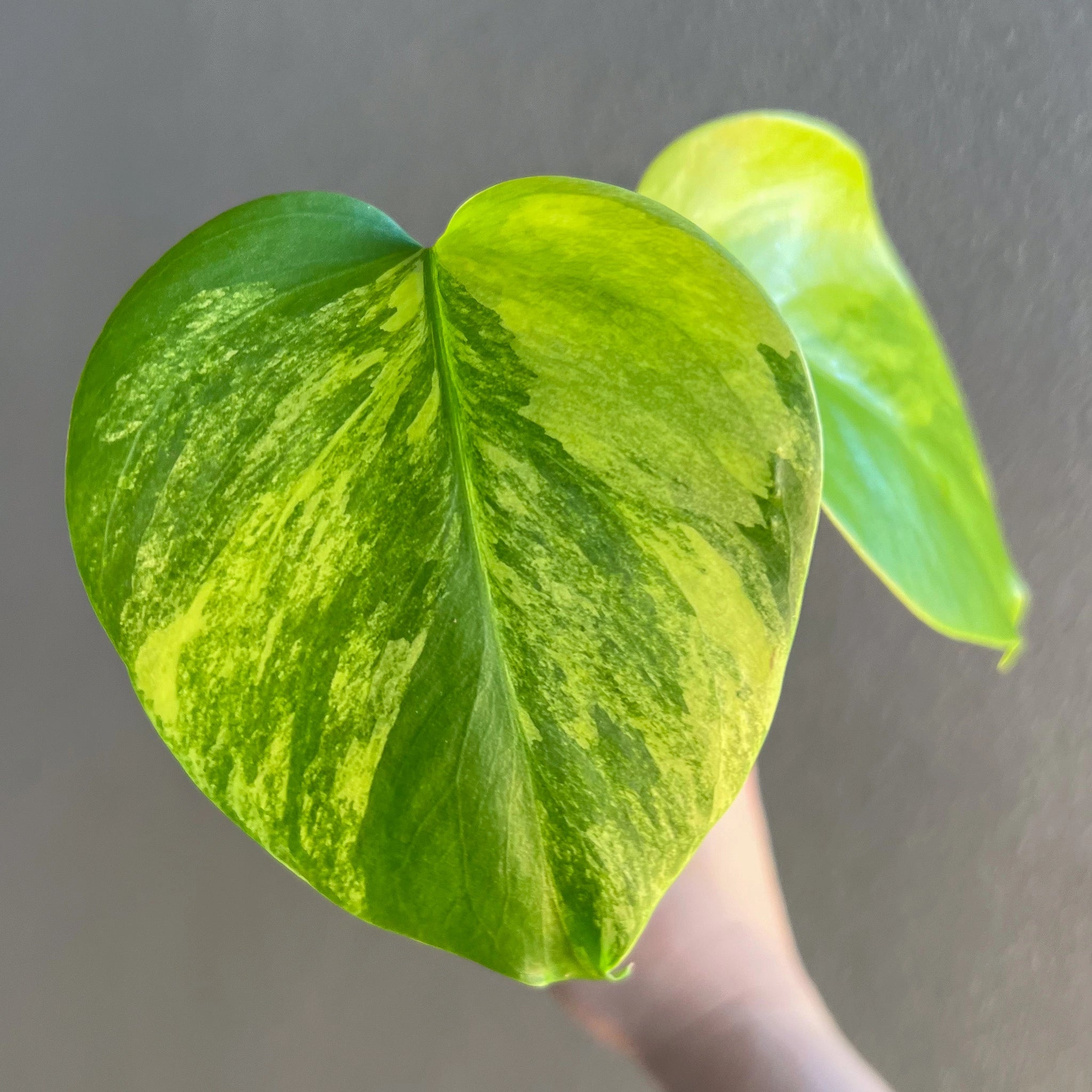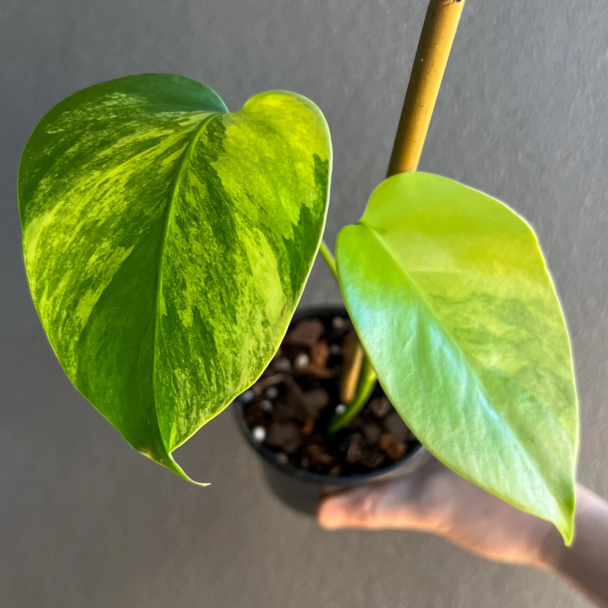 Due to the golden variegated leaves, the Monstera deliciosa borsigiana 'Aurea' Variegated is also known as the Golden Variegated Monstera. Compared to the Monstera deliciosa borsigiana 'Albo' variegated, 'Aureas' are known for their slightly slower growth rate and more delicate nature. This variety requires a higher level of care compared to the more common 'Albo' because its leaves are very prone to browning. They also require higher light to bring out the golden colouring on the leaves. When a new leaf unfurls, the initial variegation on the new leaves is a lighter green colour that gradually matures to a rich yellow or gold hue over approximately five to six weeks.