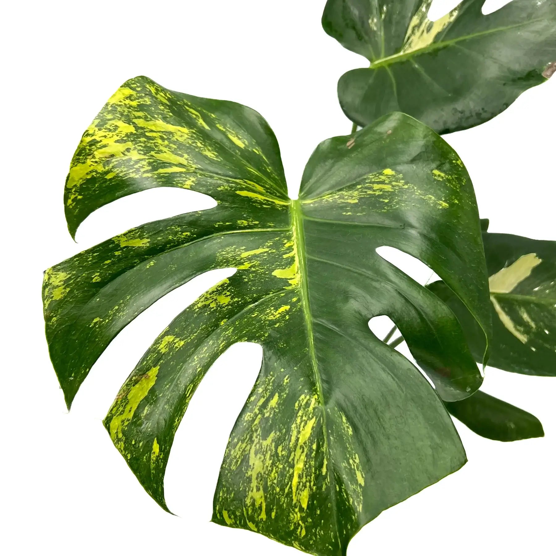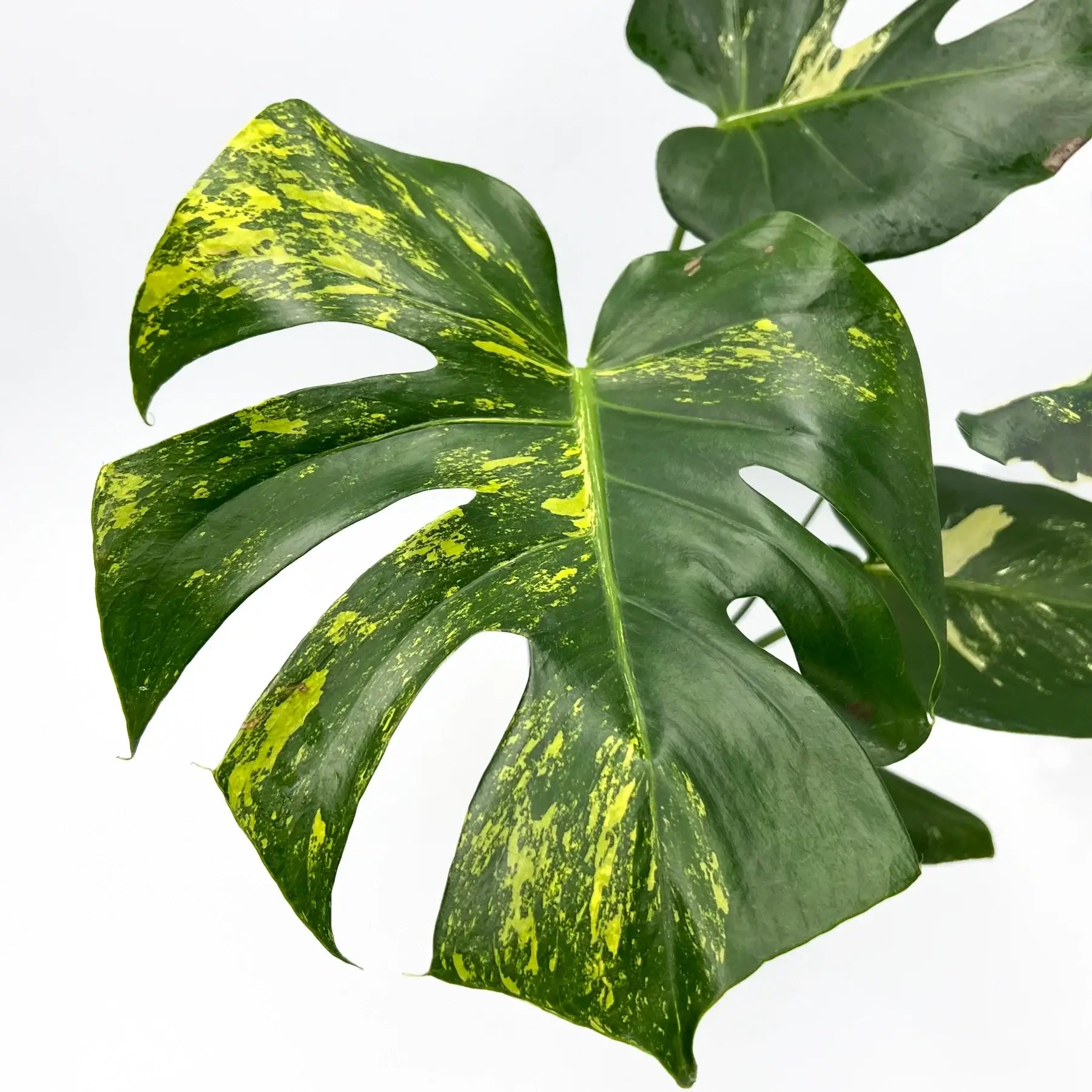 The Monstera deliciosa 'Yellow Thai' is a variation of the 'Thai Constellation,' known for its brighter yellow variegation. It features large, glossy green leaves with the characteristic fenestrations of the classic large Monstera deliciosa, also known as the Swiss Cheese Plant. The yellow variegation appears as irregular blocked areas, patches, and streaks, contrasting with the green background. Like the 'Thai Constellation,' the 'Yellow Thai' is a vigorous climber that can be trained onto moss poles. The yellow variegation results from a lack of chlorophyll in specific parts of the leaves, creating distinctive yellow colouration. This plant is known for its striking appearance and is highly sought after by collectors.