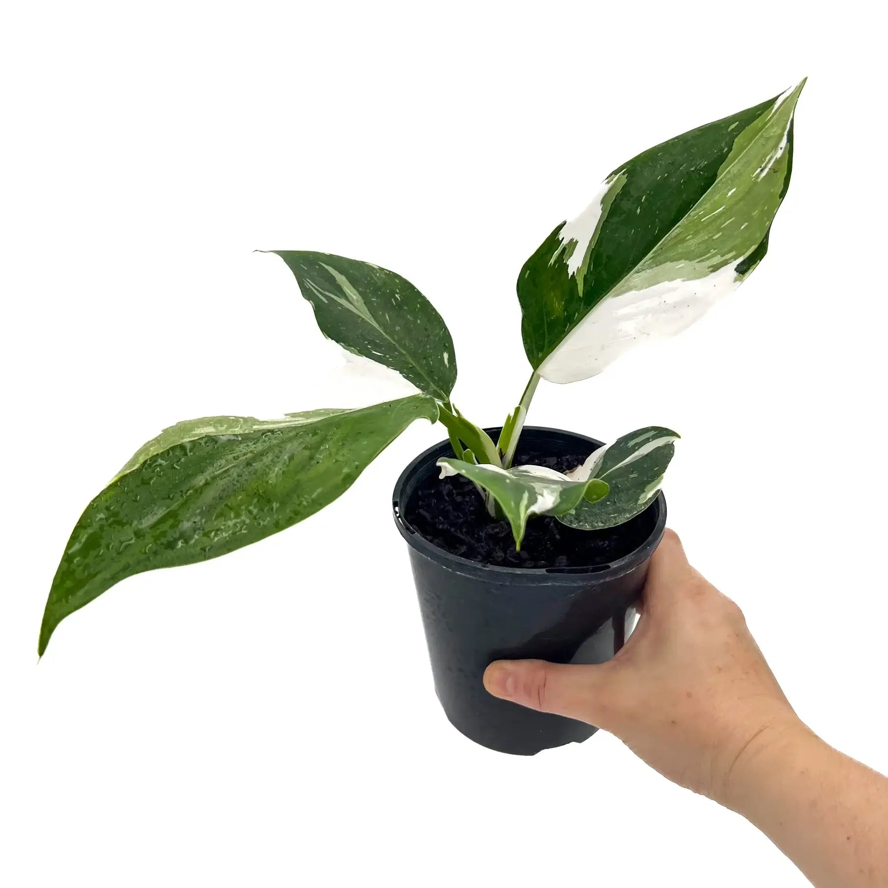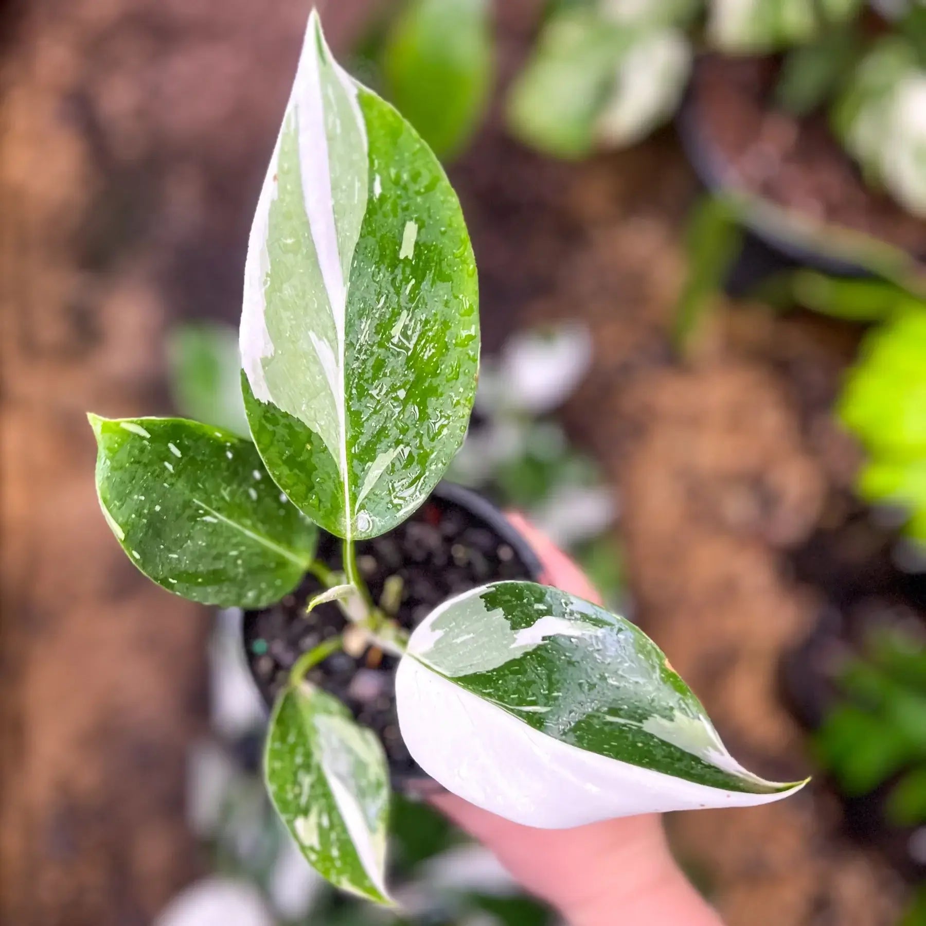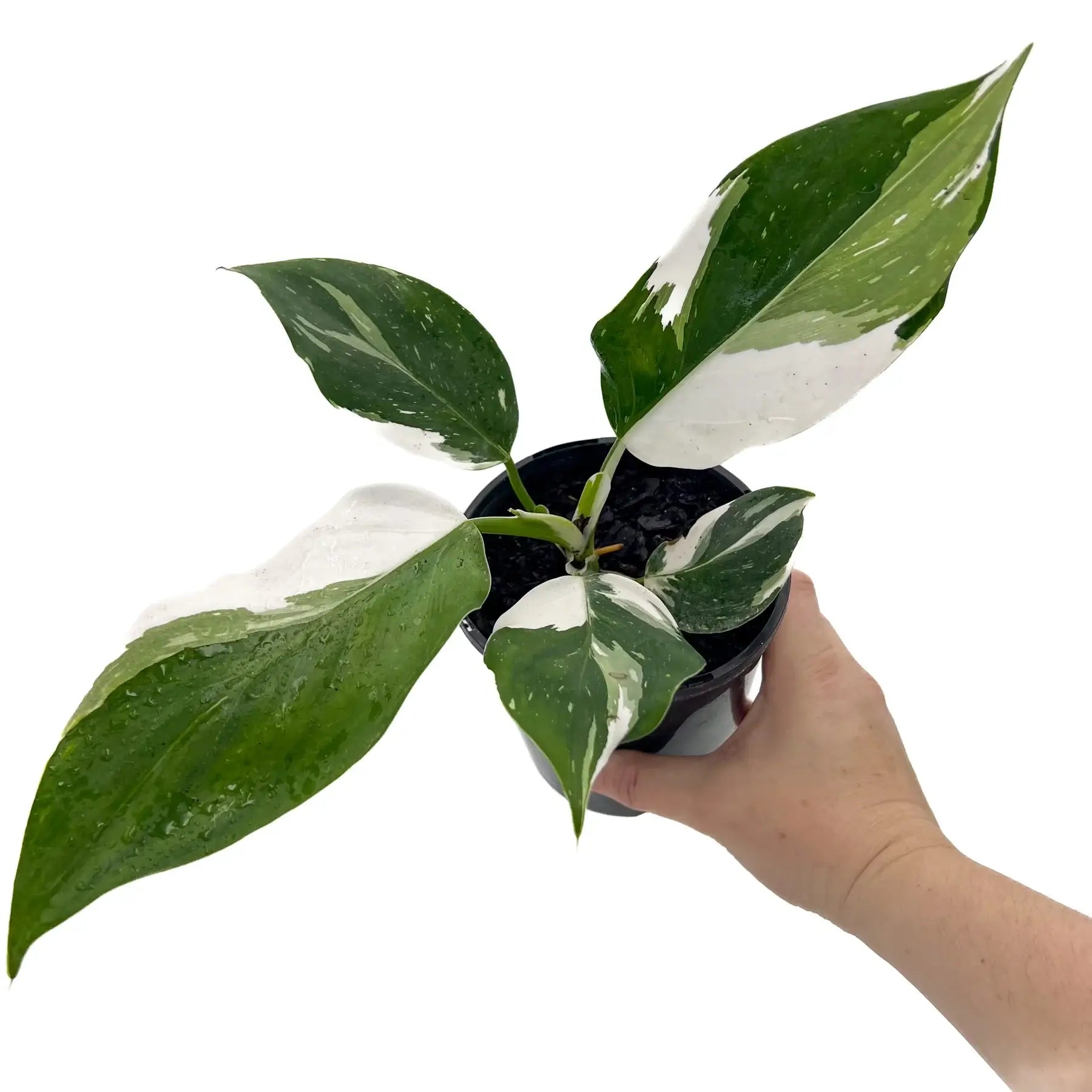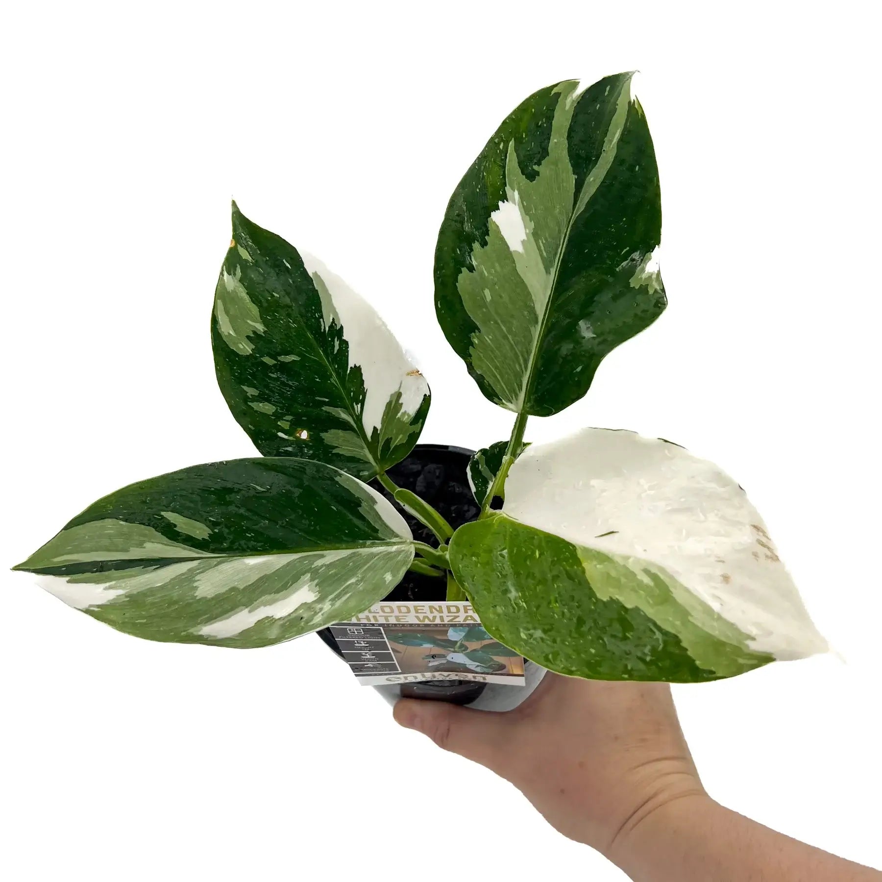 The Philodendron erubescens 'White Wizard' features heart-shaped, glossy leaves with striking white variegation against a deep green backdrop. The variegation can vary dramatically from light streaks to bold splashes. This climbing plant prefers bright, indirect light and well-draining soil to thrive. Support with a moss pols to grow up and showcase its gorgeous foliage.