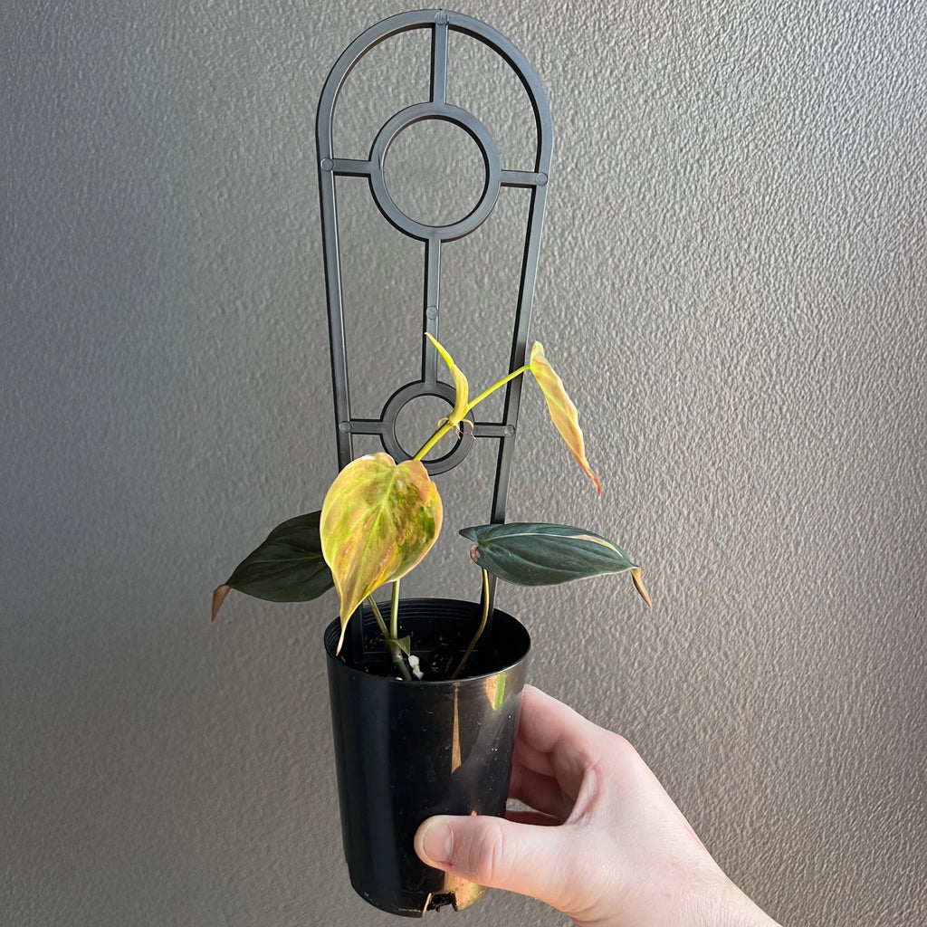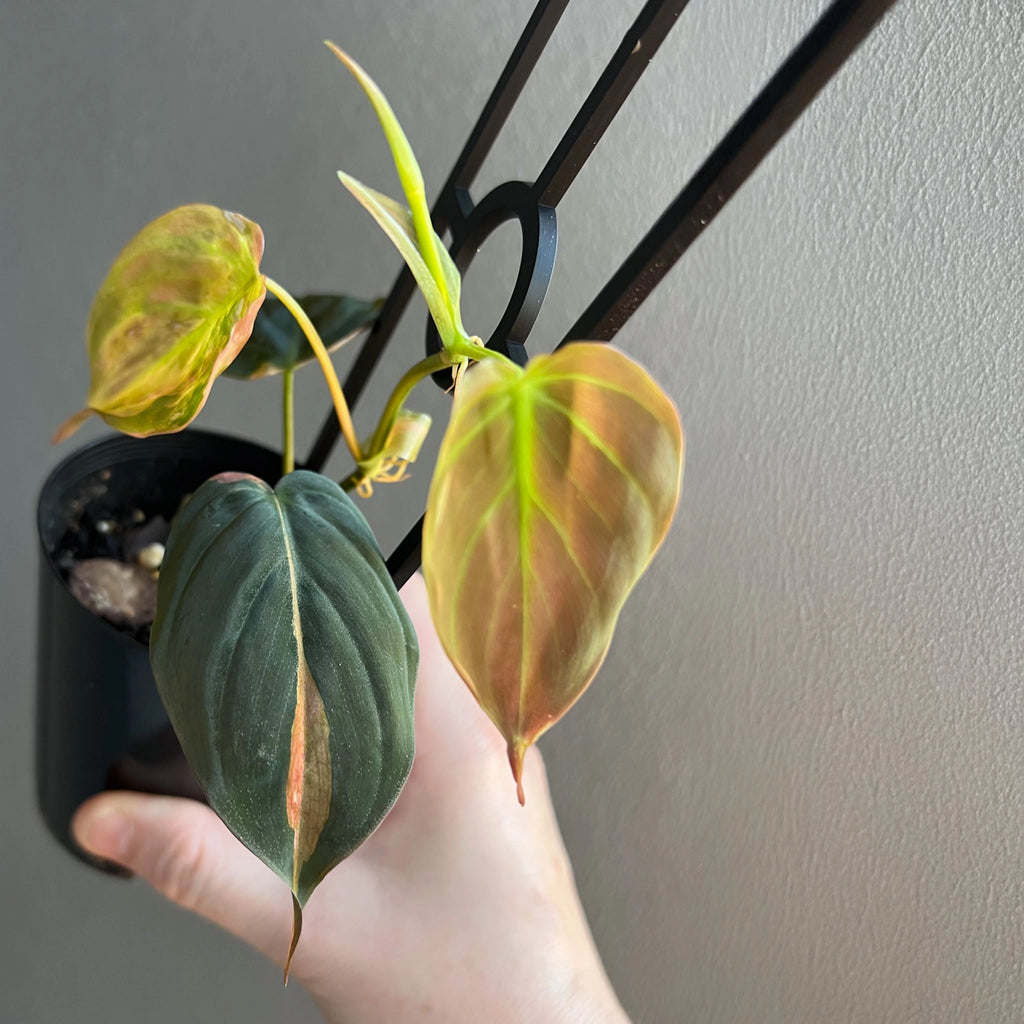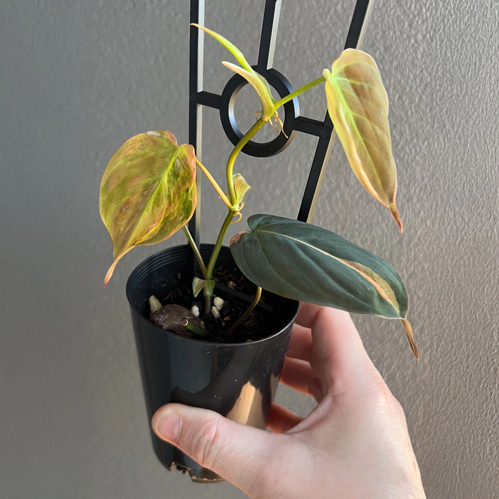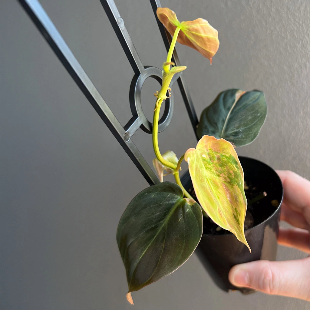 The Philodendron 'Micans' variegated, or the Philodendron hederaceum var. hederaceum 'Micans' variegated is also known as the Variegated Philodendron micans is a velvet-leaf Philodendron. A true collector’s plant with soft, heart-shaped foliage in shades of deep green, bronze, and burgundy, streaked with unpredictable patterns of cream, lime, or yellow variegation. The leaves have a plush, iridescent texture that catches the light beautifully. This variety can trail elegantly from a pot or be trained to climb, with new growth forming along slender vines that become more striking as the plant matures.