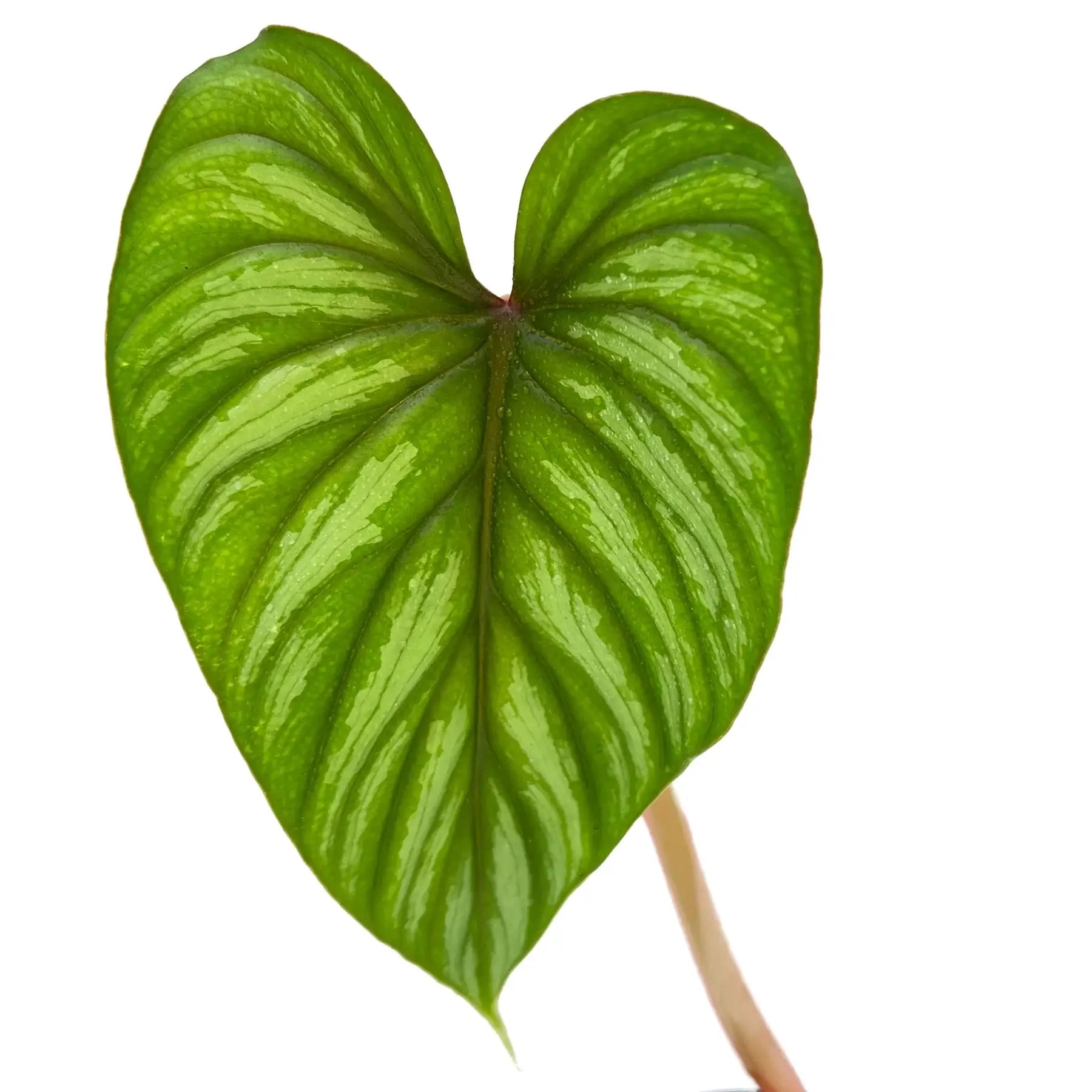 Philodendron plowmanii is a striking plant with large, heart-shaped to ovoid leaves that feature deep, quilted venation. The foliage is medium green with a slightly glossy surface and subtle variegation in grey-green shades. The leaf's underside has a semi-glossy finish with raised veins.