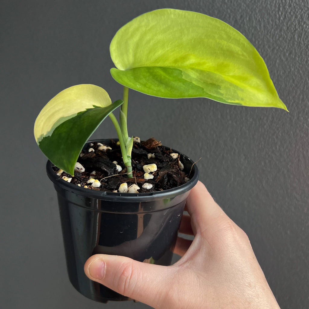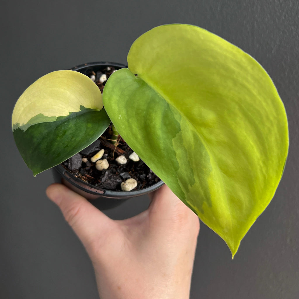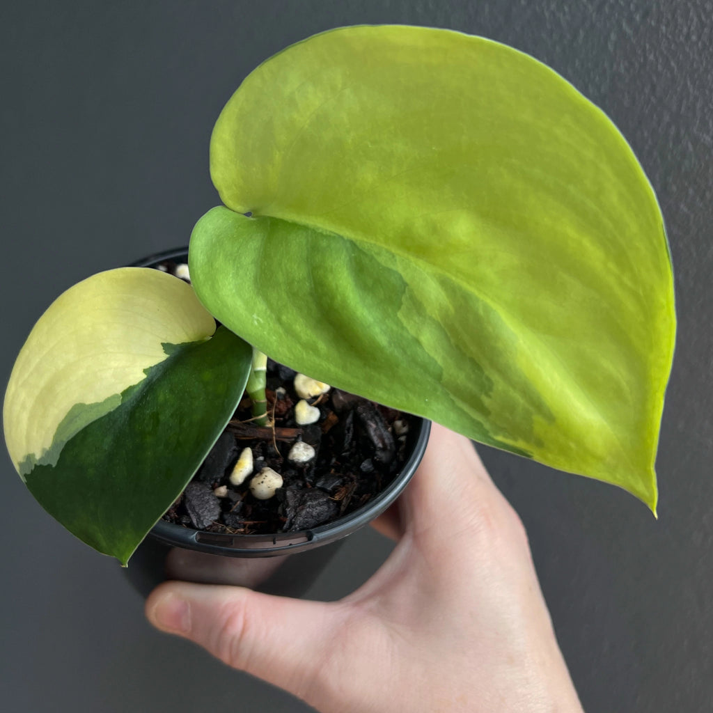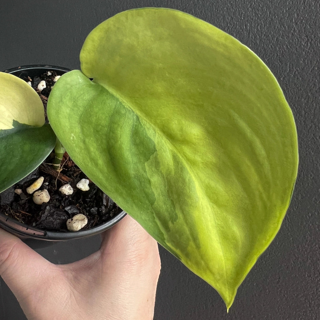 The Scindapsus pictus Jade Satin Aurea Variegated is an uncommon and stunning indoor plant known for its unique and striking foliage. The leaves are a jade green colour with a satin-like finish. Each leaf features variegated patterns of bright yellow and creamy white. The variegation can vary from subtle streaks to bold patches, making each leaf unique. The plant tends to have a trailing or climbing growth habit, making it perfect for hanging baskets or training on a trellis. Its lush, vibrant leaves add a touch of elegance and tropical beauty to any indoor space. They require bright indirect light to help brighten the yellow colour when the leaves unfurl.