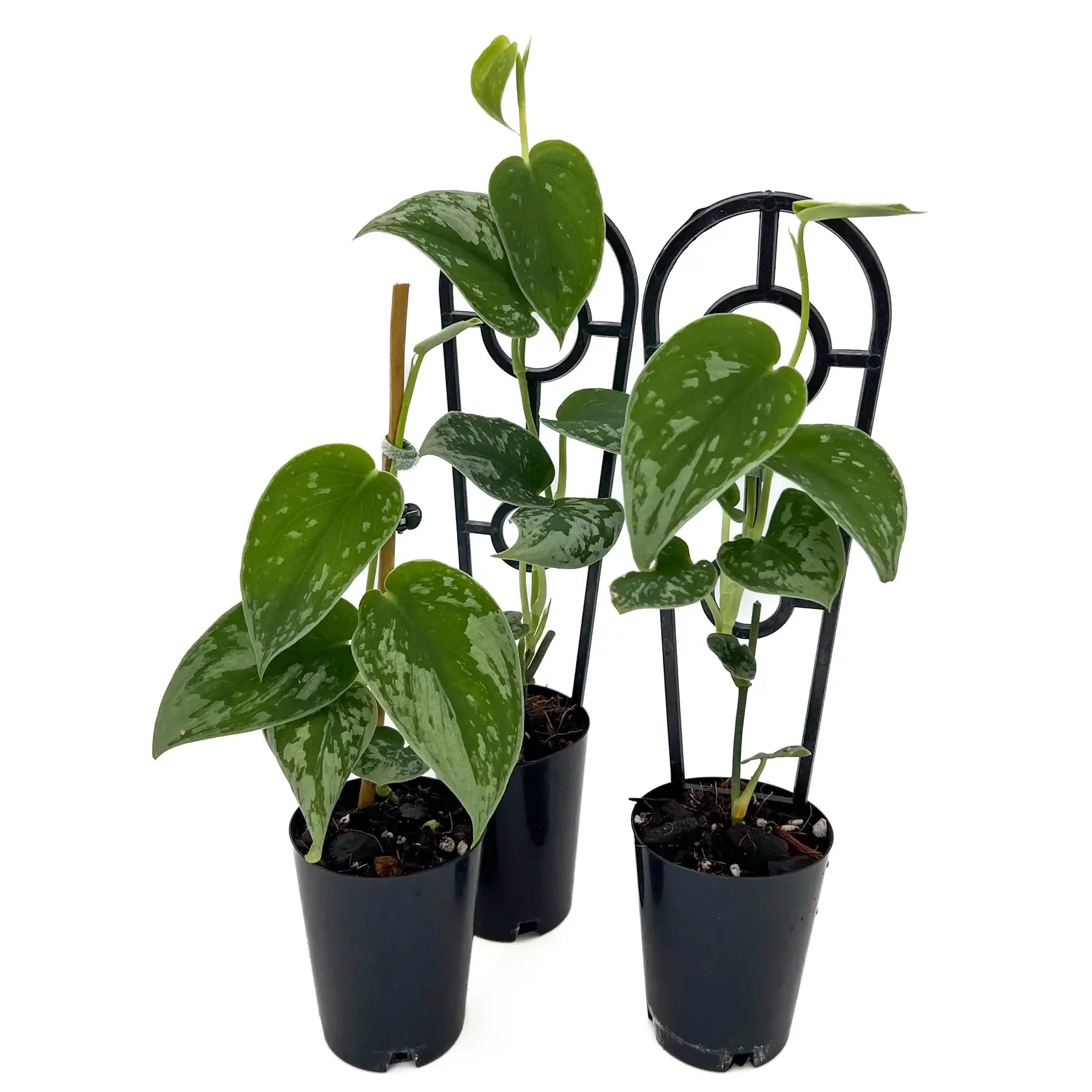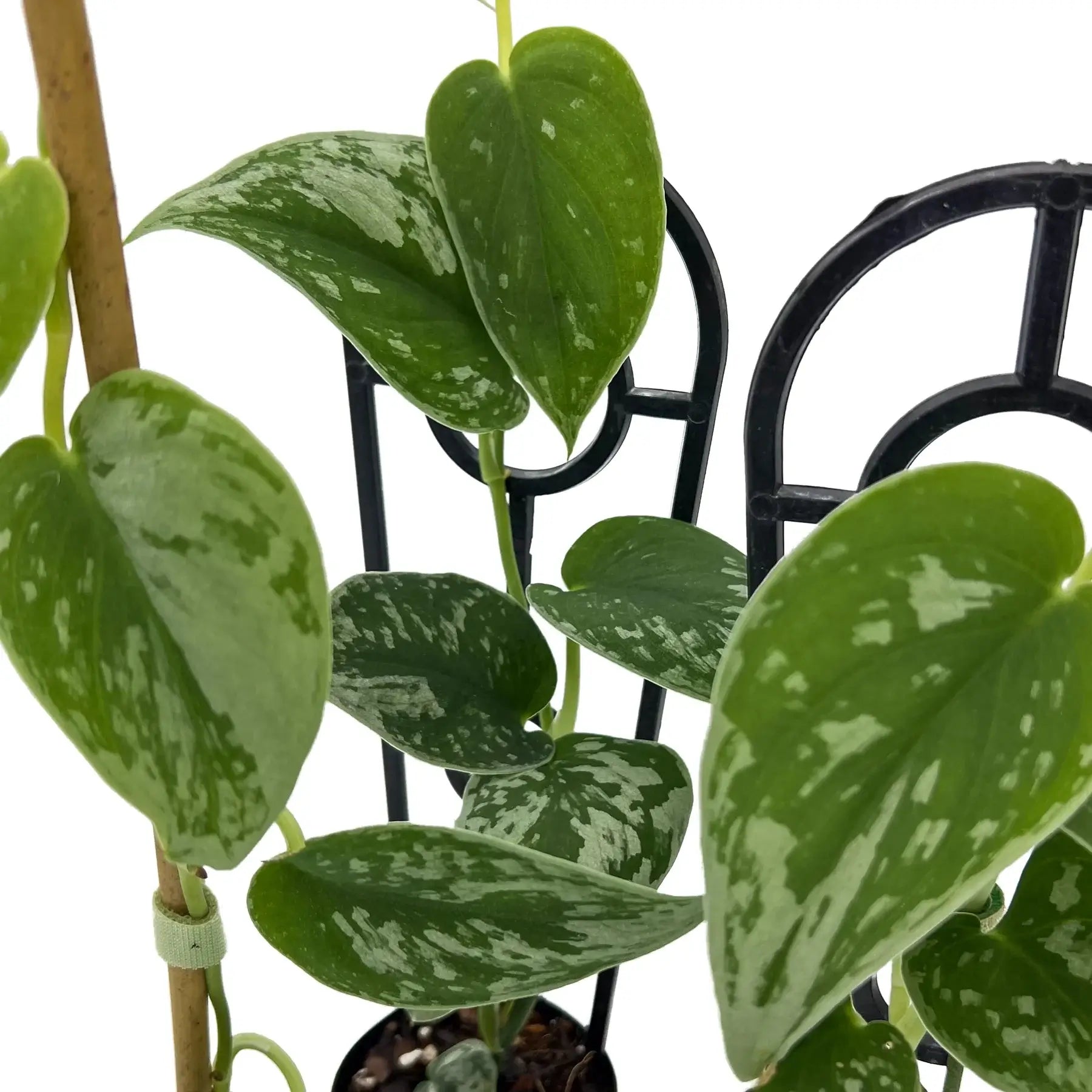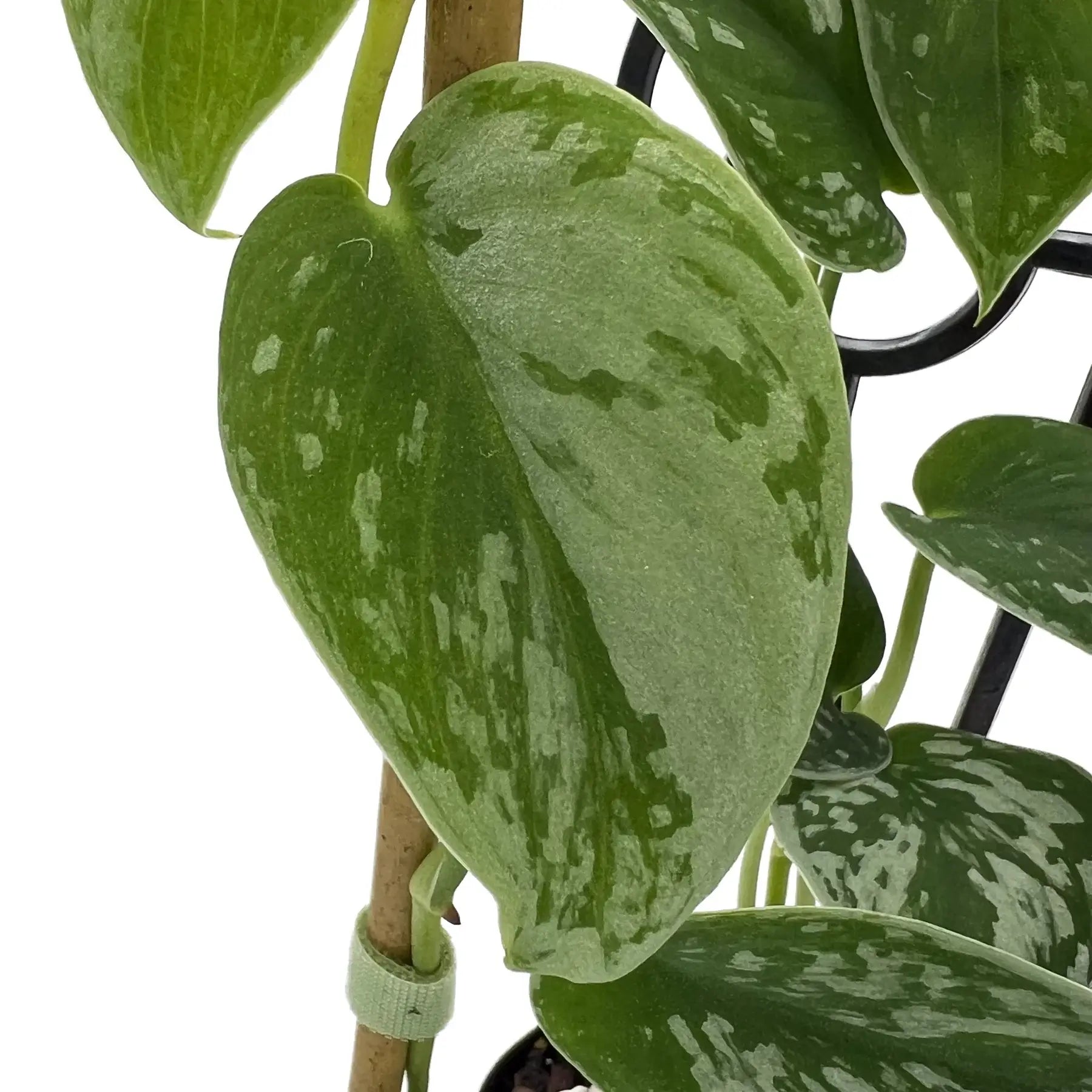 The Scindapsus pictus 'Silvery Ann' features heart-shaped leaves with a stunning silvery variegation. The dark green leaves are adorned with splashes and patches of silver, giving them a shimmering appearance. The leaves have a slightly velvety texture, and the plant's trailing vines make it an excellent choice for hanging baskets or as a climbing plant. This variety is known for its compact growth habit and striking foliage.
