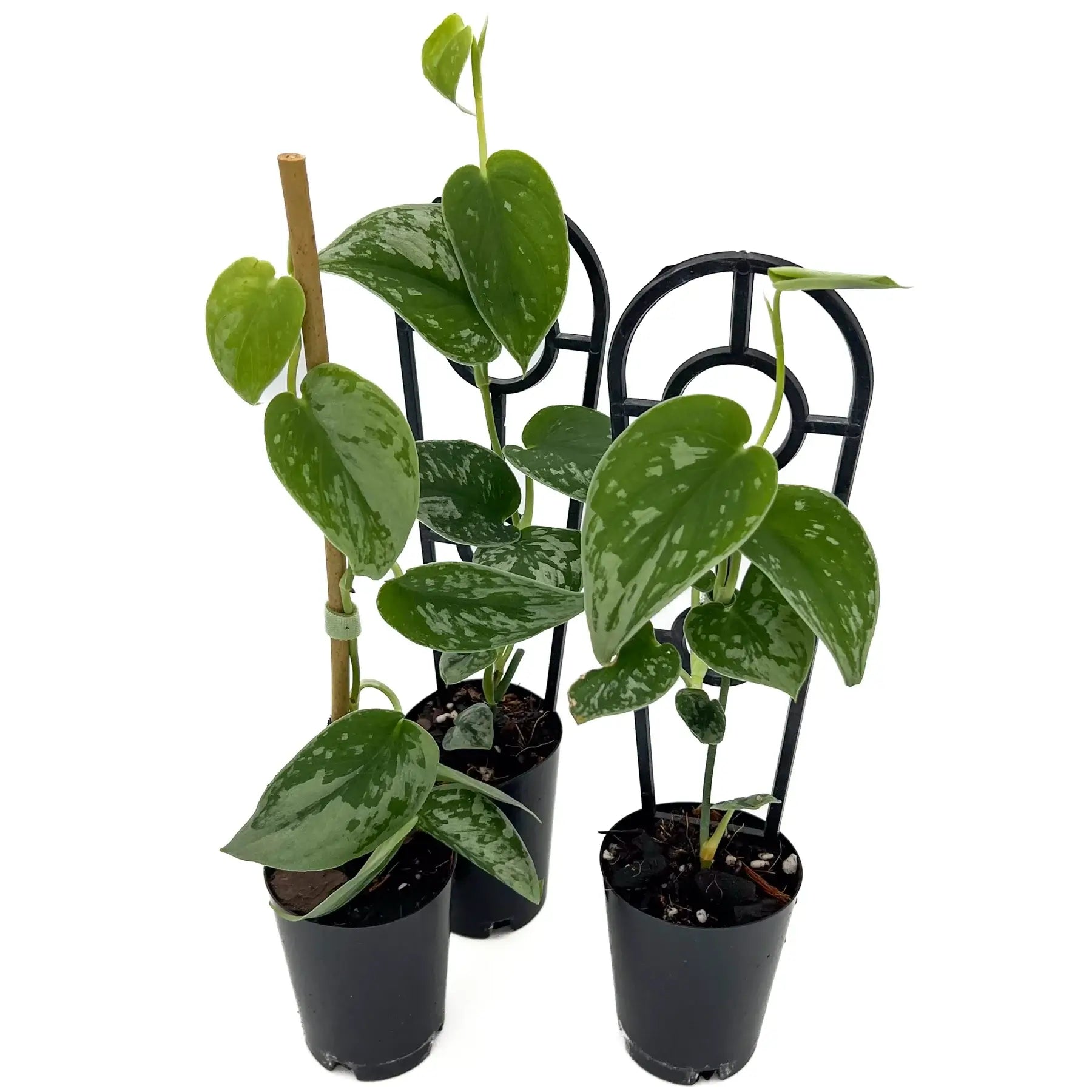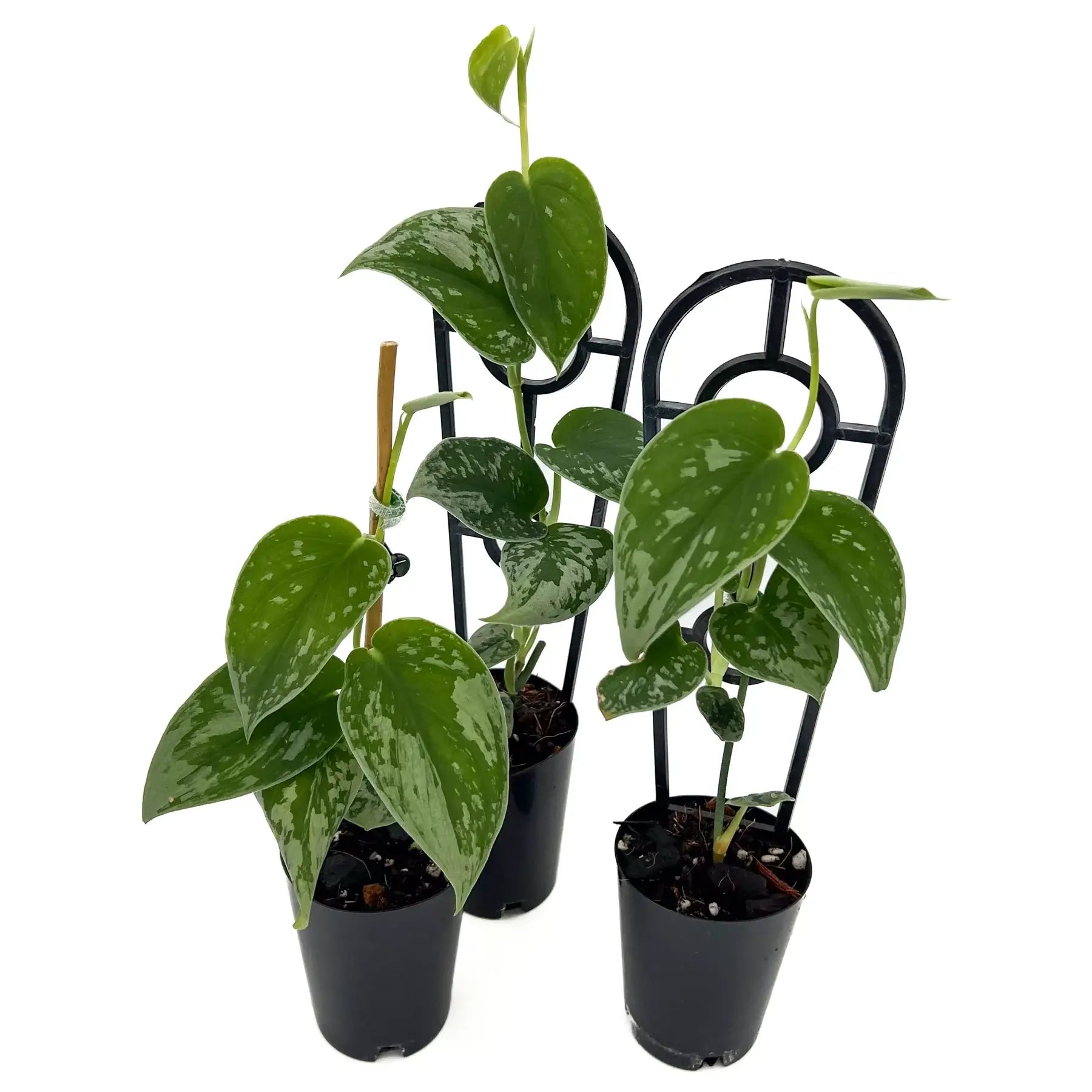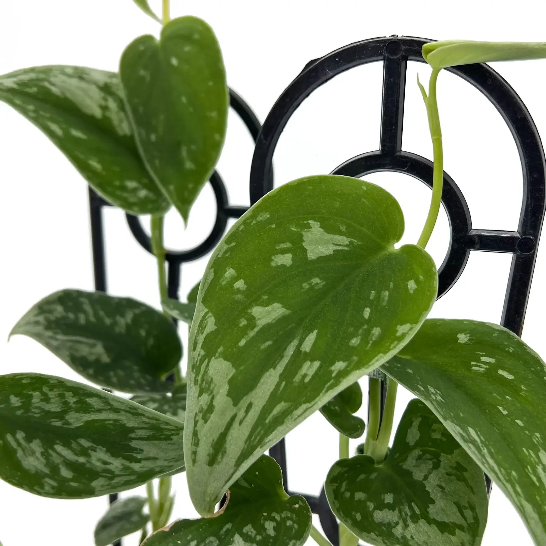 The Scindapsus pictus 'Silvery Ann' features heart-shaped leaves with a stunning silvery variegation. The dark green leaves are adorned with splashes and patches of silver, giving them a shimmering appearance. The leaves have a slightly velvety texture, and the plant's trailing vines make it an excellent choice for hanging baskets or as a climbing plant. This variety is known for its compact growth habit and striking foliage.