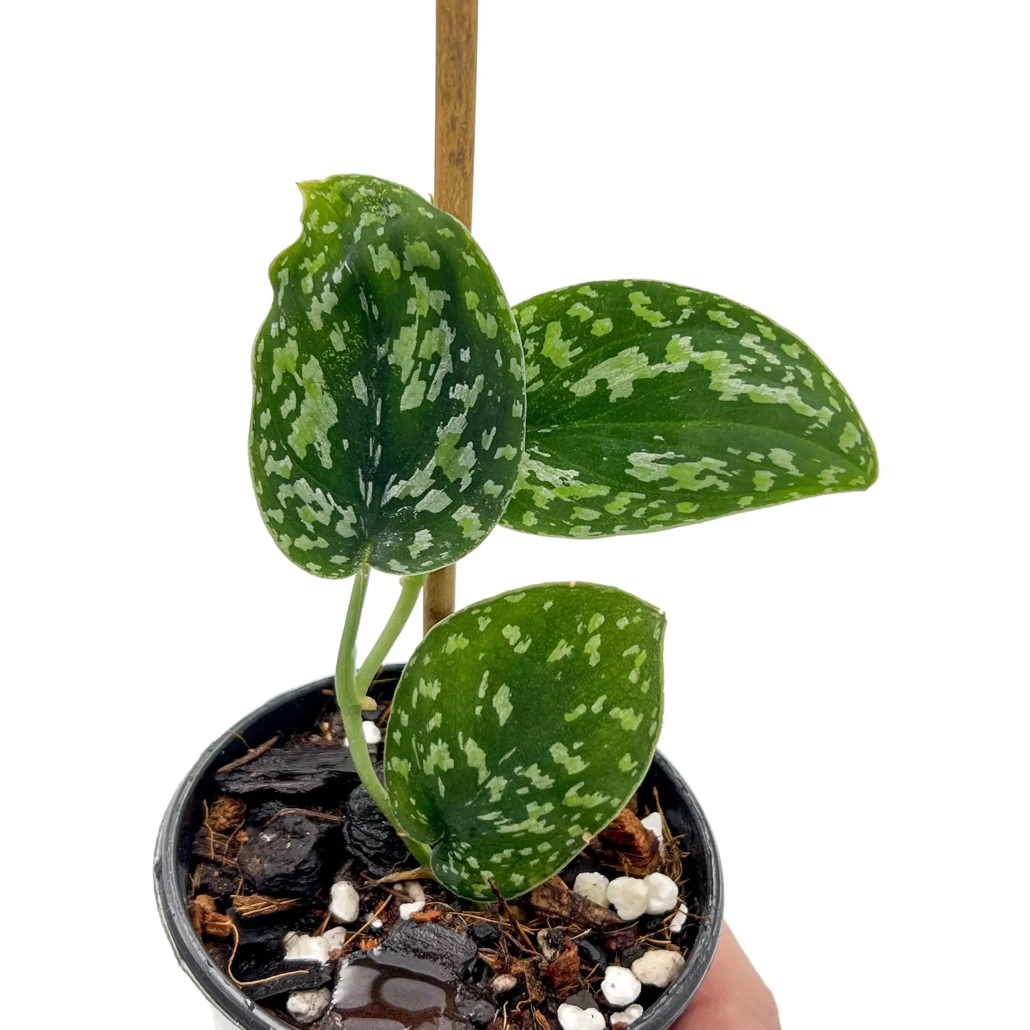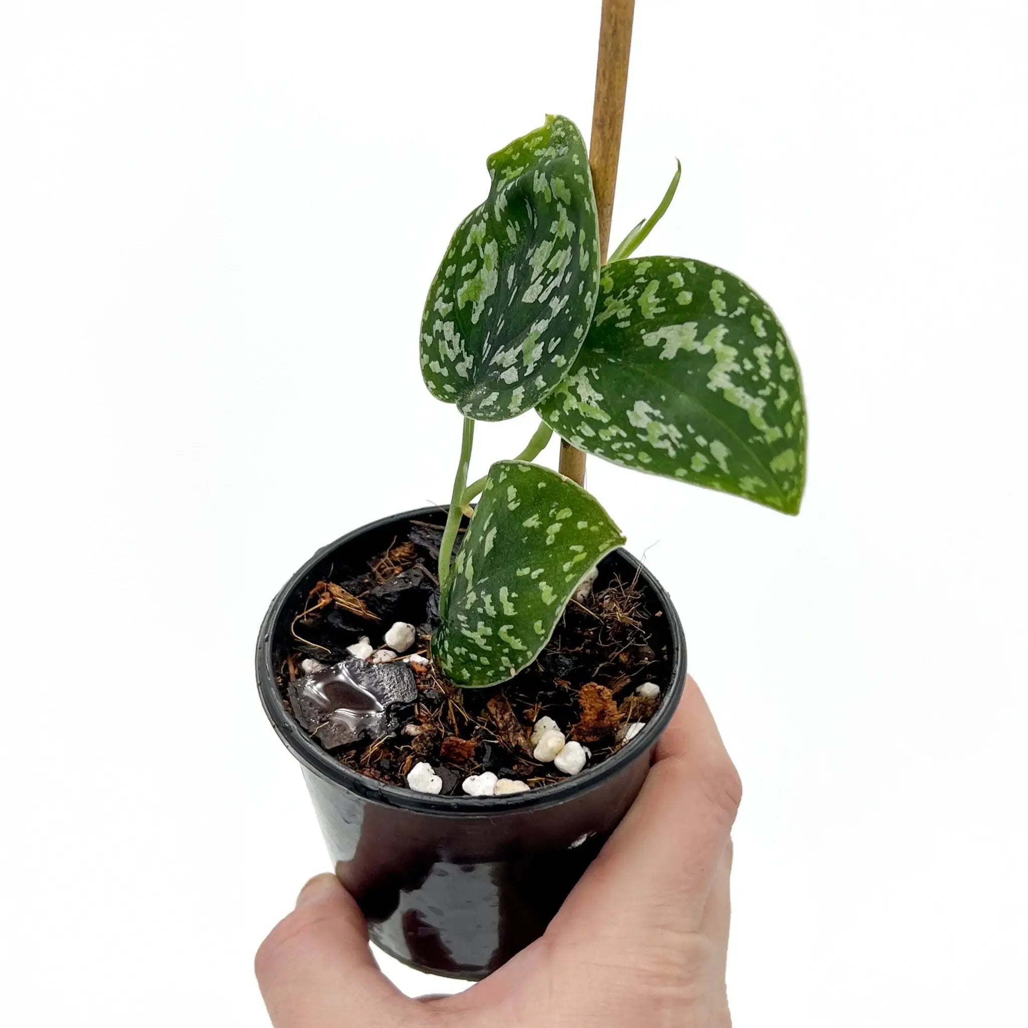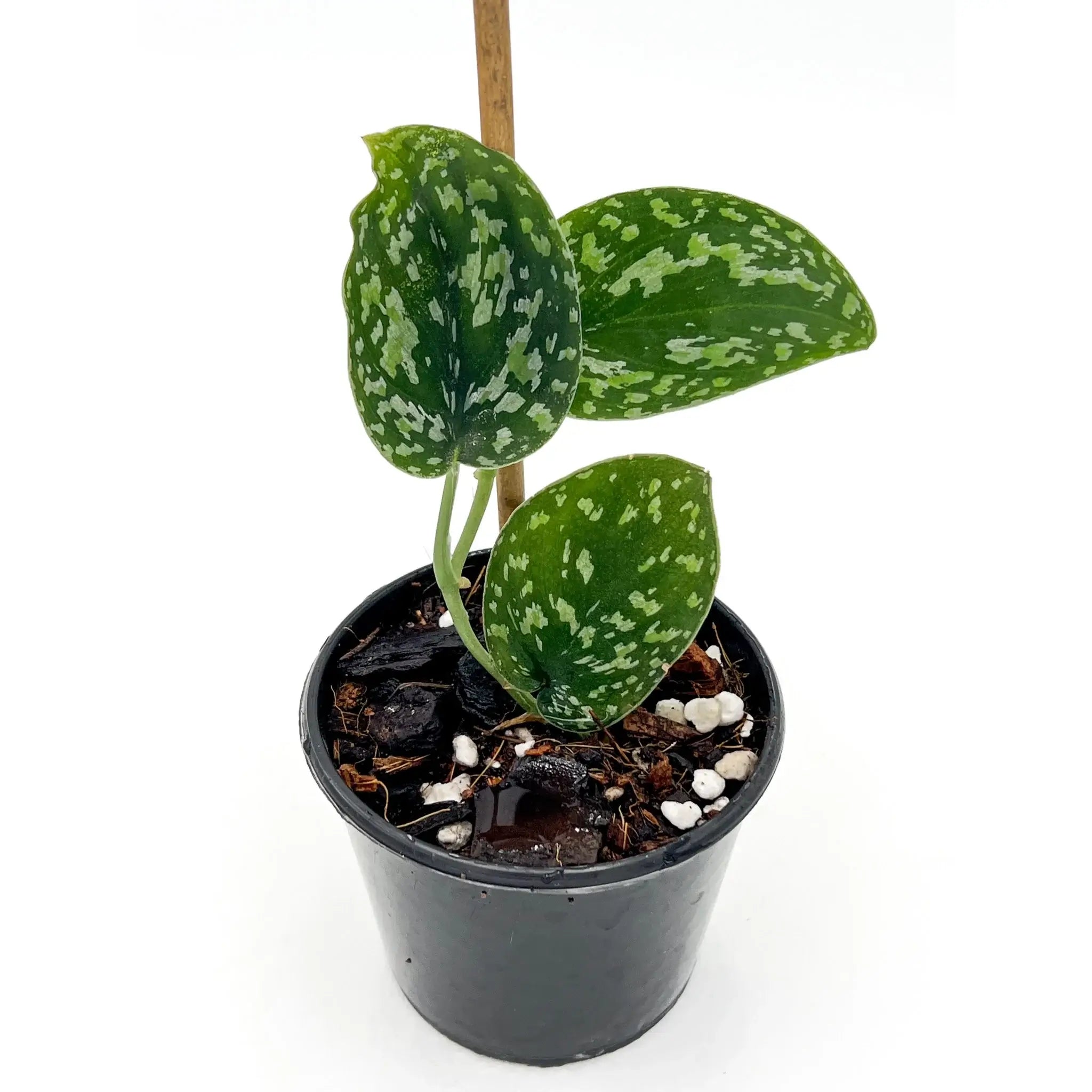 Scindapsus 'Snake Scale' variegated features thick, matte-textured leaves with an unusual scale-like pattern in silvery green on a deep emerald background. The variegation appears in the variegation with lighter green splashes. The foliage is broader and more defined than a typical pictus, with a subtle shimmer when mature. This climbing or trailing species grows along a thick vine, making it ideal for totems, cabinets, or baskets. Each leaf develops more intricate markings over time, giving it serious collector appeal.