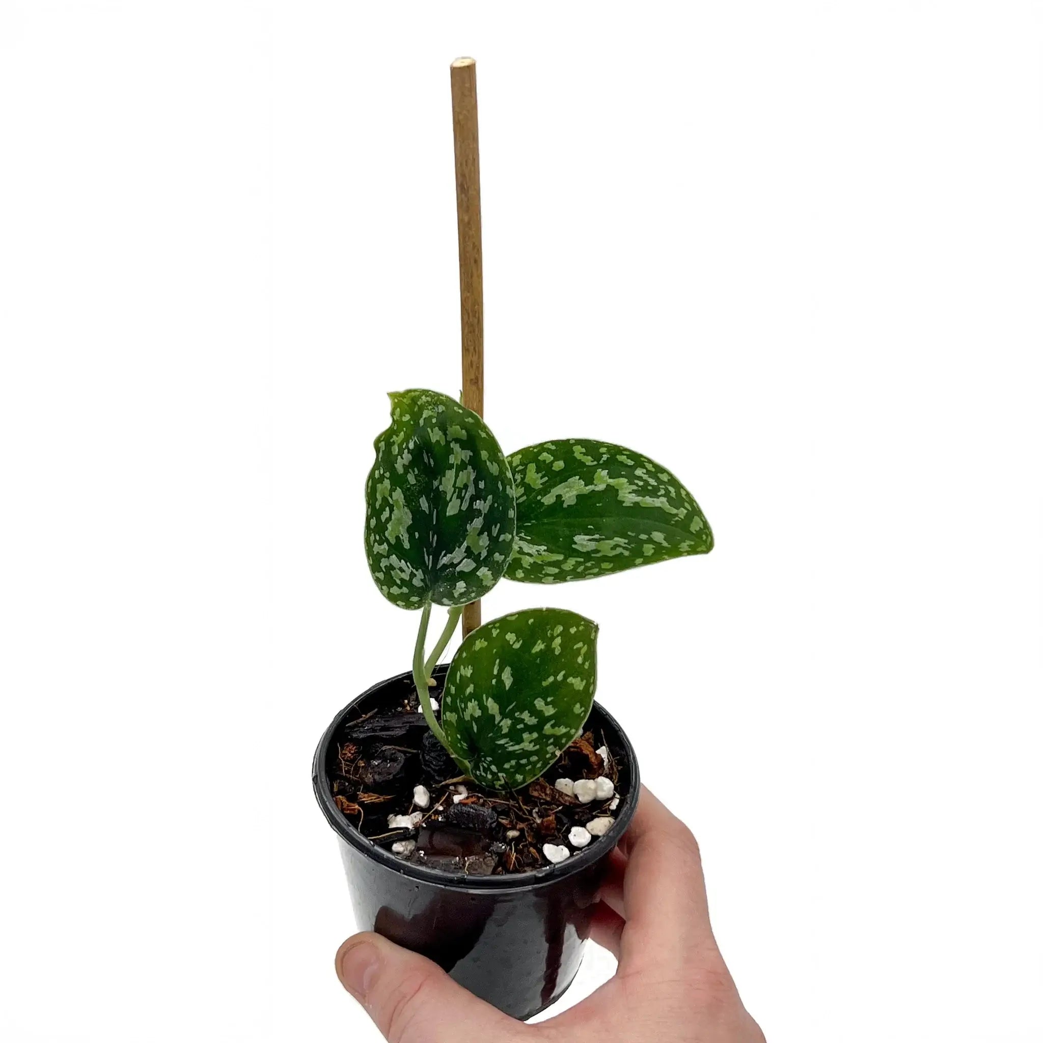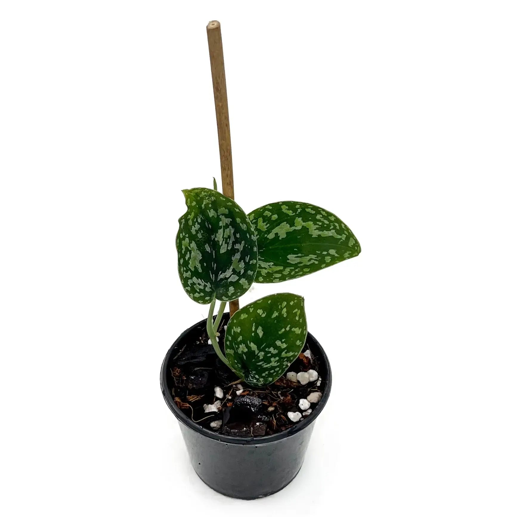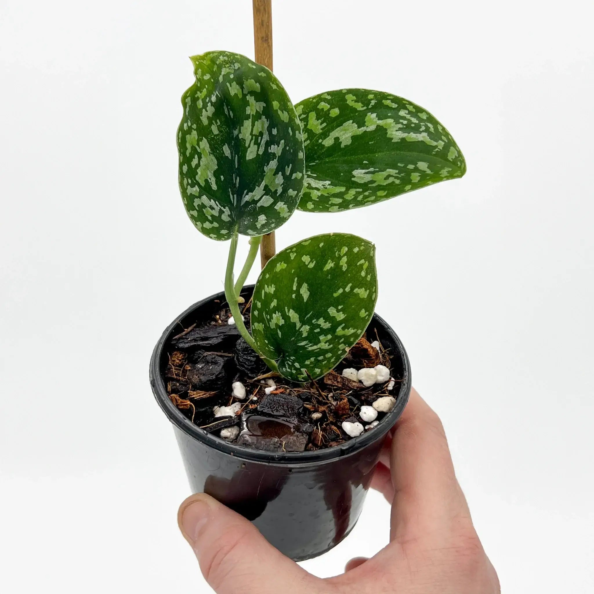 Scindapsus 'Snake Scale' variegated features thick, matte-textured leaves with an unusual scale-like pattern in silvery green on a deep emerald background. The variegation appears in the variegation with lighter green splashes. The foliage is broader and more defined than a typical pictus, with a subtle shimmer when mature. This climbing or trailing species grows along a thick vine, making it ideal for totems, cabinets, or baskets. Each leaf develops more intricate markings over time, giving it serious collector appeal.