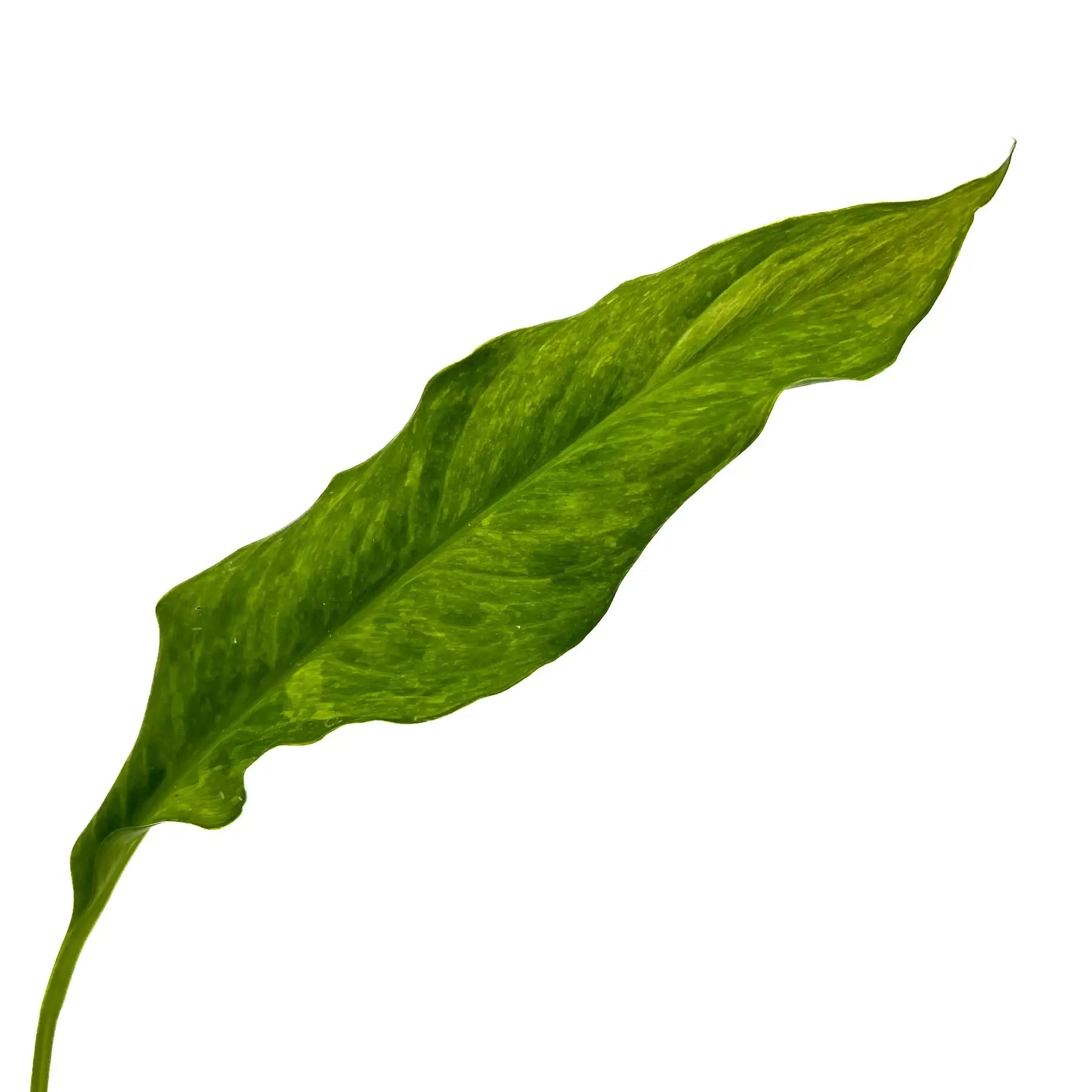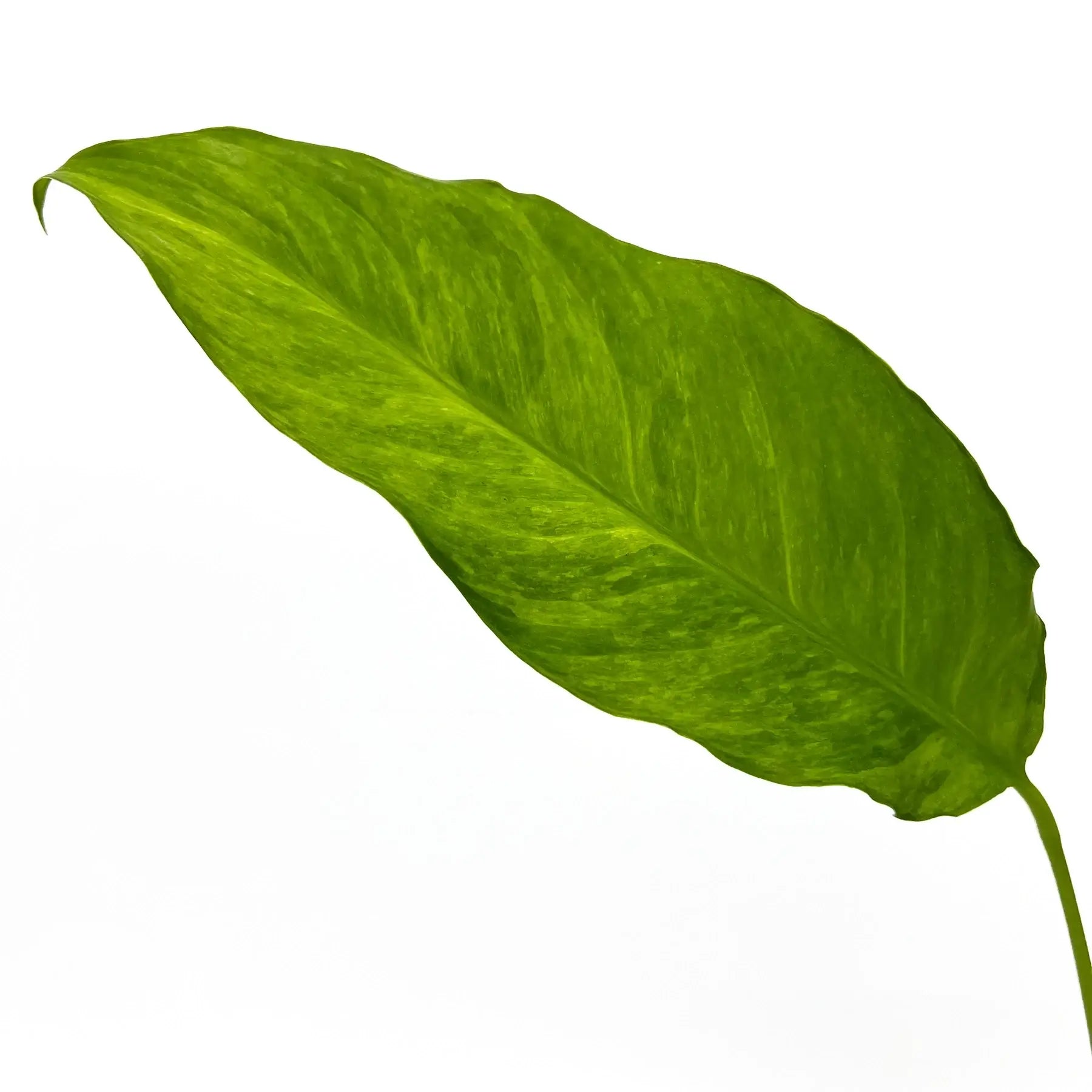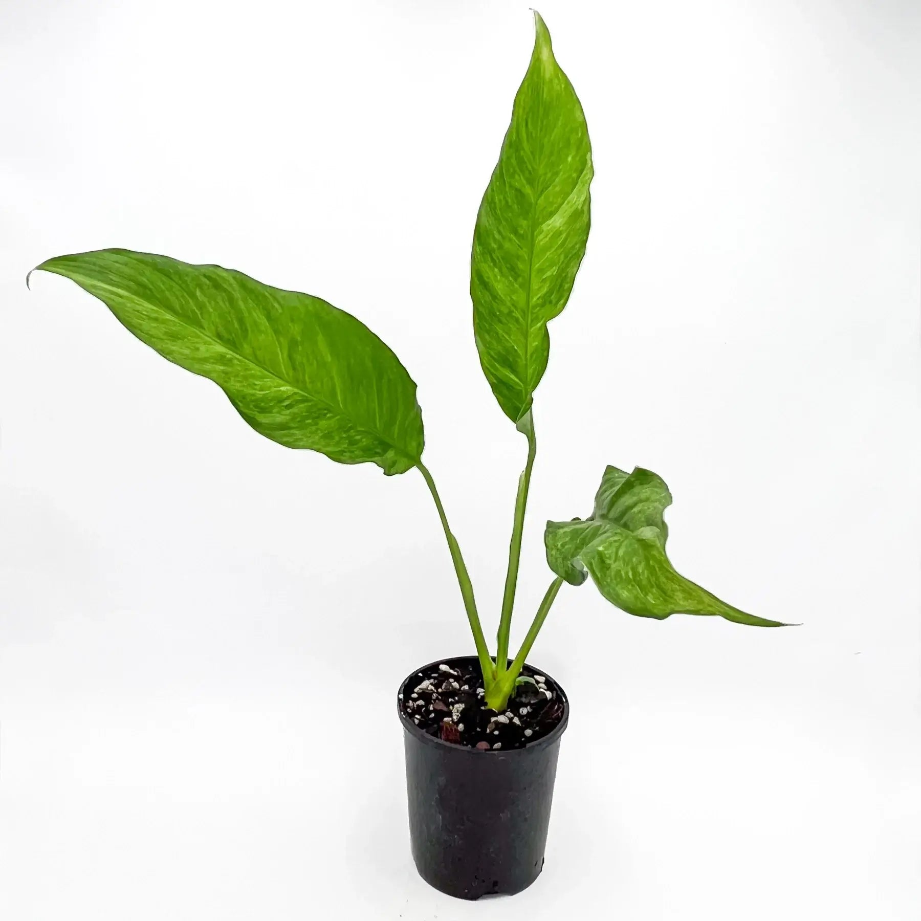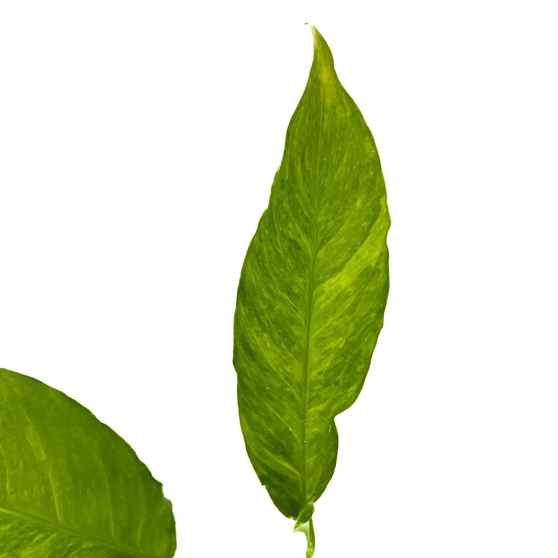 The Spathiphyllum Alpha Variegated, or Variegated Peace Lily, is an easy-to-grow houseplant with large, dark green leaves and stunning, long-lasting white flowers. Known for its excellent air-purifying qualities, this plant also features lovely, subtle, variegated splashes of yellow on its bright green leaves. Keep it in a brighter position with indirect light to encourage the yellow to brighten.