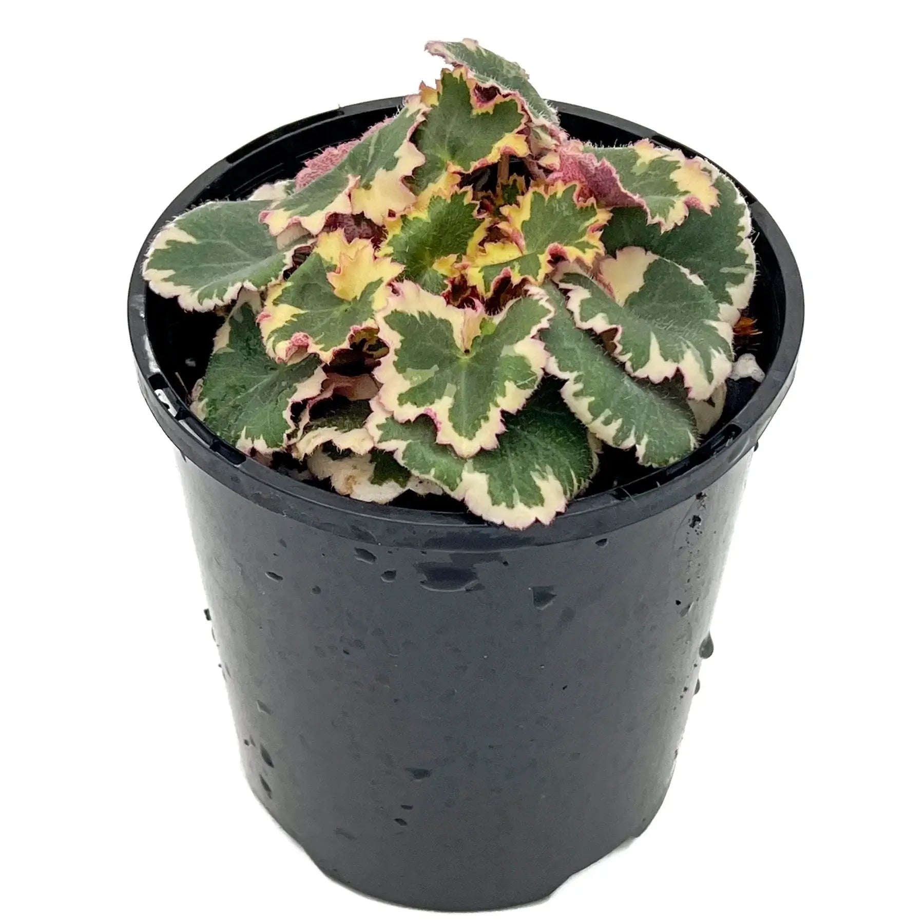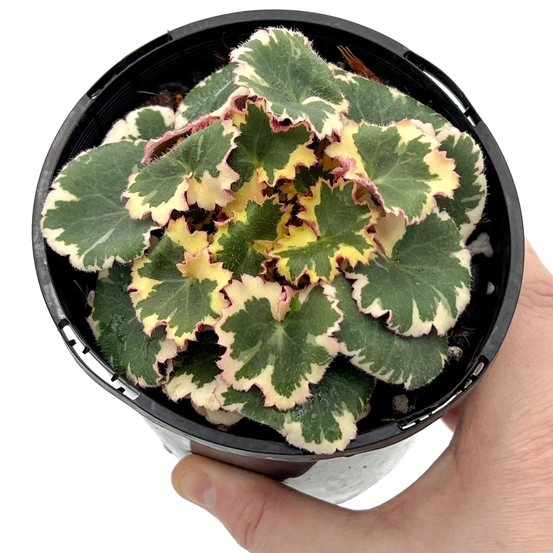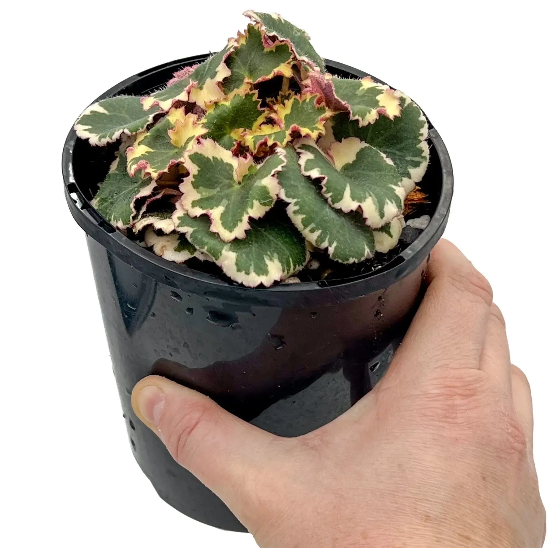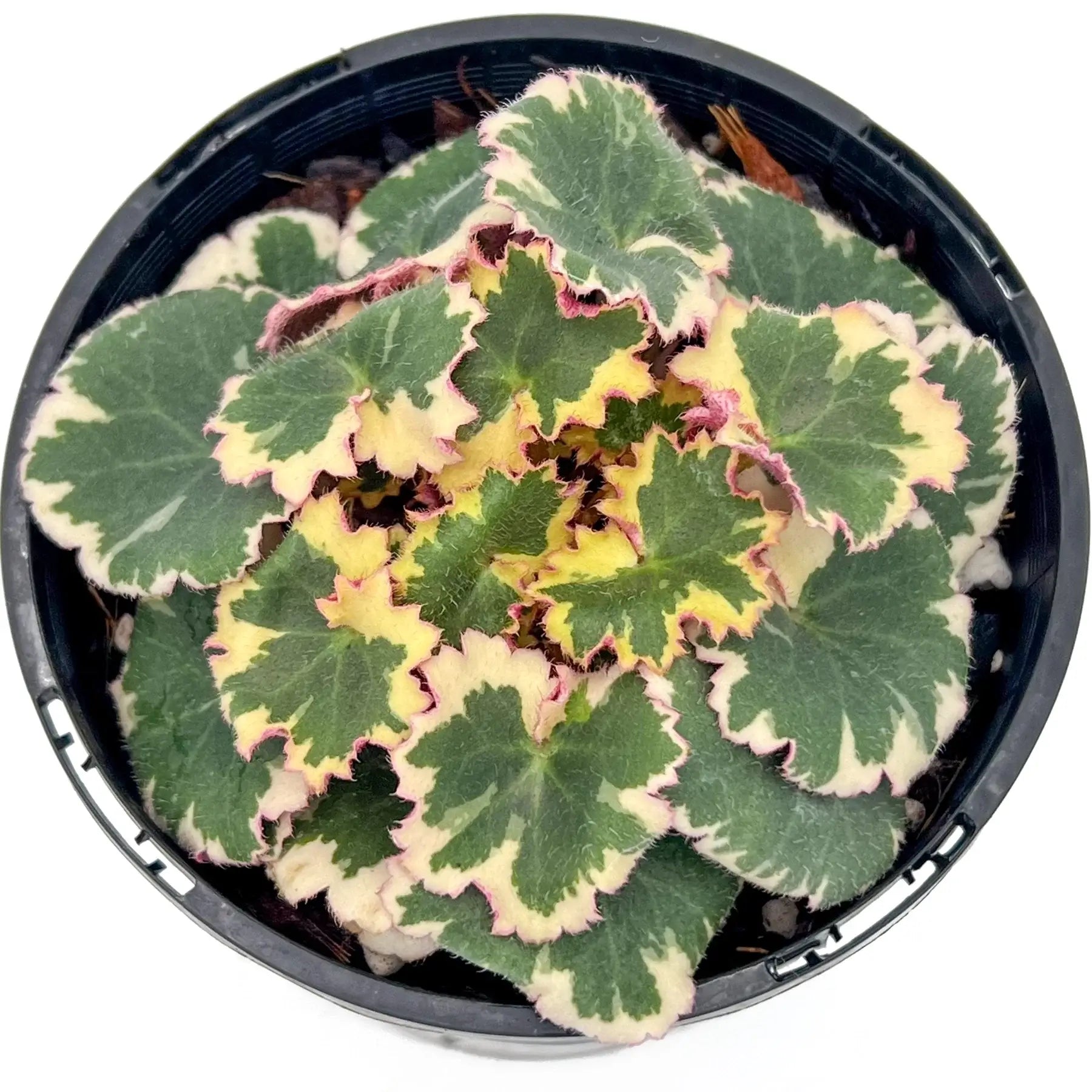 The Saxifraga Stolonifera 'Variegata', also known as the Strawberry Begonia Variegated, features striking green leaves edged with white and pink, adding a beautiful touch to any indoor space. This easy-care plant thrives in moderate light and well-draining soil. Its trailing habit is ideal for hanging baskets or cascading from shelves, providing a graceful display. With proper care, this unique plant will reward you with its vibrant variegation and distinctive foliage.