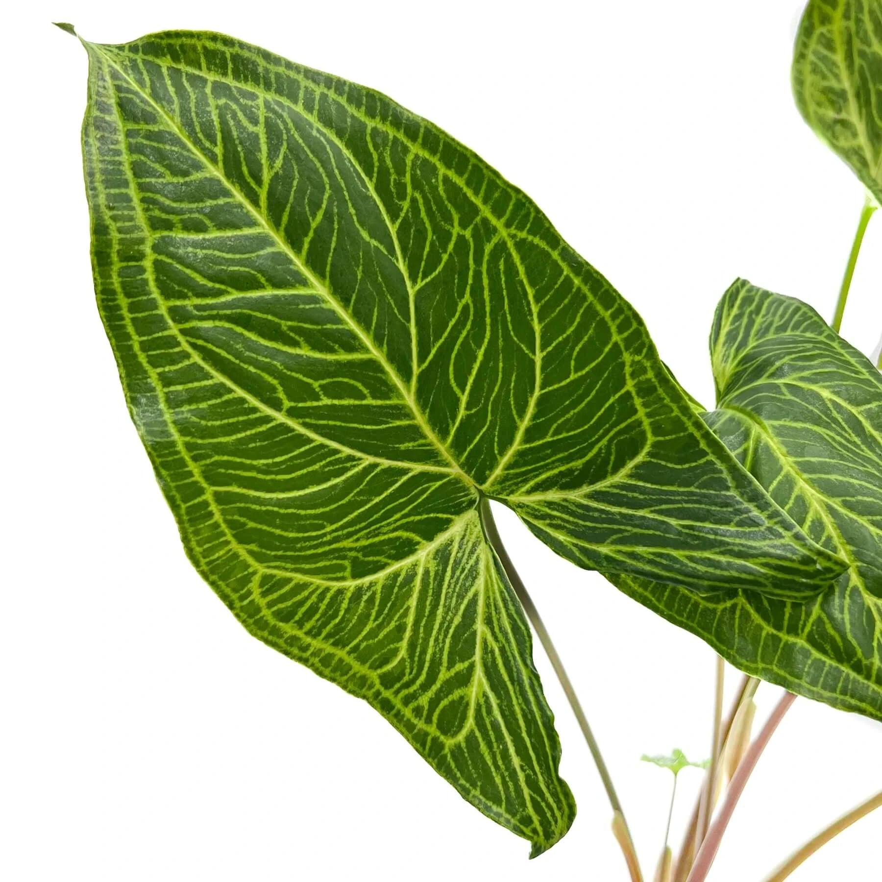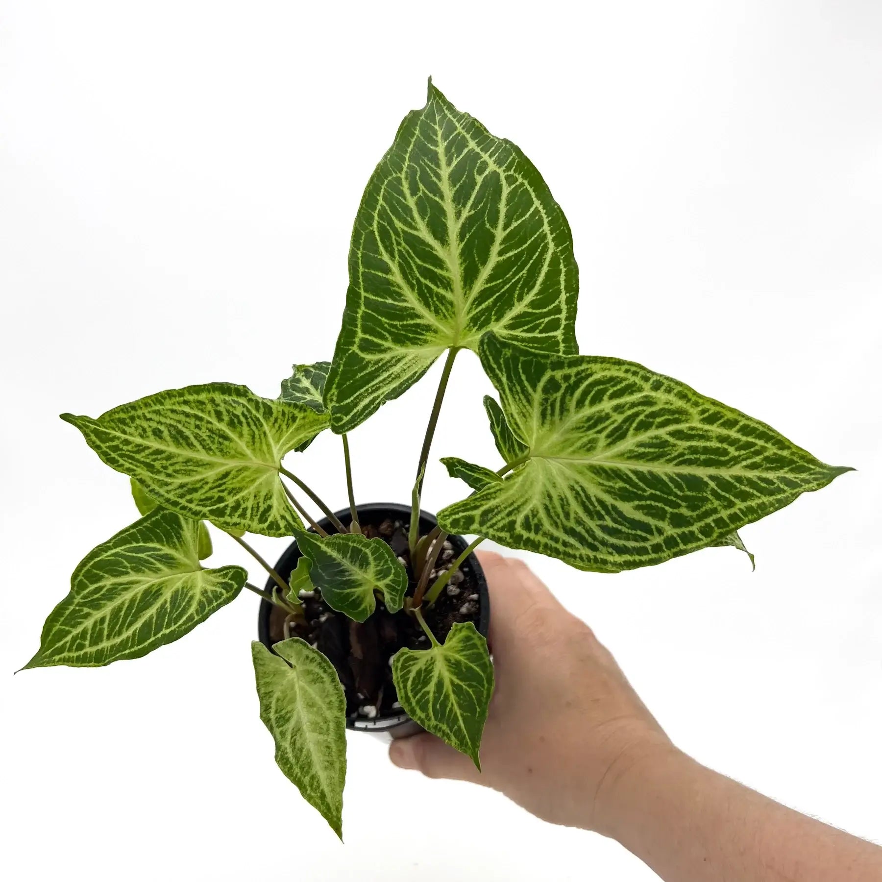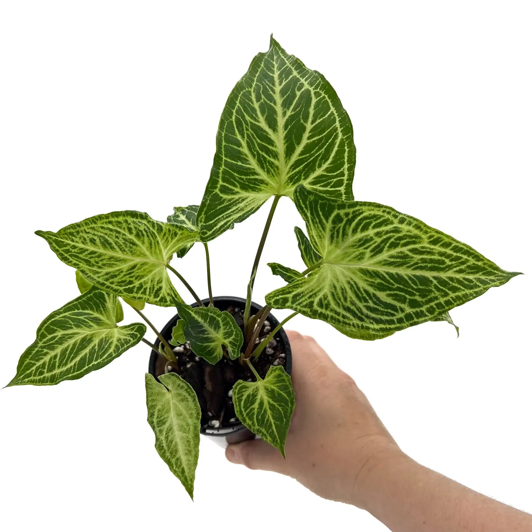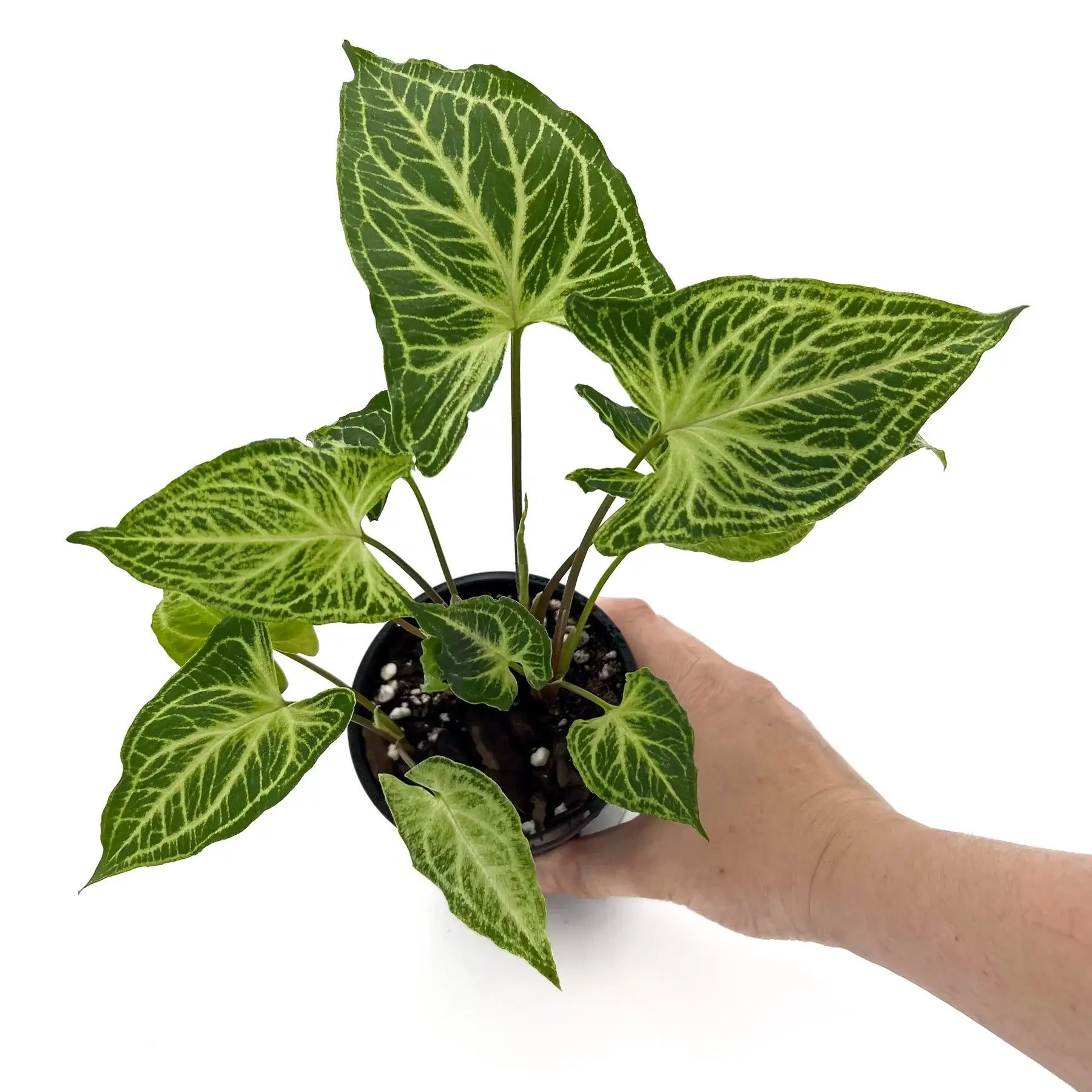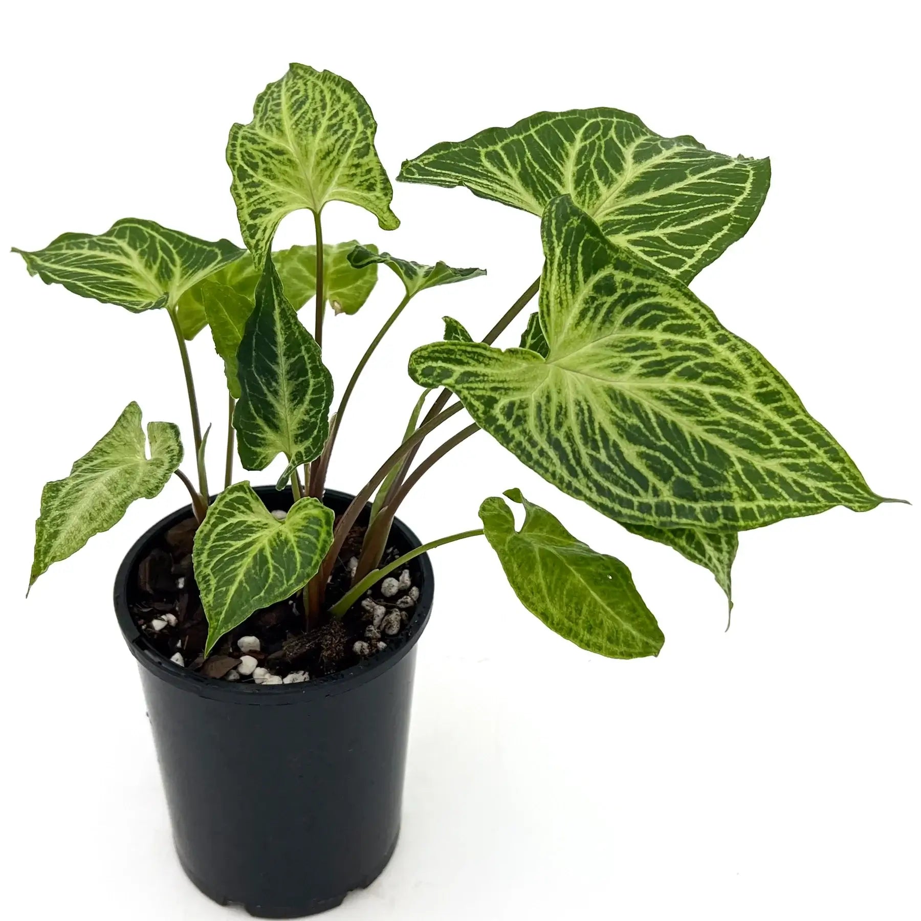 The Syngonium podophyllum 'Batik' boasts a vibrant green leaf adorned with intricate white veining, reminiscent of Indonesia's traditional 'Batik' dyeing technique, from which it derives its name. The Syngonium podophyllum Batik offers an appealing combination of beauty and ease of care, making it an ideal addition to any room in your house. It grows rapidly, displaying stunning transformations as its leaves mature. Initially arrow-shaped, the leaves eventually develop lobes and divide into three sections. The plant requires a supporting pole for climbing and developing aerial roots to achieve this growth pattern.