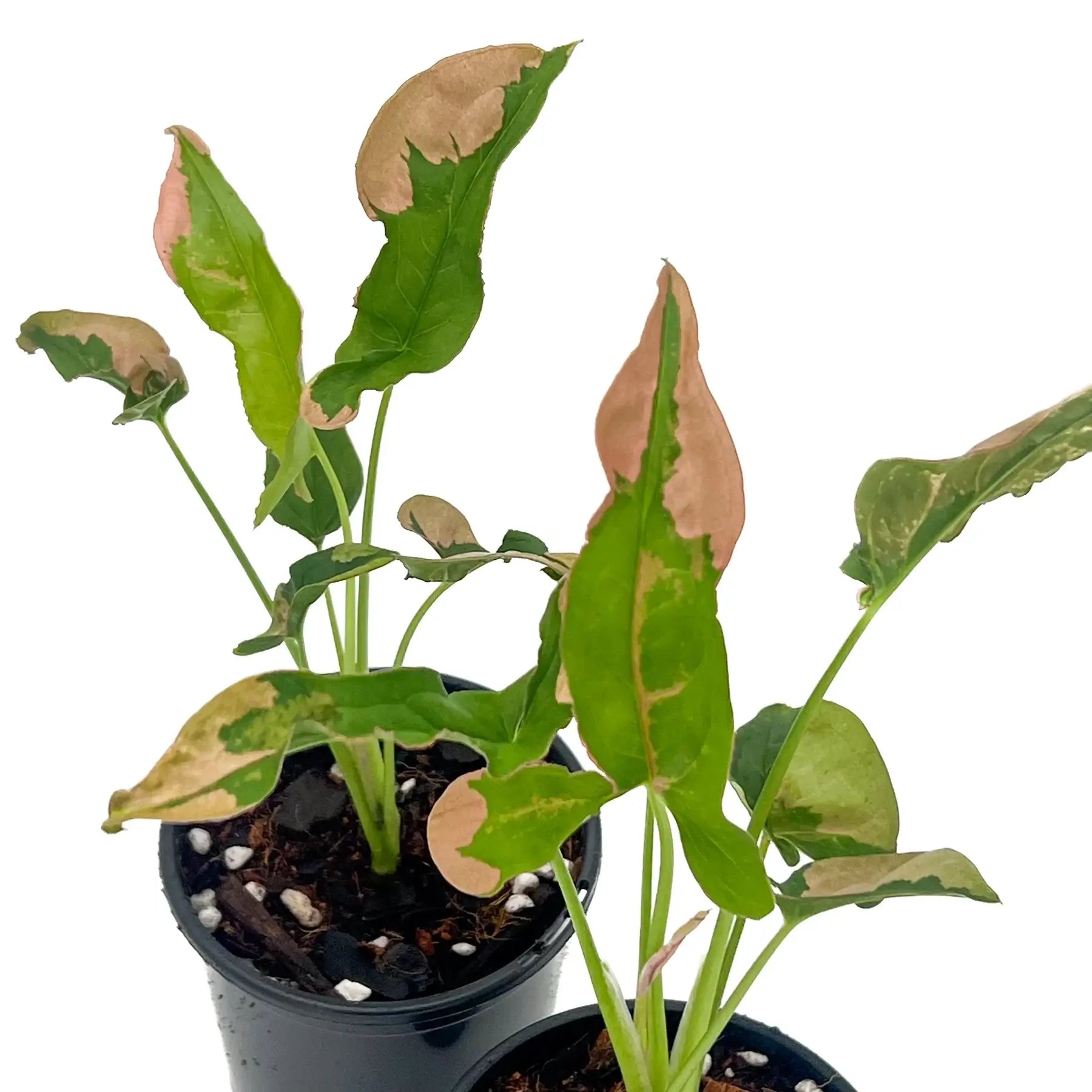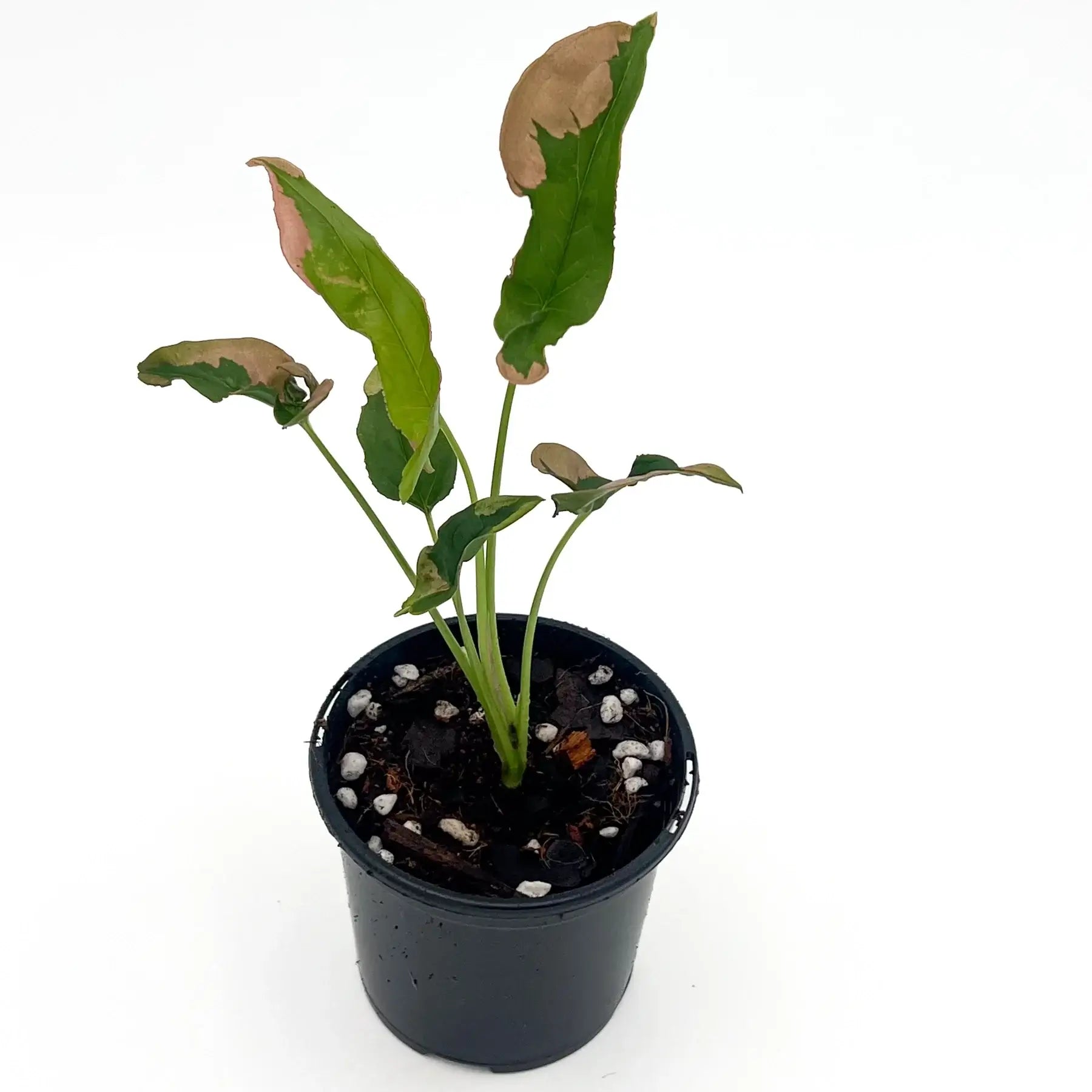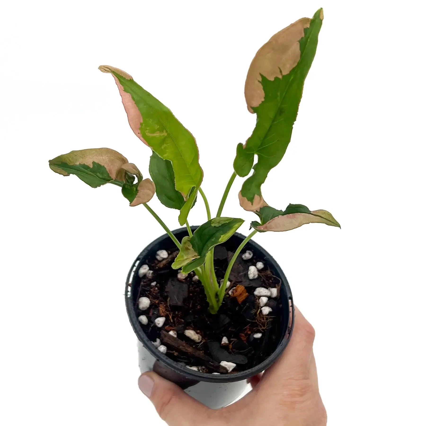 Syngonium podophyllum 'Beauty' is also known as Syngonium Beauty Queen, Syngonium Pink Lava or Syngonium Pink Beauty. The leaves are pink with strips of green through the middle. As the plant matures, the pink colouring becomes brighter, and the older leaves can turn a minty colour. The leaves can come through slightly misshapen, which adds to the charm of this plant.
