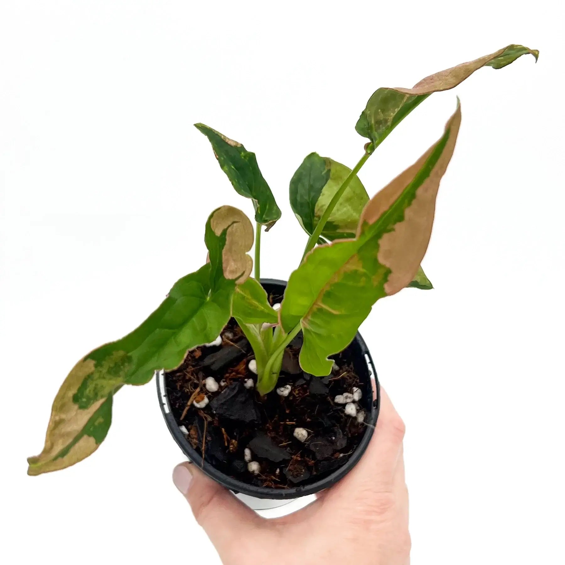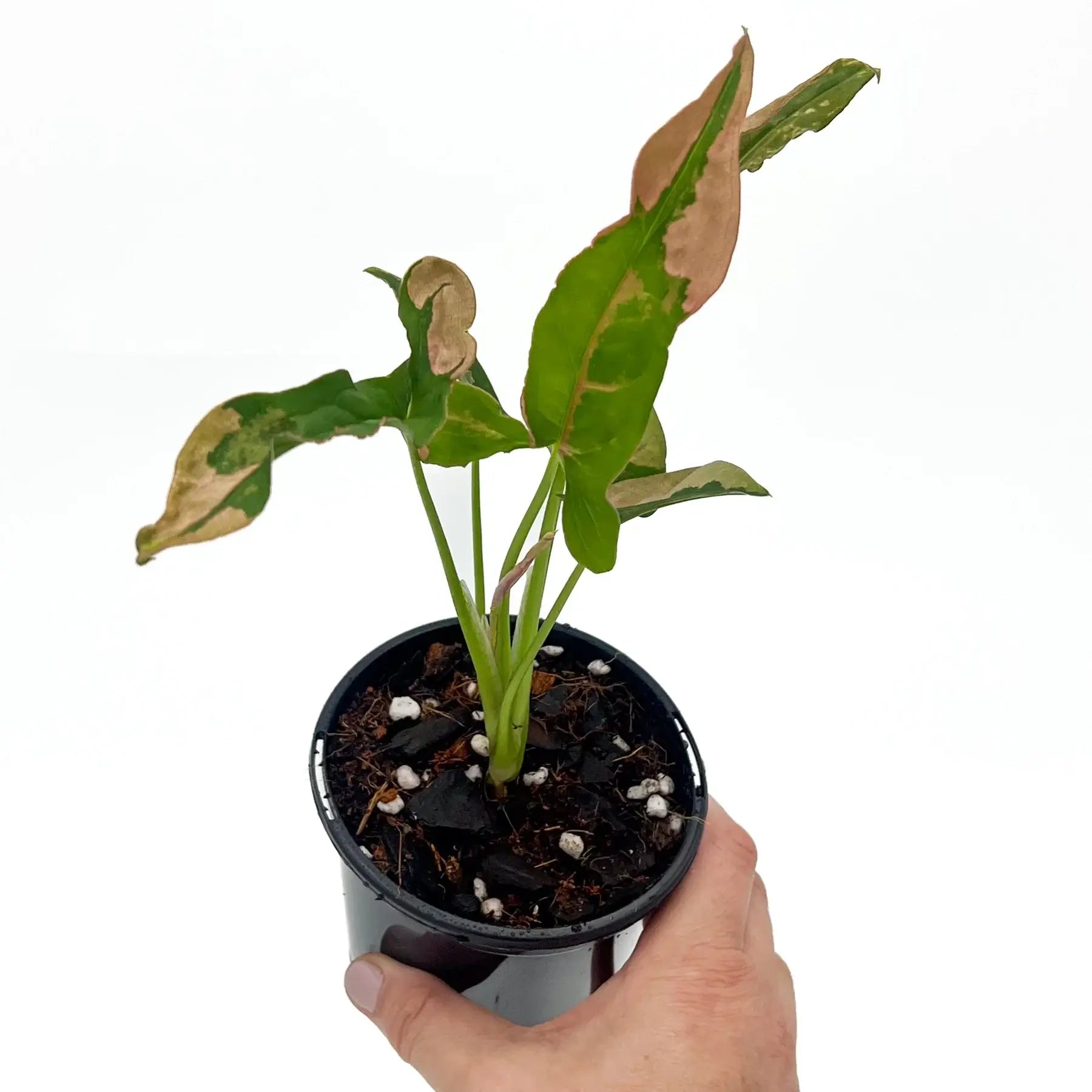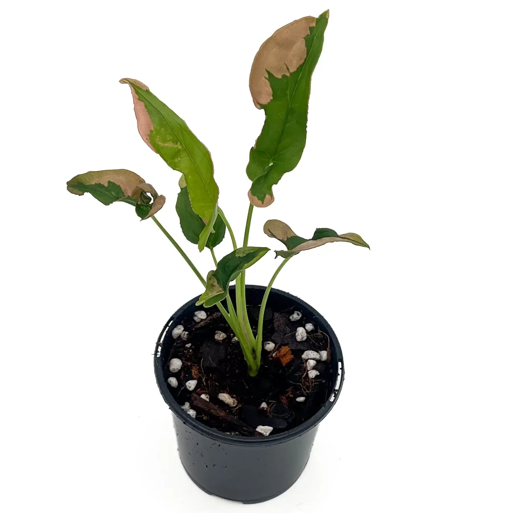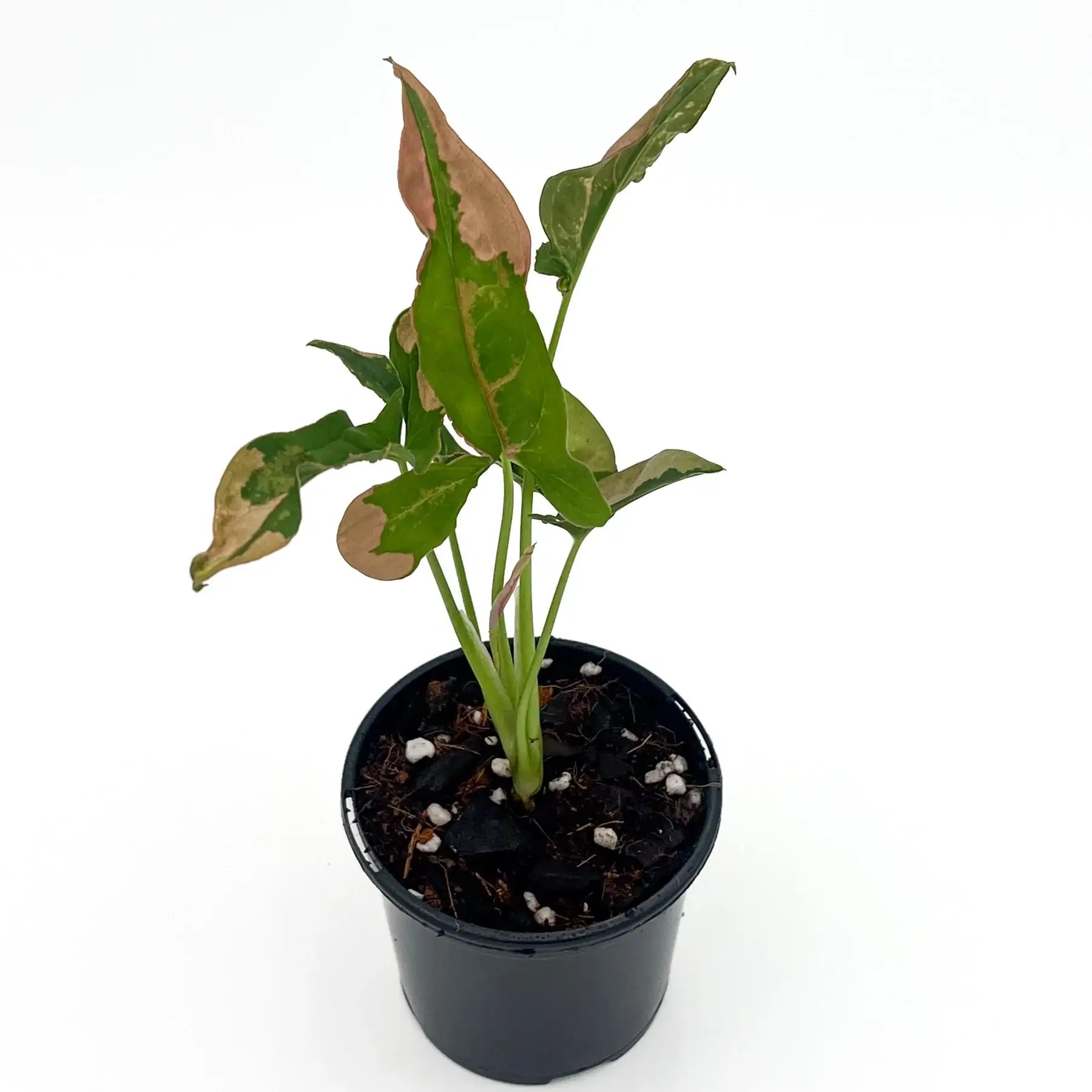 Syngonium podophyllum 'Beauty' is also known as Syngonium Beauty Queen, Syngonium Pink Lava or Syngonium Pink Beauty. The leaves are pink with strips of green through the middle. As the plant matures, the pink colouring becomes brighter, and the older leaves can turn a minty colour. The leaves can come through slightly misshapen, which adds to the charm of this plant.