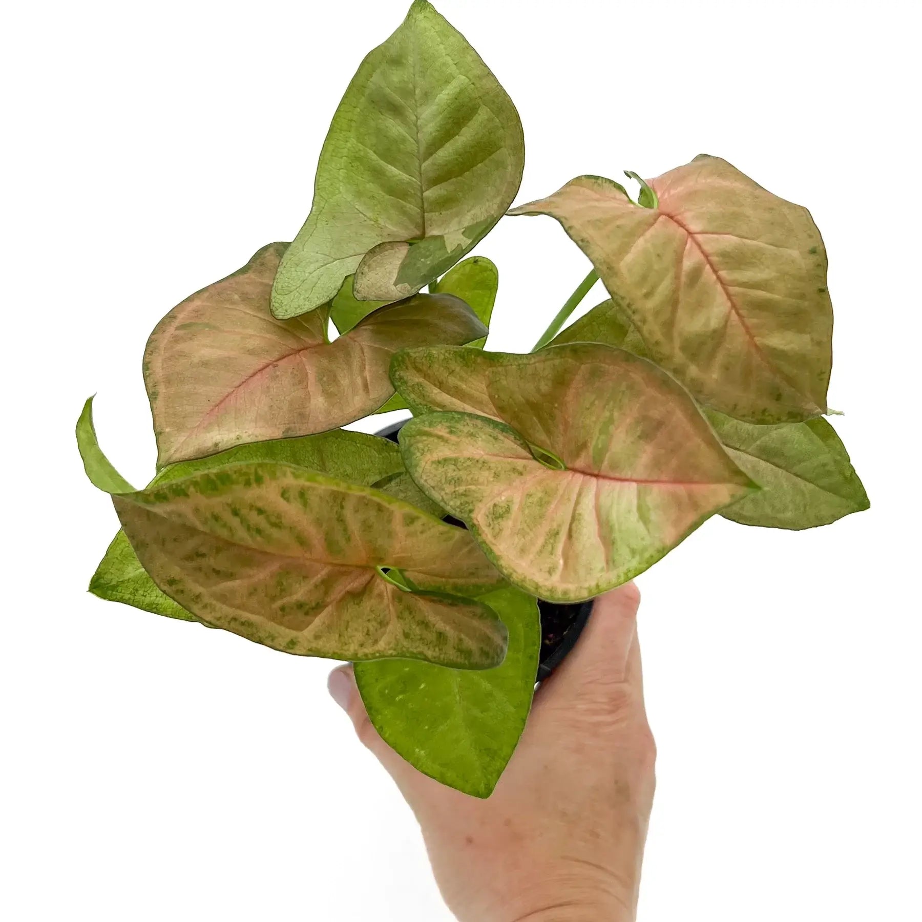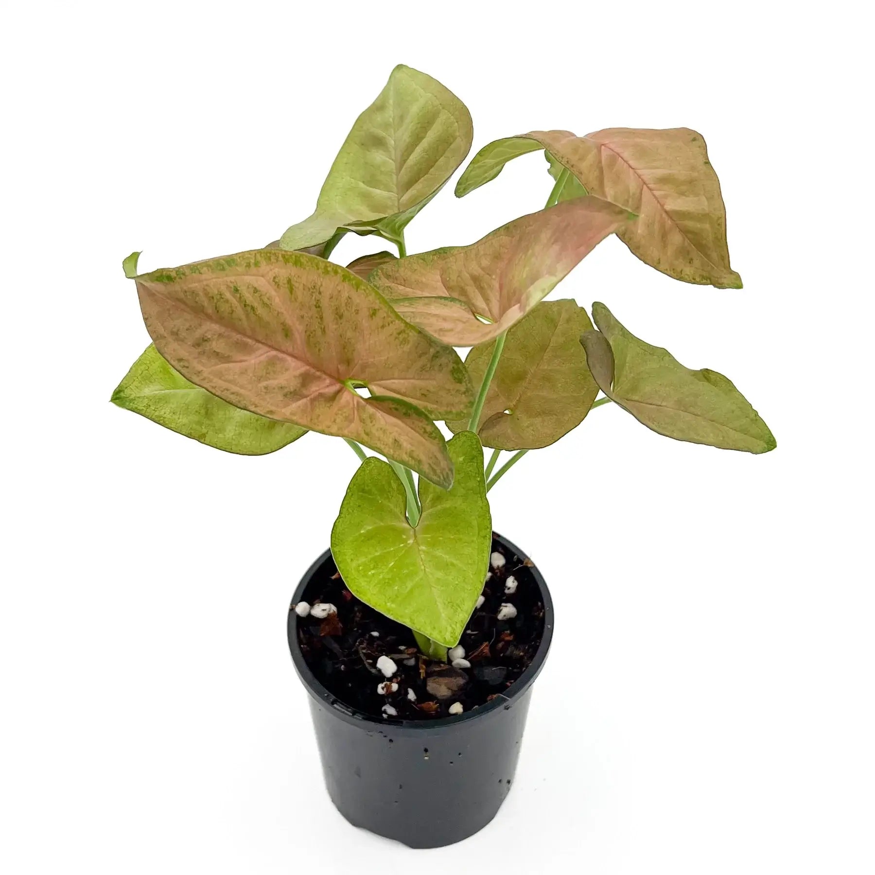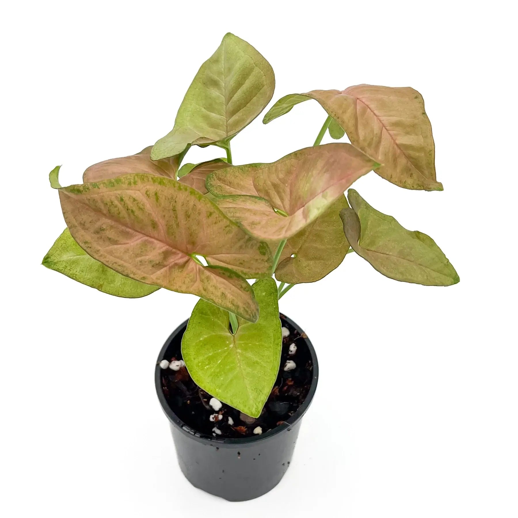 Syngonium podophyllum 'Pink Passion' is a striking vining indoor plant with elongated, arrow-shaped leaves that display a vibrant mix of pink and green. The foliage is heavily variegated, with pink tones almost covering the entire green background. As the plant matures, the pink shades can deepen, and the leaves may become more segmented. This fast-growing Syngonium has a trailing or climbing habit, making it perfect for hanging baskets or moss poles.