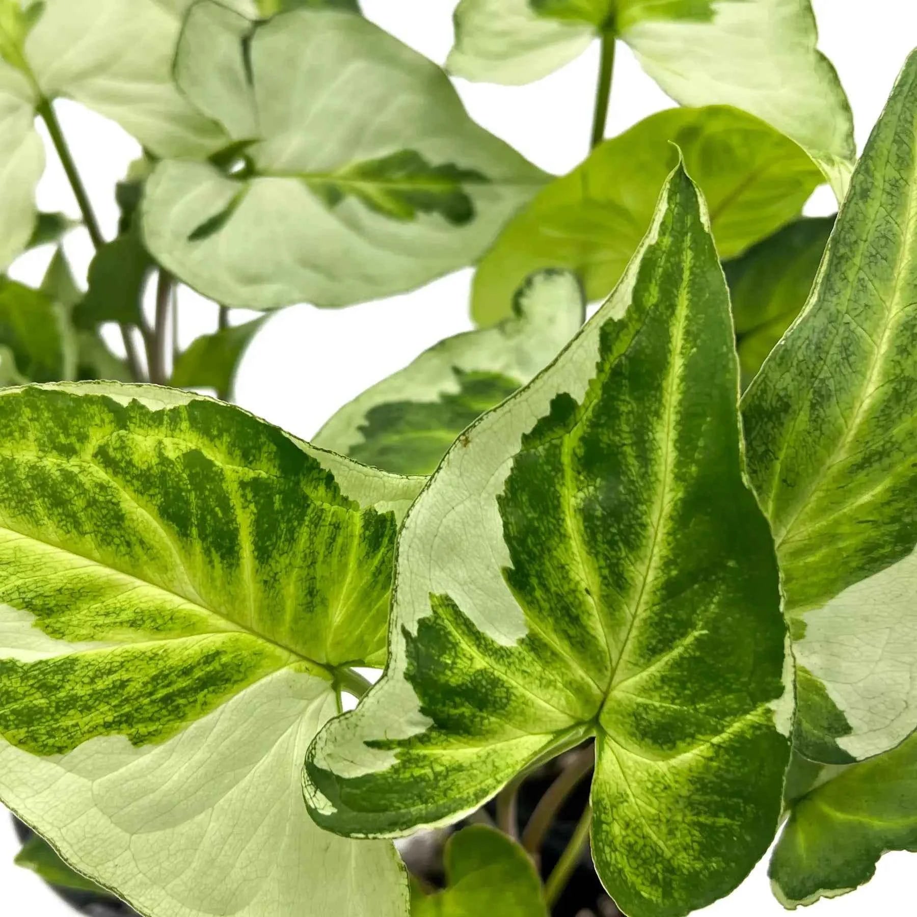 Syngonium podophyllum 'Three Kings' has arrow-shaped leaves with a blend of soft green and creamy white variegation. The variegation appears in irregular patterns, with some leaves showing marbled or speckled markings. As the plant matures, the foliage may develop more defined lobes. This fast-growing, climbing aroid can be grown as a trailing plant or supported for larger, more structured growth.