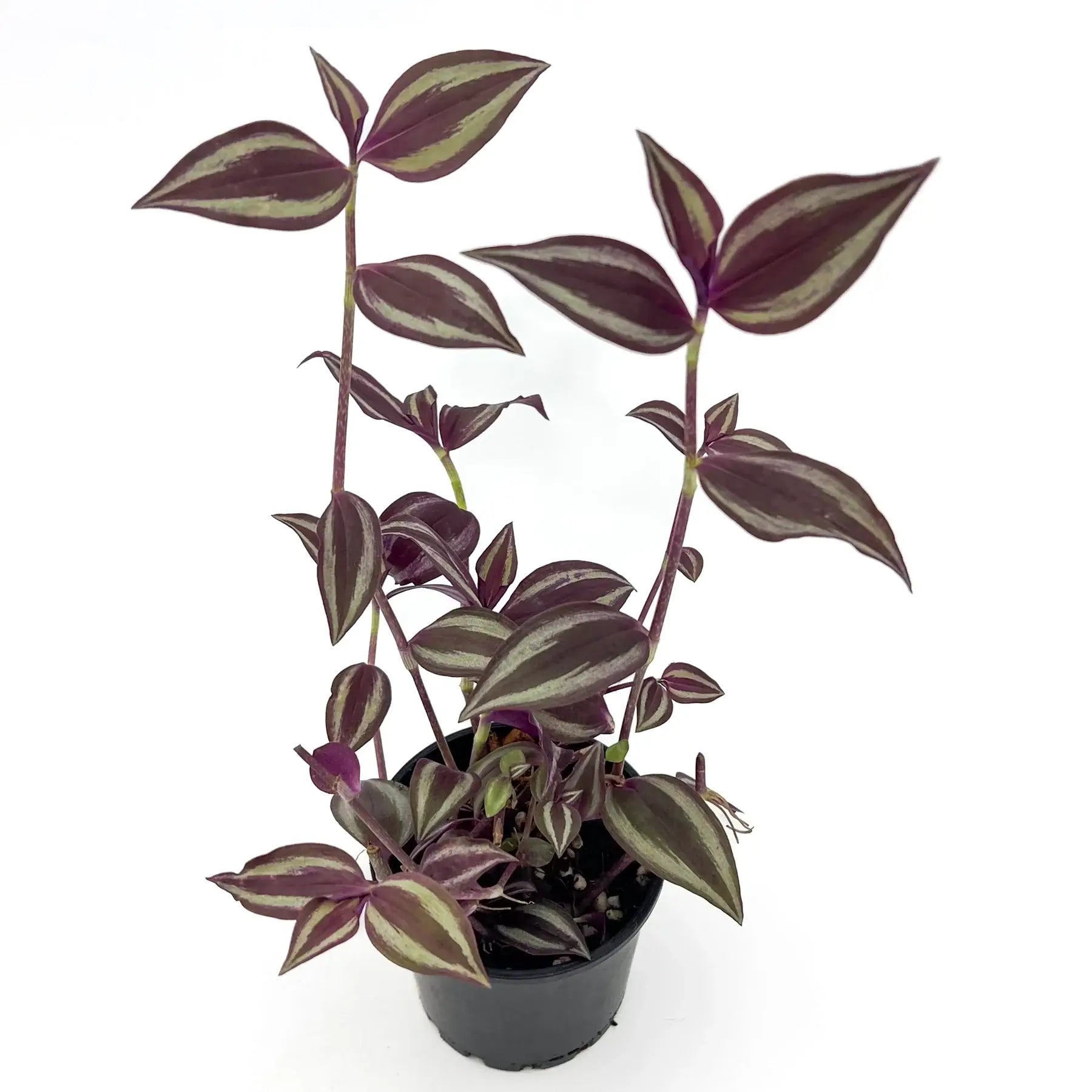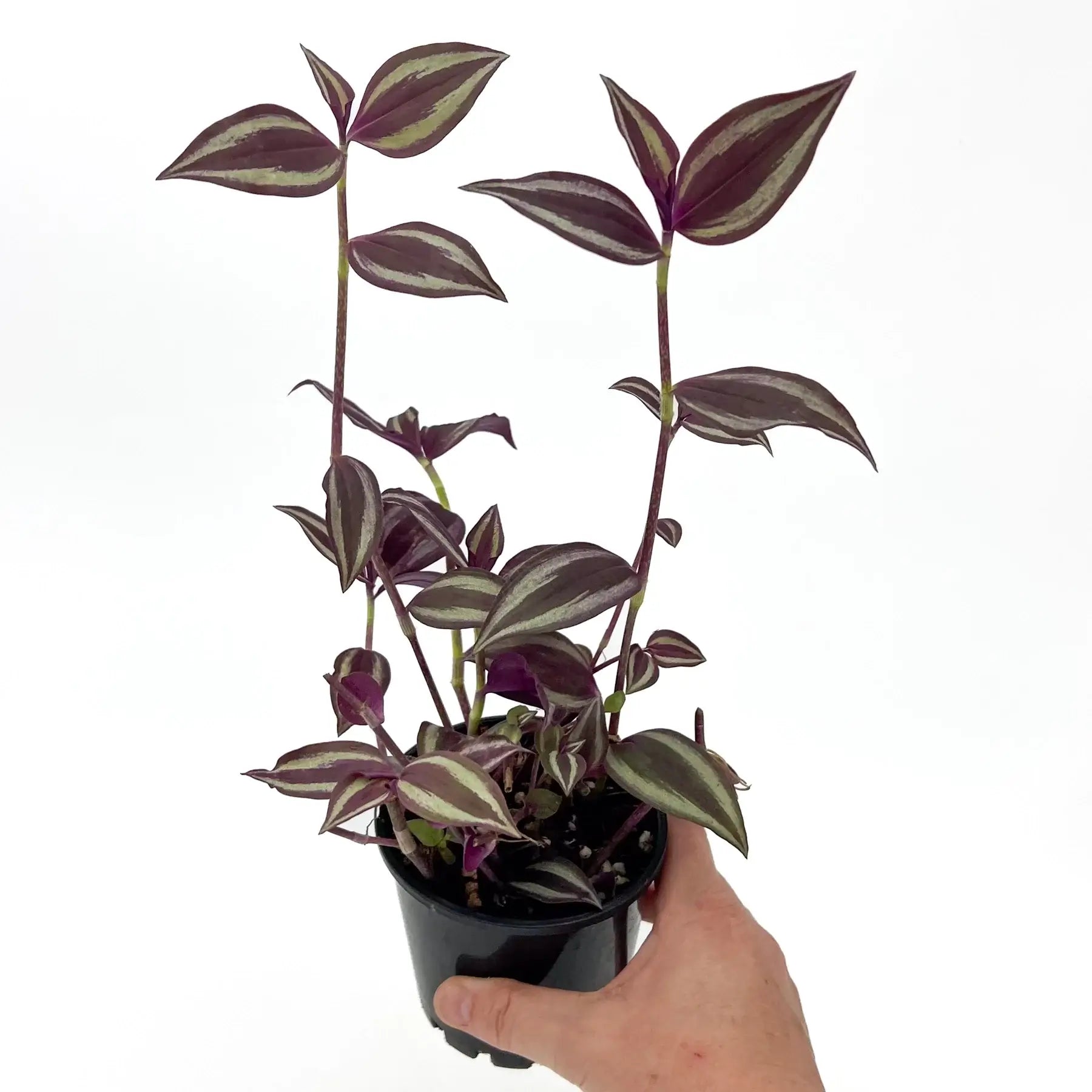 Tradescantia Zabrina is an easy-care and beautiful plant with variegated purple, green & silver leaves with bright purple undersides. Perfect in pots trailing down shelves or planted in a hanging basket.