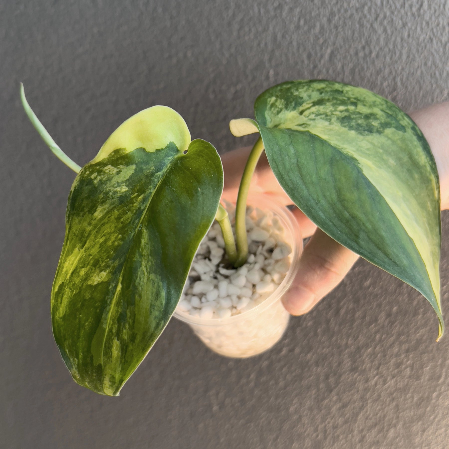 Scindapsus jade satin aurea variegated (Semi Rooted) has thick satin leaves with bright yellow marbling and clean lime streaks running across the newest growth. This plant is forming a stable young root base in perlite and the variegation pattern is already clear for its size. It has a compact shape and is ready to grow on with warm indoor conditions and steady moisture.