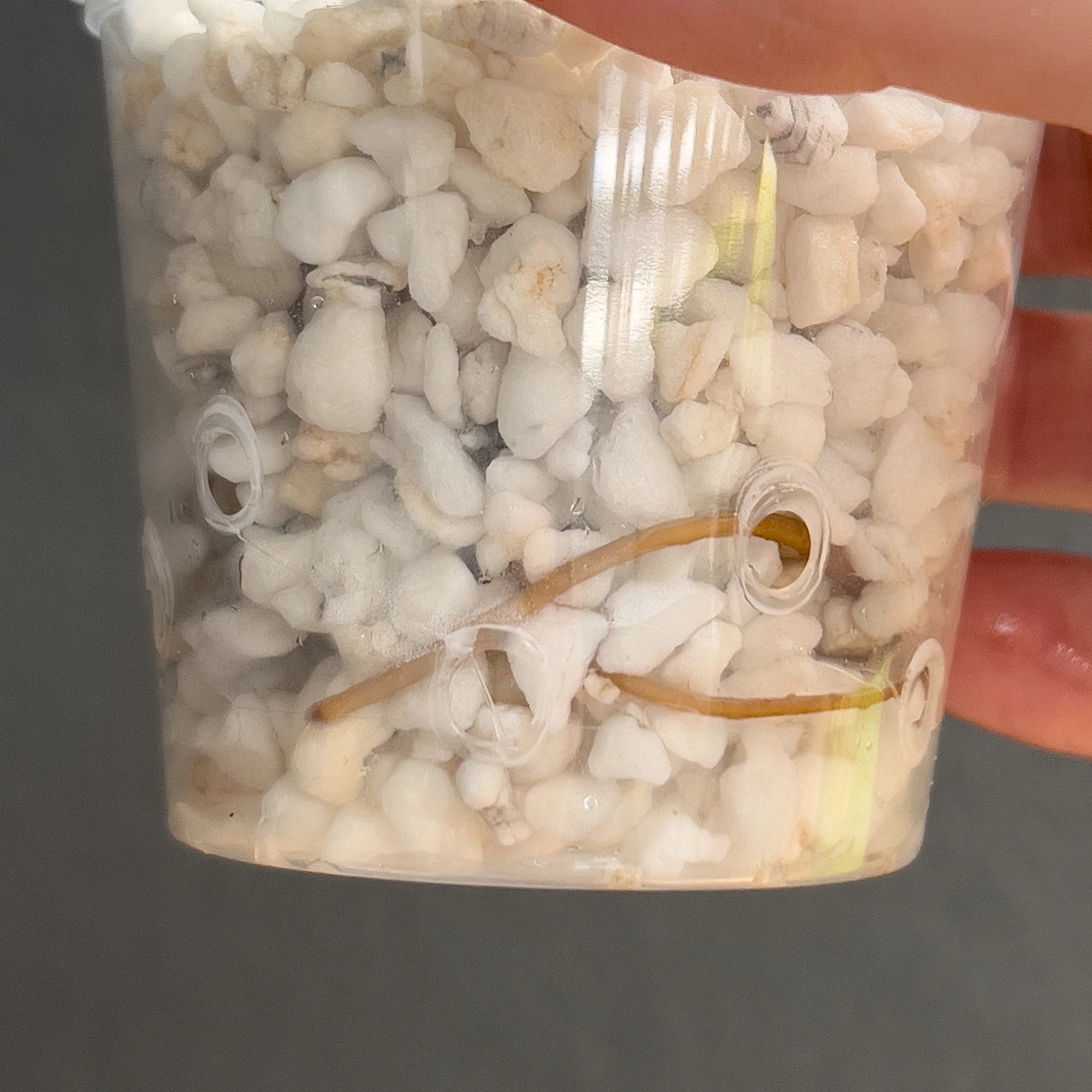 Semi Rooted. Early roots forming through the perlite and holding the plant steady.