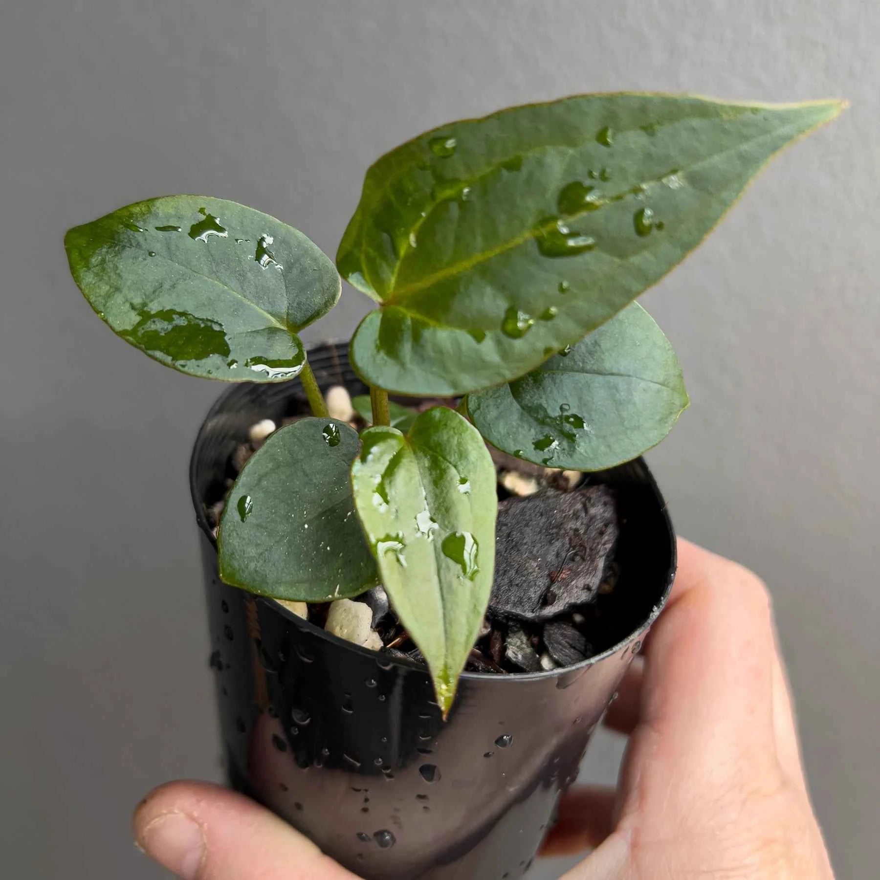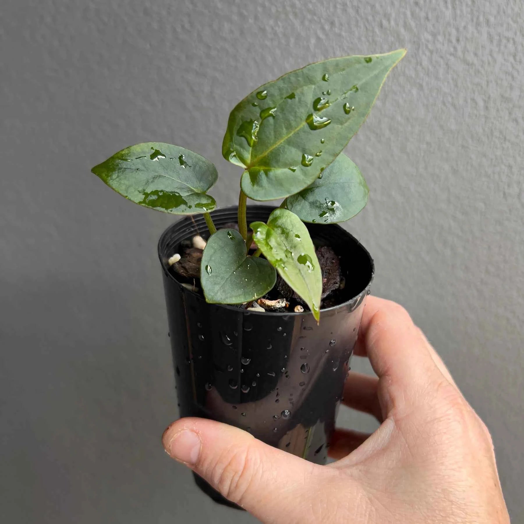 Anthurium ((Zara x Michelle) x pap) x jayda comes from a seed batch created by The Plant Plug as part of a colour genetics experiment. The seed parent carries dark petioles, pink abaxial veining and a big round blade with heavy texture. The pollen parent, known as Jayda, is loved for strong colour in both the abaxial and adaxial veins and a confident growth habit. This cross aims to explore recessive red traits, so each seedling has the potential for interesting vein colour, deeper tones and fuller form. Grown in bright filtered light with steady humidity and a chunky aroid mix, this hybrid suits collectors who enjoy watching character traits reveal themselves as the plant matures.