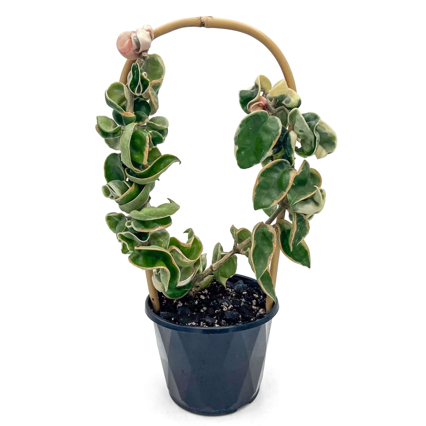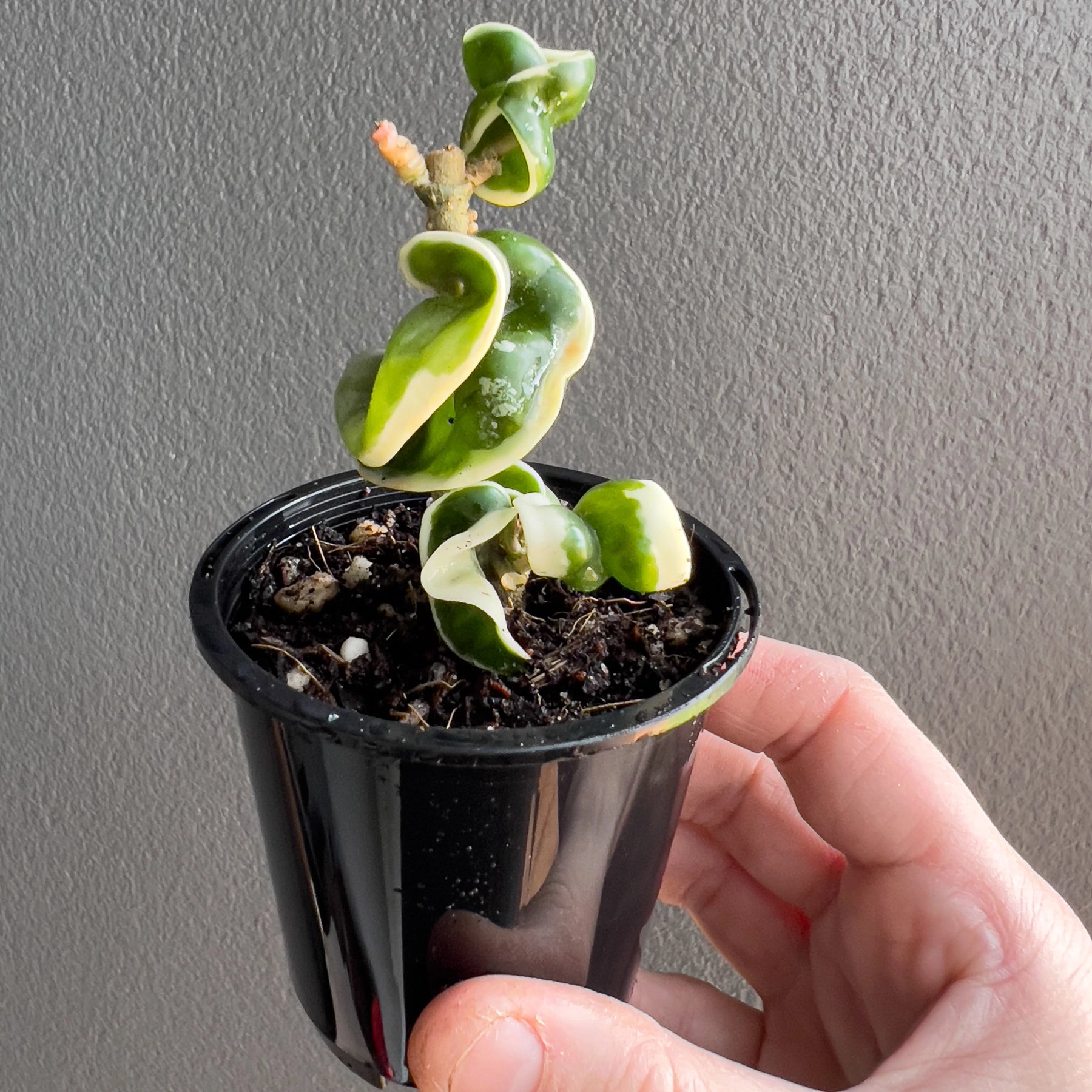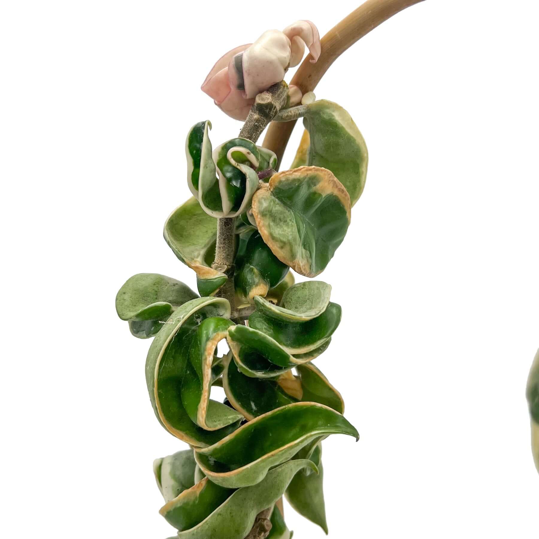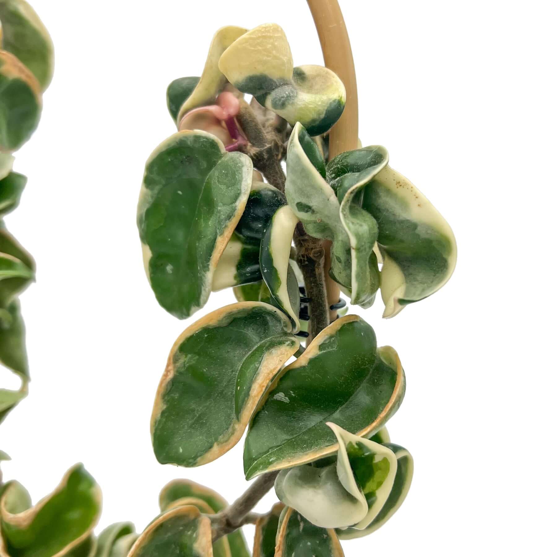 -3The Hoya compacta 'Indian Rope' outside variegate is a unique and attractive type of Hoya. This variety of Hoya is a trailing vine with rope-like stems of thick, twisted, curly, cupped, leaves which are emerald green with creamy white margins. New foliage often comes out pink. With proper care and maintenance, this beautiful plant can thrive for years and make a great addition to any home. The Hoya compacta Indian Rope - outside variegate has star-shaped baby pink flowers with red-centred white corona.
