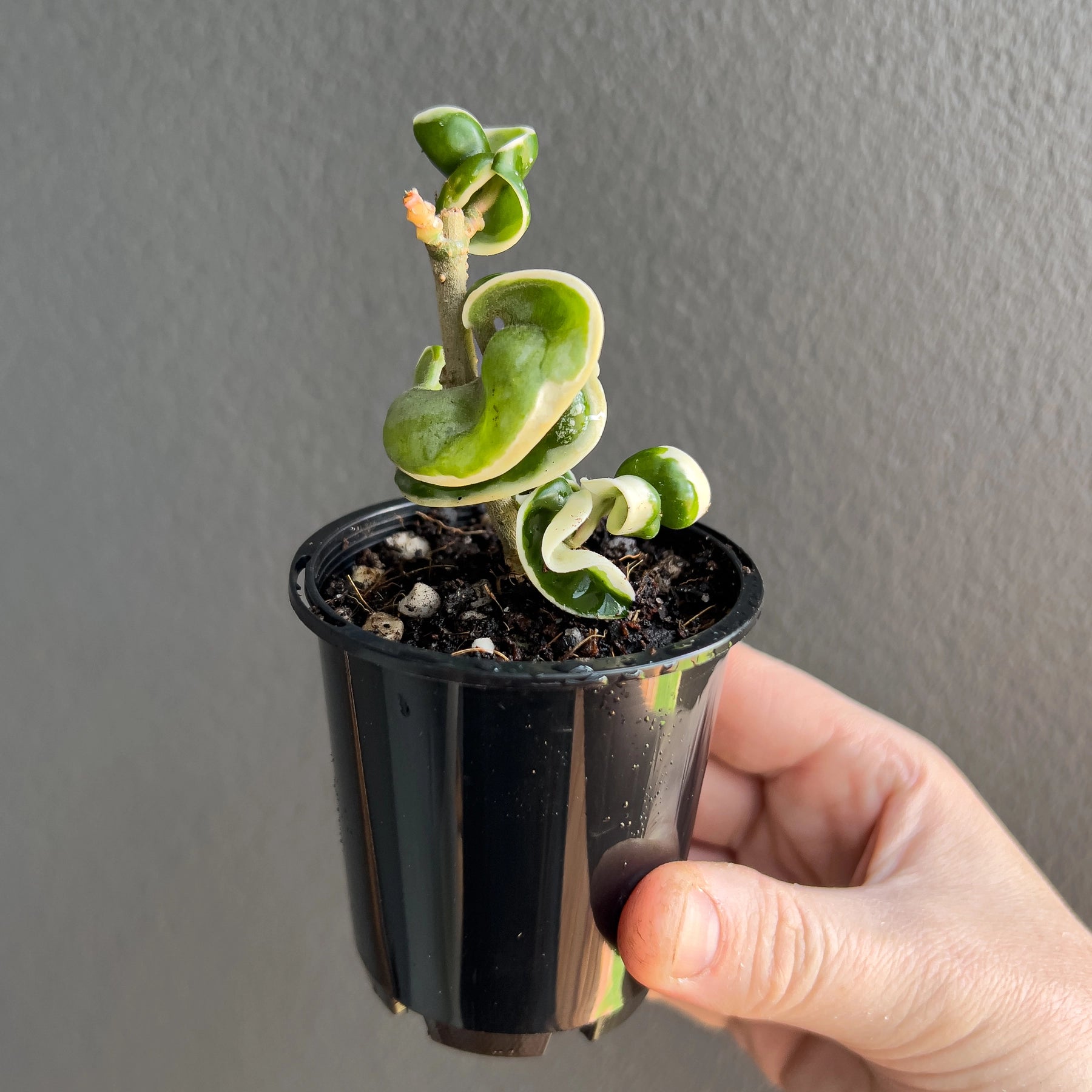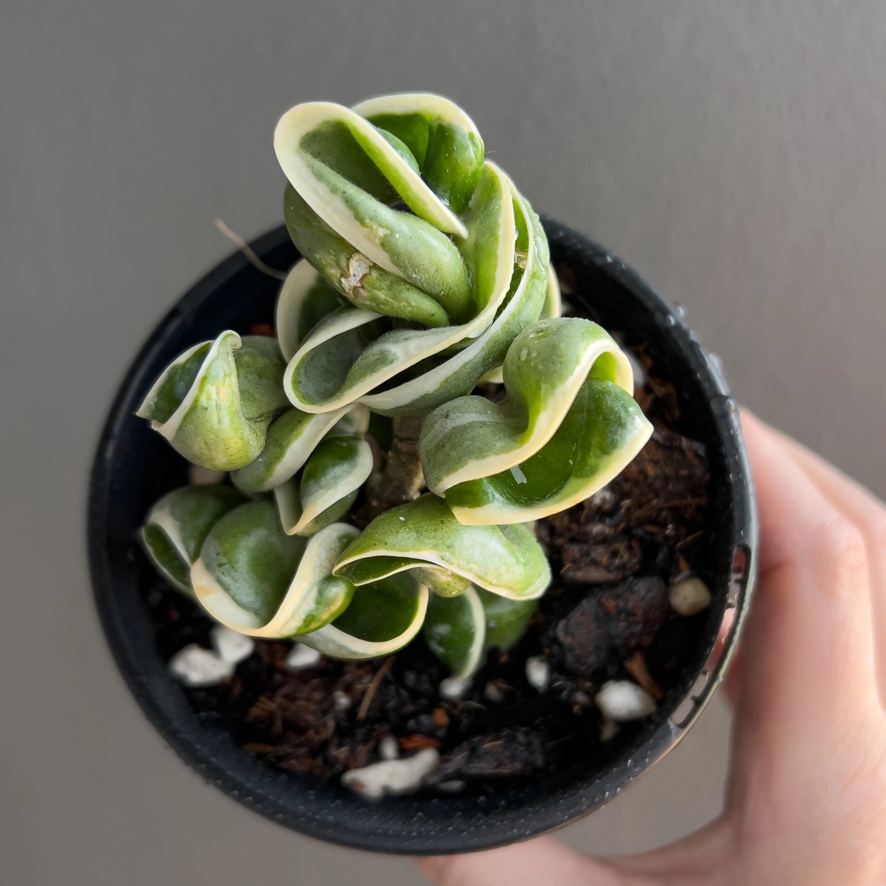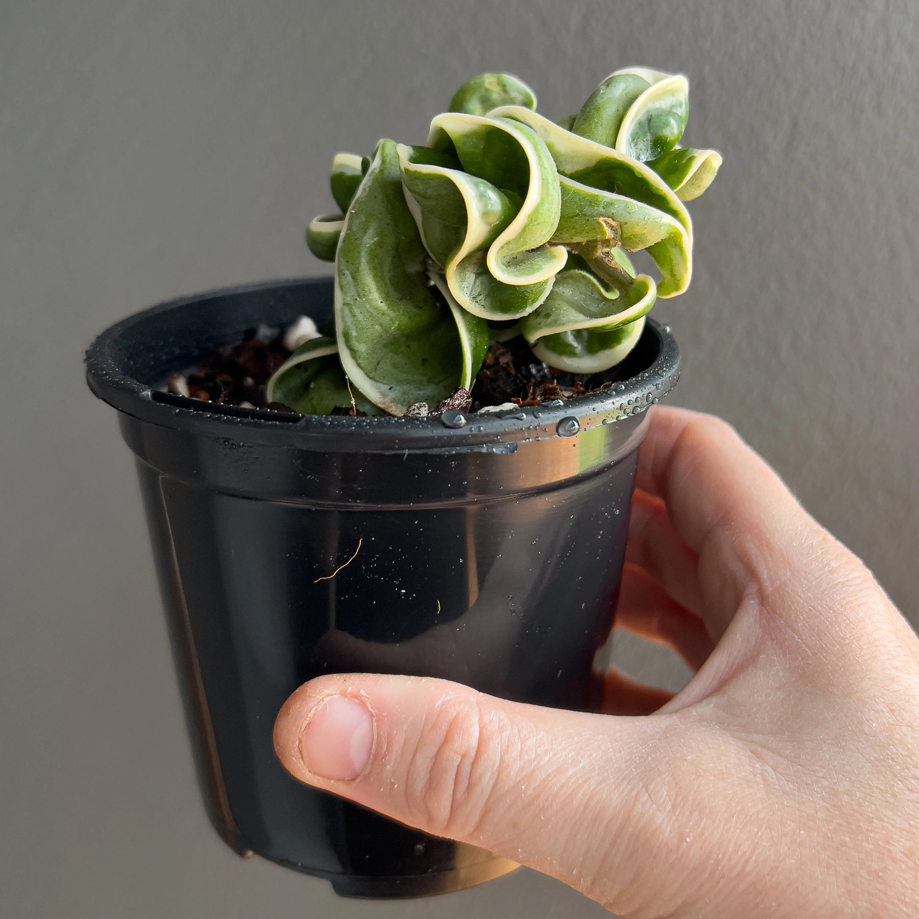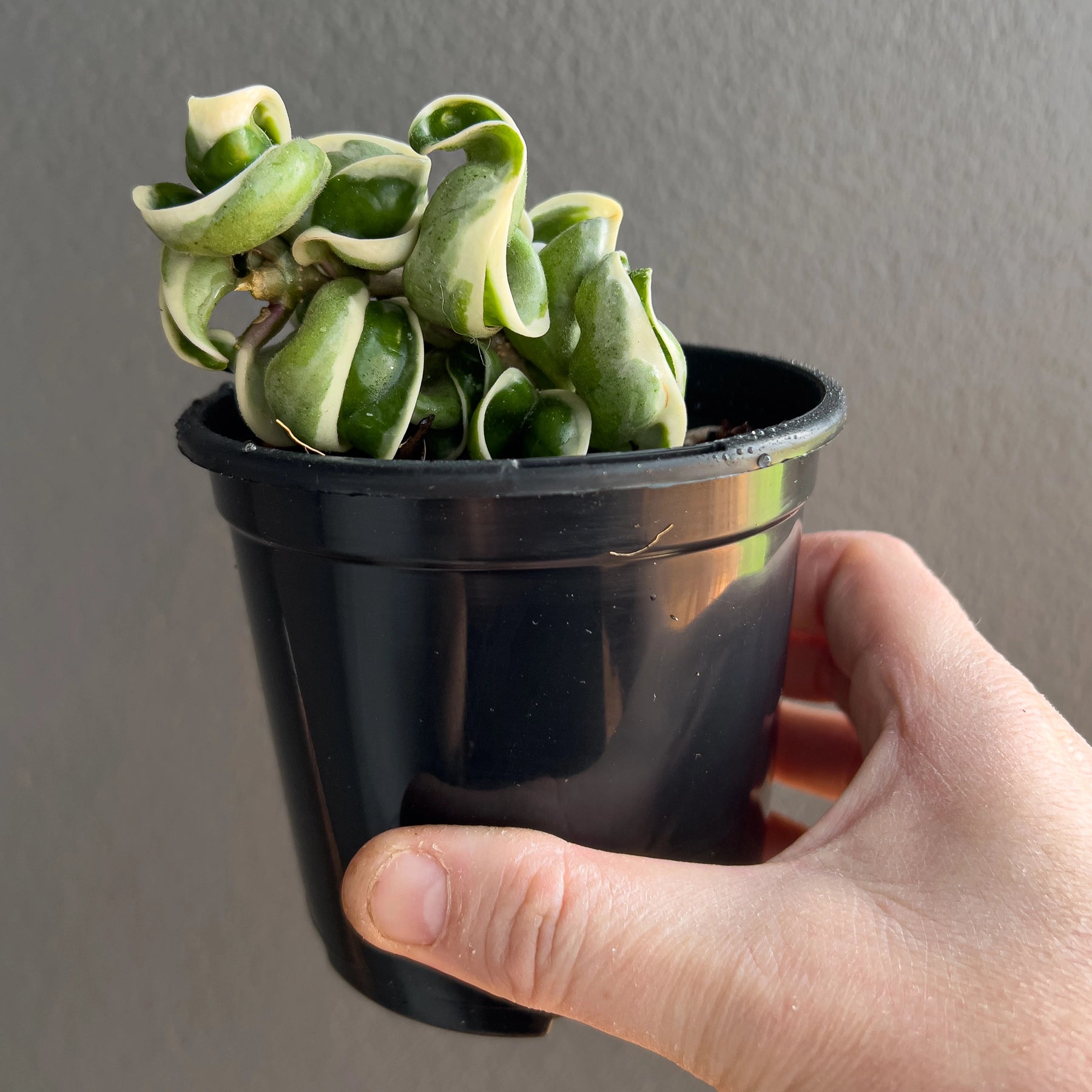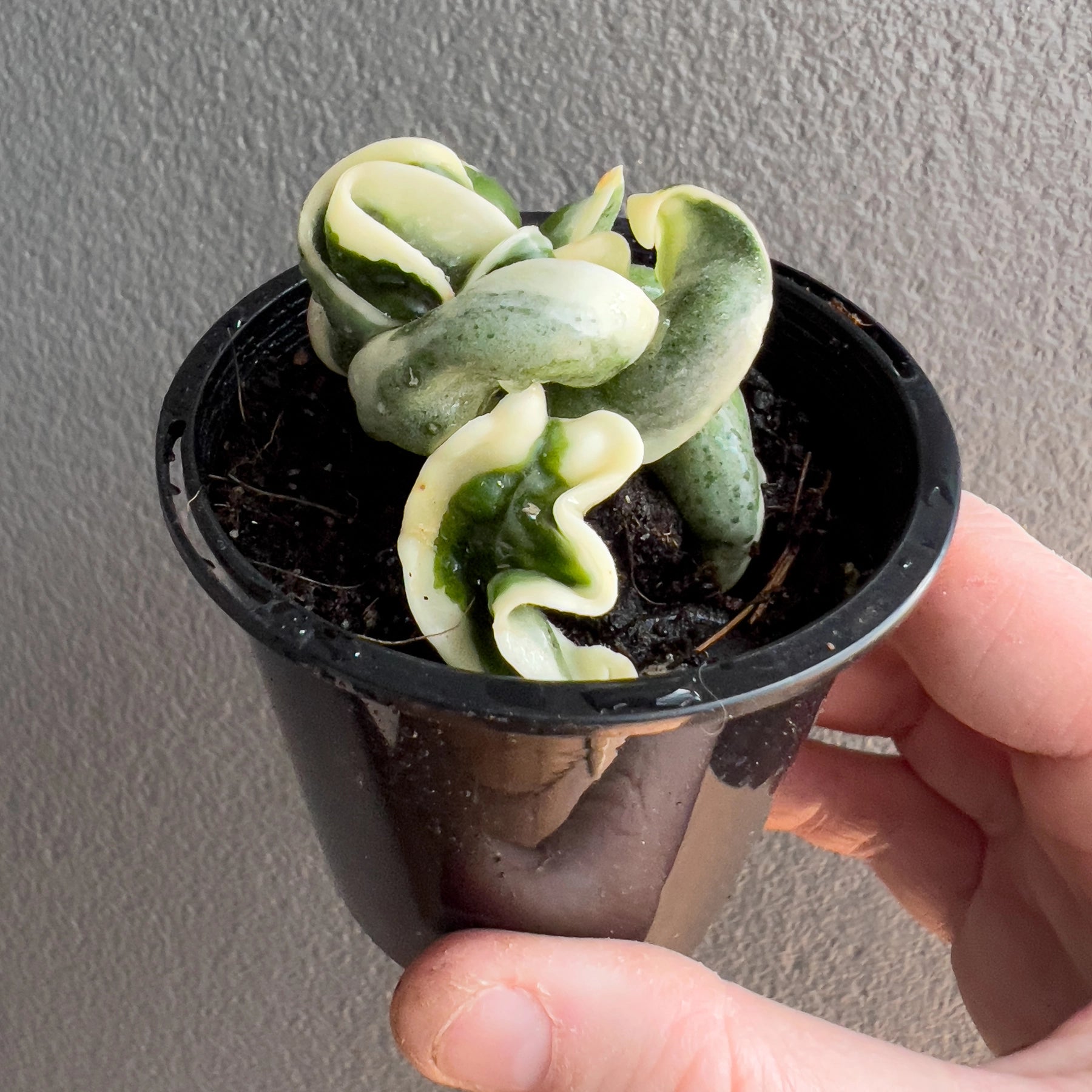 -3The Hoya compacta 'Indian Rope' outside variegate is a unique and attractive type of Hoya. This variety of Hoya is a trailing vine with rope-like stems of thick, twisted, curly, cupped, leaves which are emerald green with creamy white margins. New foliage often comes out pink. With proper care and maintenance, this beautiful plant can thrive for years and make a great addition to any home. The Hoya compacta Indian Rope - outside variegate has star-shaped baby pink flowers with red-centred white corona.