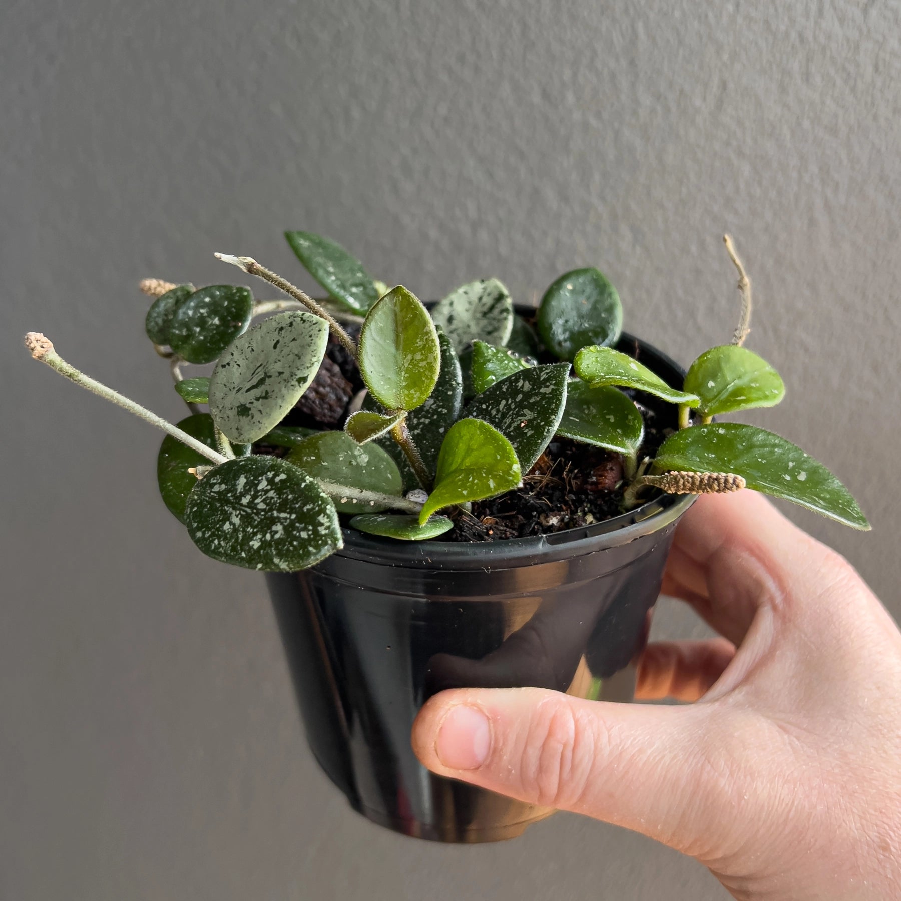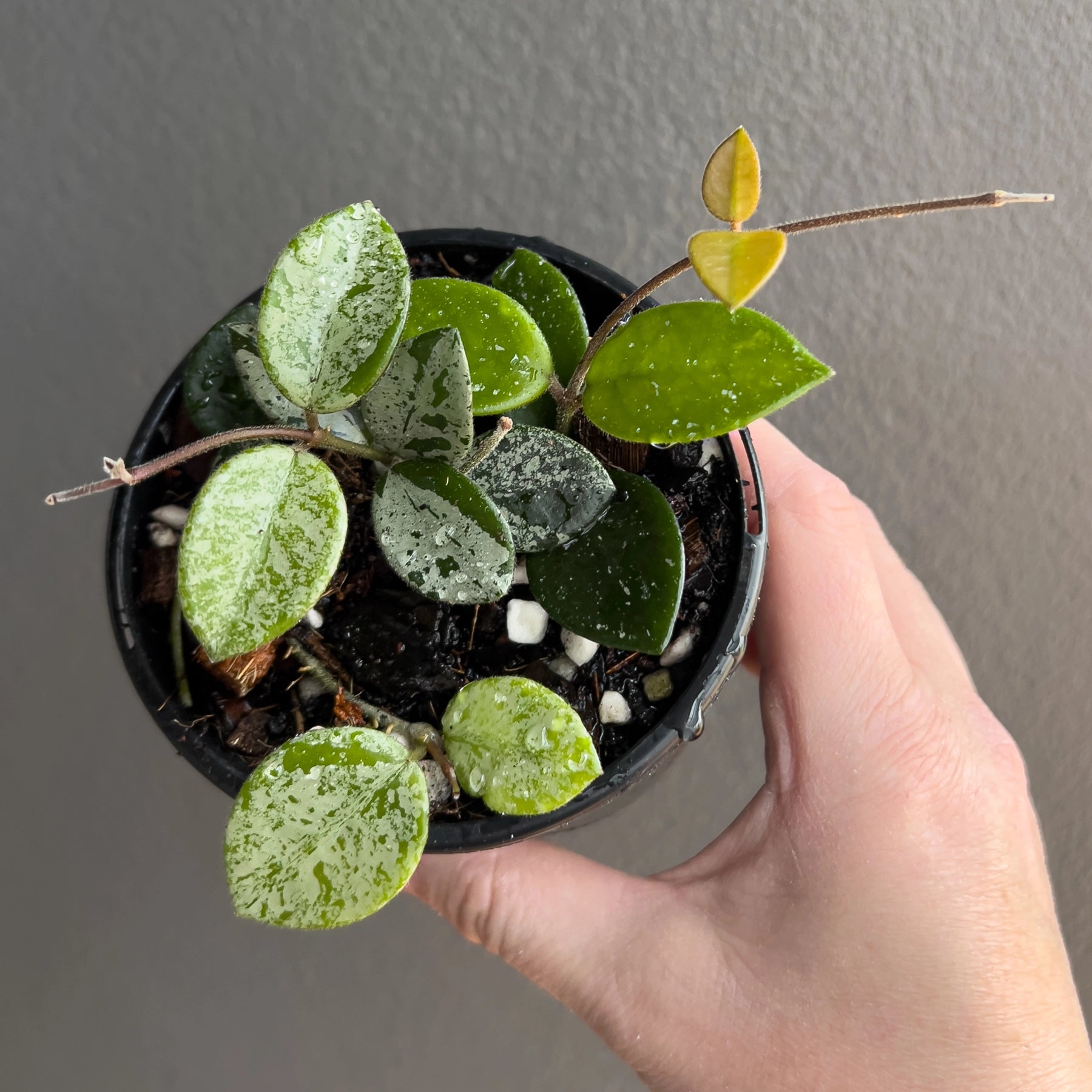 The Hoya mathilde 'Splash' is a gorgeous plant with small, splashy leaves measuring approximately 2cm x 1.5cm. It is a resilient and fast-growing plant with thick, rounded green leaves. The leaves display random silver speckling, which can become more pronounced when the plant is positioned in a well-lit area. While it can trail downwards, it readily climbs nearby structures. The Hoya mathilde 'Splash' produces lovely baby pink flowers that emit a gentle and sweet fragrance. It blooms early and frequently. The Hoya mathilde 'Splash' is a hybrid of the Hoya carnosa and the Hoya serpens. The flowers are flat and pubescent, measuring up to 15mm in diameter. They feature a red-centred baby pink corona and typically appear in clusters of up to 16 flowers per umbel. These nectar-producing flowers exude a delightful scent lasting up to five days.