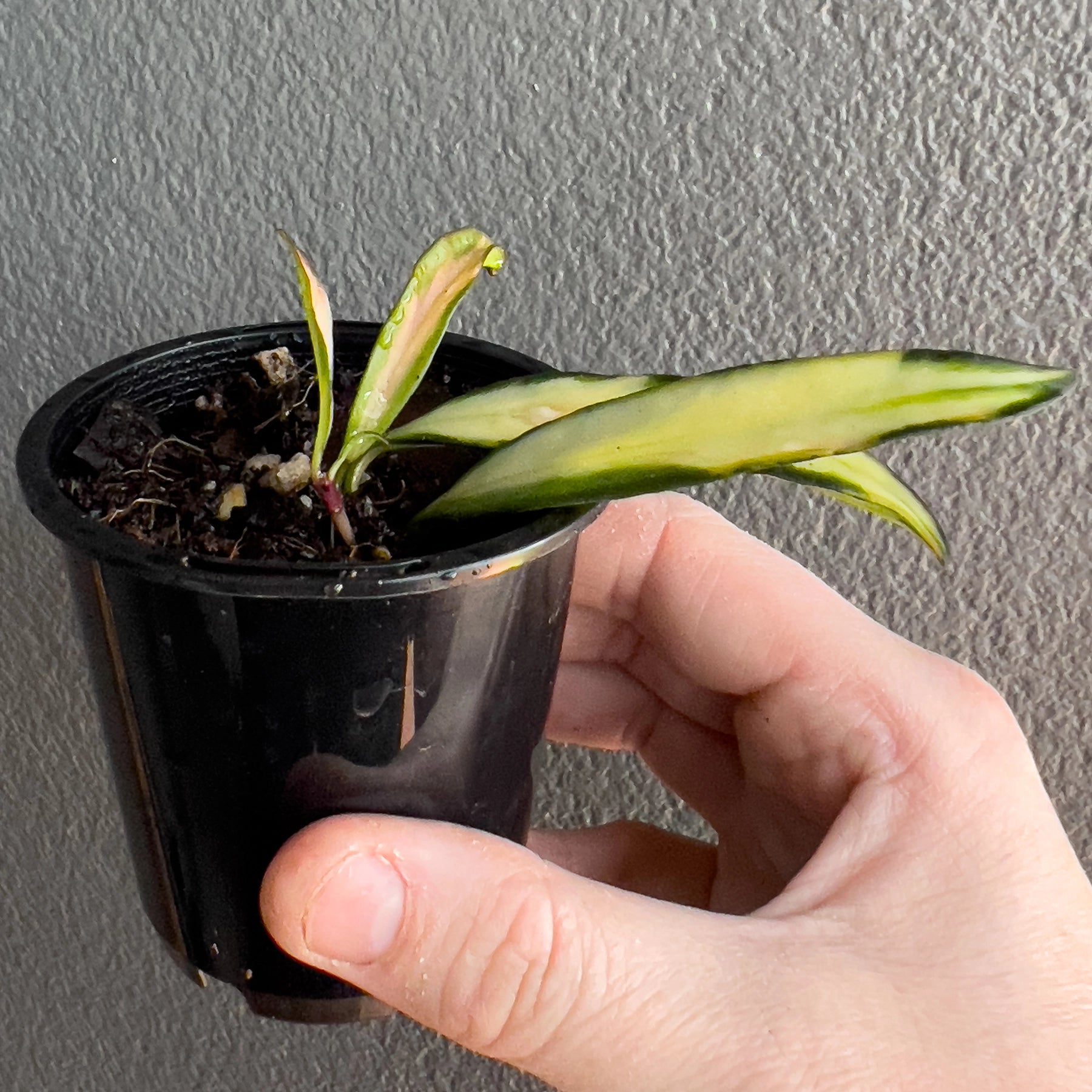 The Hoya wayetii 'Variegated' is known for its long, narrow leaves with a mix of green, cream, pink, lime, and crimson, measuring about 12cm in length and 1cm in width, with wavy dark edges. Its leaves turn pink/red when exposed to sunlight, a process known as Sun Stressing. This plant is suitable for hanging pots and prefers direct morning sun for optimal colour and bright indirect light for the rest of the day. It requires well-draining soil and should be watered only after it dries. The Hoya wayetii 'Variegated' also produces small, downy blooms with plum-red petals and a yellow-cantered corona, emitting a butterscotch fragrance. Each cluster can have up to 30 flowers, and the plant is known for blooming prolifically.