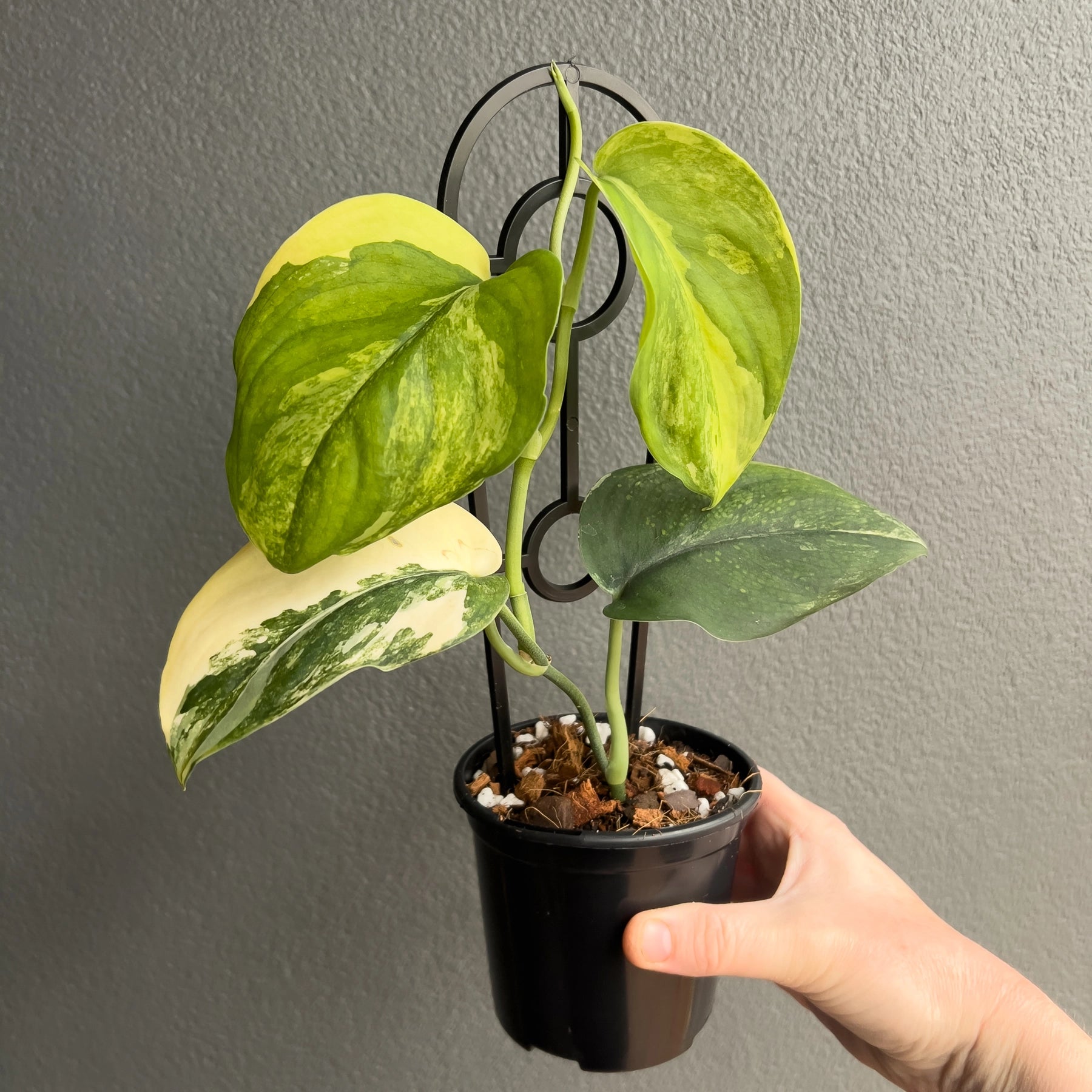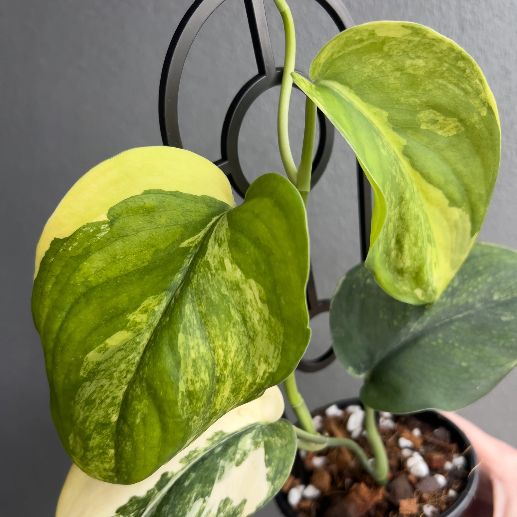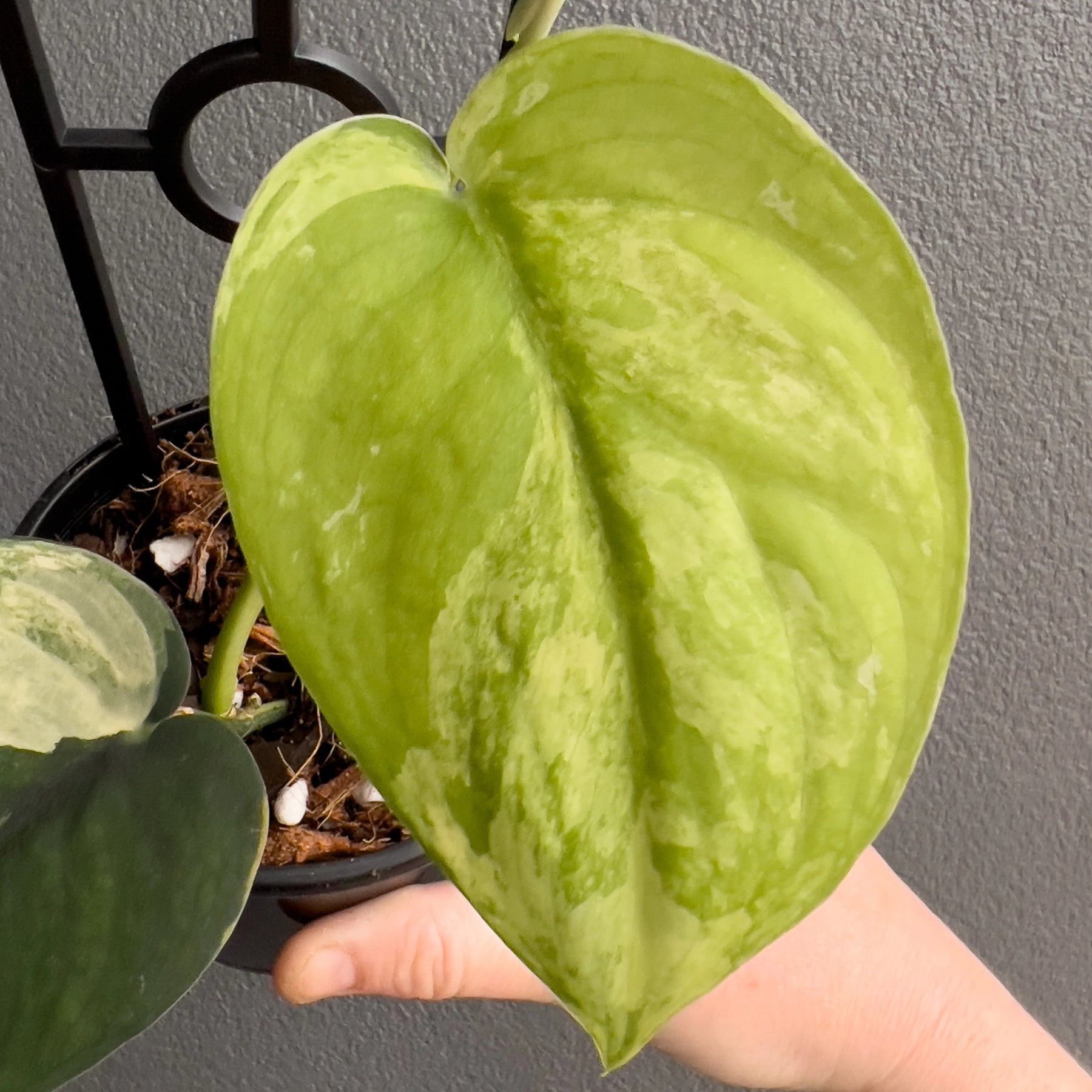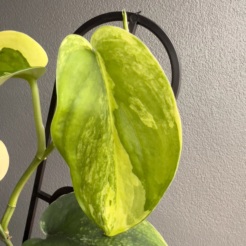 The Scindapsus pictus Jade Satin Aurea Variegated is an uncommon and stunning indoor plant known for its unique and striking foliage. The leaves are a jade green colour with a satin-like finish. Each leaf features variegated patterns of bright yellow and creamy white. The variegation can vary from subtle streaks to bold patches, making each leaf unique. The plant tends to have a trailing or climbing growth habit, making it perfect for hanging baskets or training on a trellis. Its lush, vibrant leaves add a touch of elegance and tropical beauty to any indoor space. They require bright indirect light to help brighten the yellow colour when the leaves unfurl.