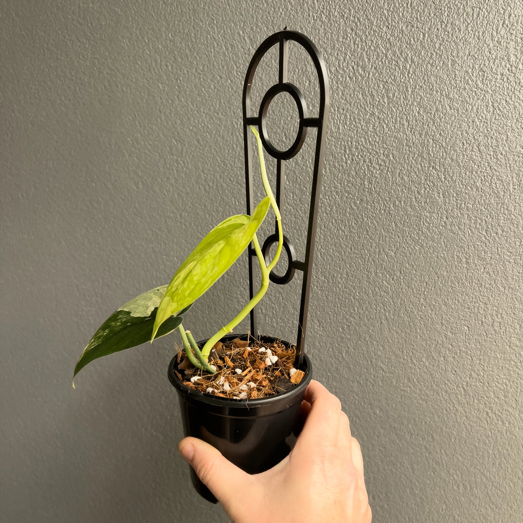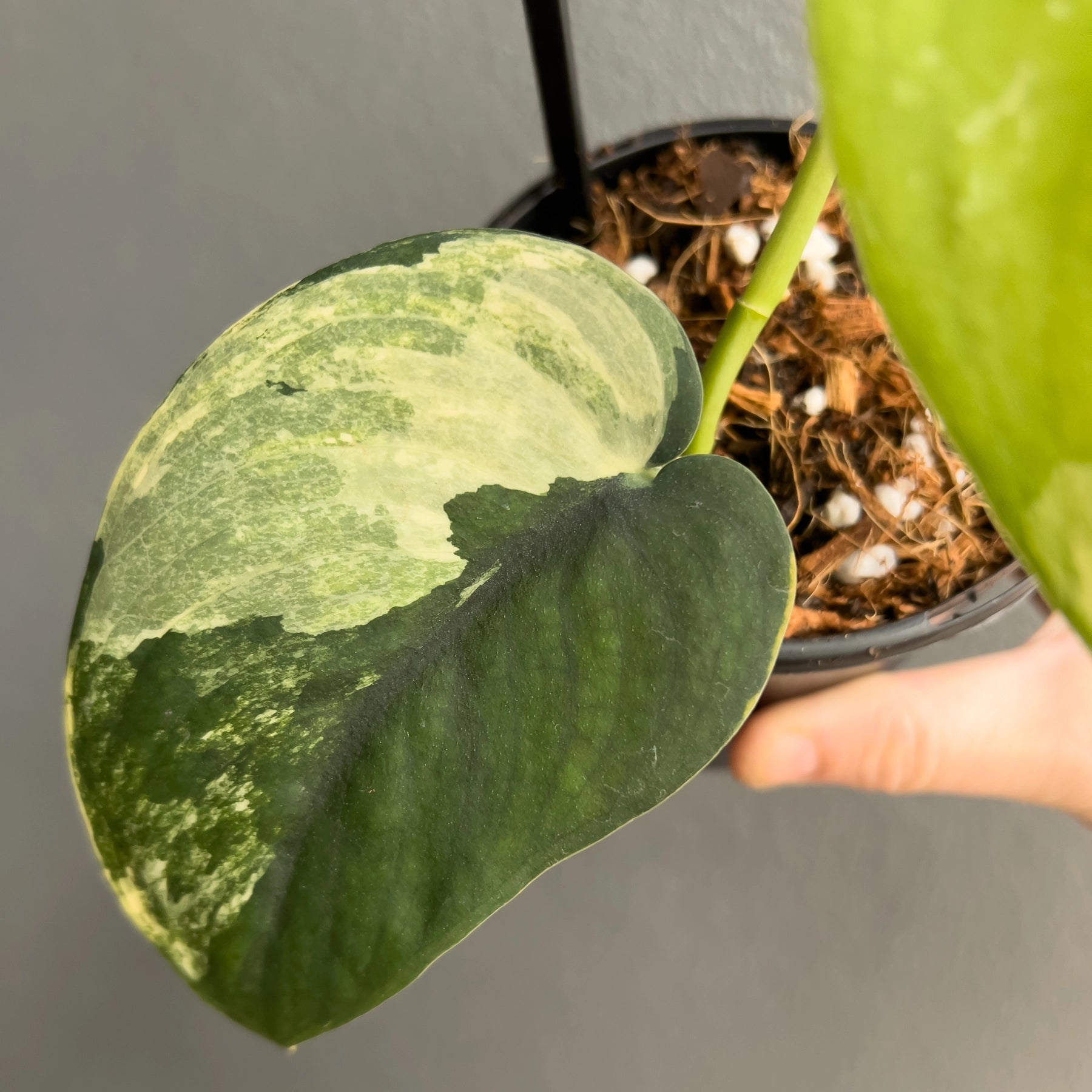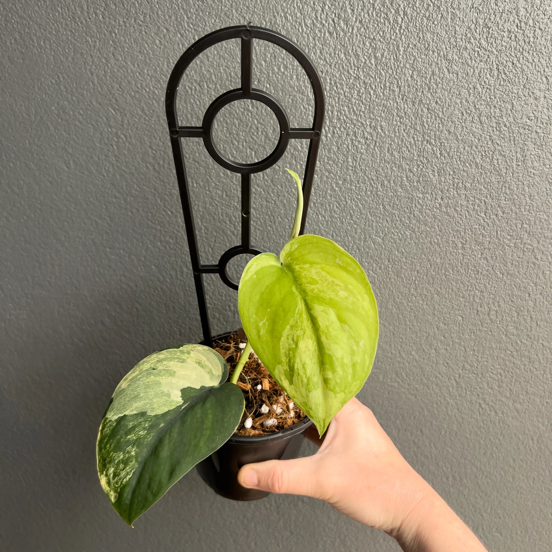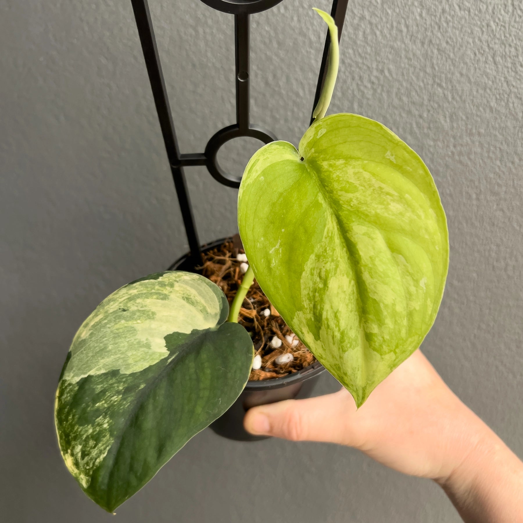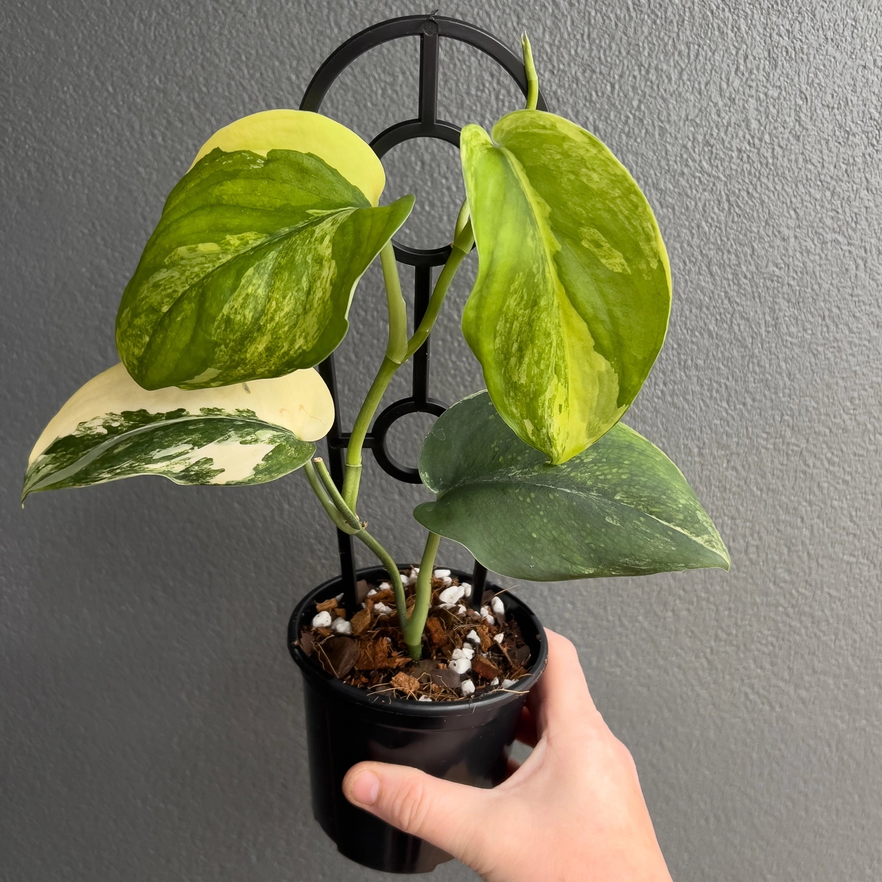 The Scindapsus pictus Jade Satin Aurea Variegated is an uncommon and stunning indoor plant known for its unique and striking foliage. The leaves are a jade green colour with a satin-like finish. Each leaf features variegated patterns of bright yellow and creamy white. The variegation can vary from subtle streaks to bold patches, making each leaf unique. The plant tends to have a trailing or climbing growth habit, making it perfect for hanging baskets or training on a trellis. Its lush, vibrant leaves add a touch of elegance and tropical beauty to any indoor space. They require bright indirect light to help brighten the yellow colour when the leaves unfurl.