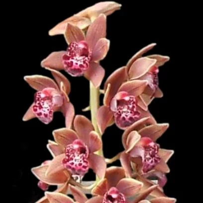 Cymbidium Kristianne 'Marie Kalimna' produces delicate, pendulous sprays of miniature blooms in soft tan to apricot tones, each flower lifted by a striking pink-speckled lip. The cascading spikes create a graceful display, contrasting beautifully against the slender green foliage. Compact in size yet full of charm, this variety is well suited to growers who enjoy orchids with a refined presence and unique colouring.