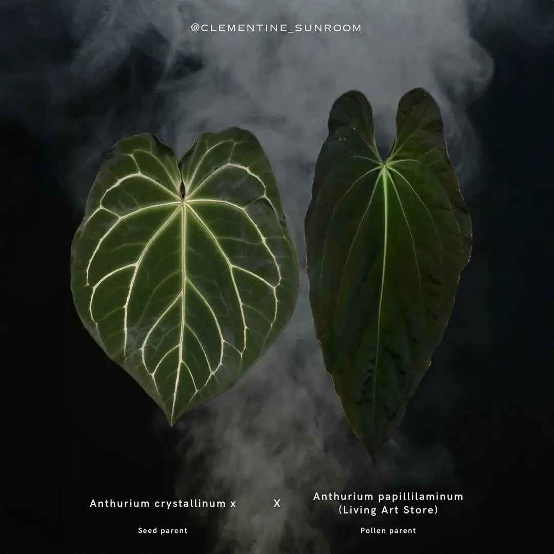 It has been crossed with Anthurium papillilaminum from Living Art Store, known for its intense dark colour and elongated dagger shaped foliage. The goal of this cross is seedlings that develop large, long velvet leaves with deeper tones and elegant, delicate veining as they mature.