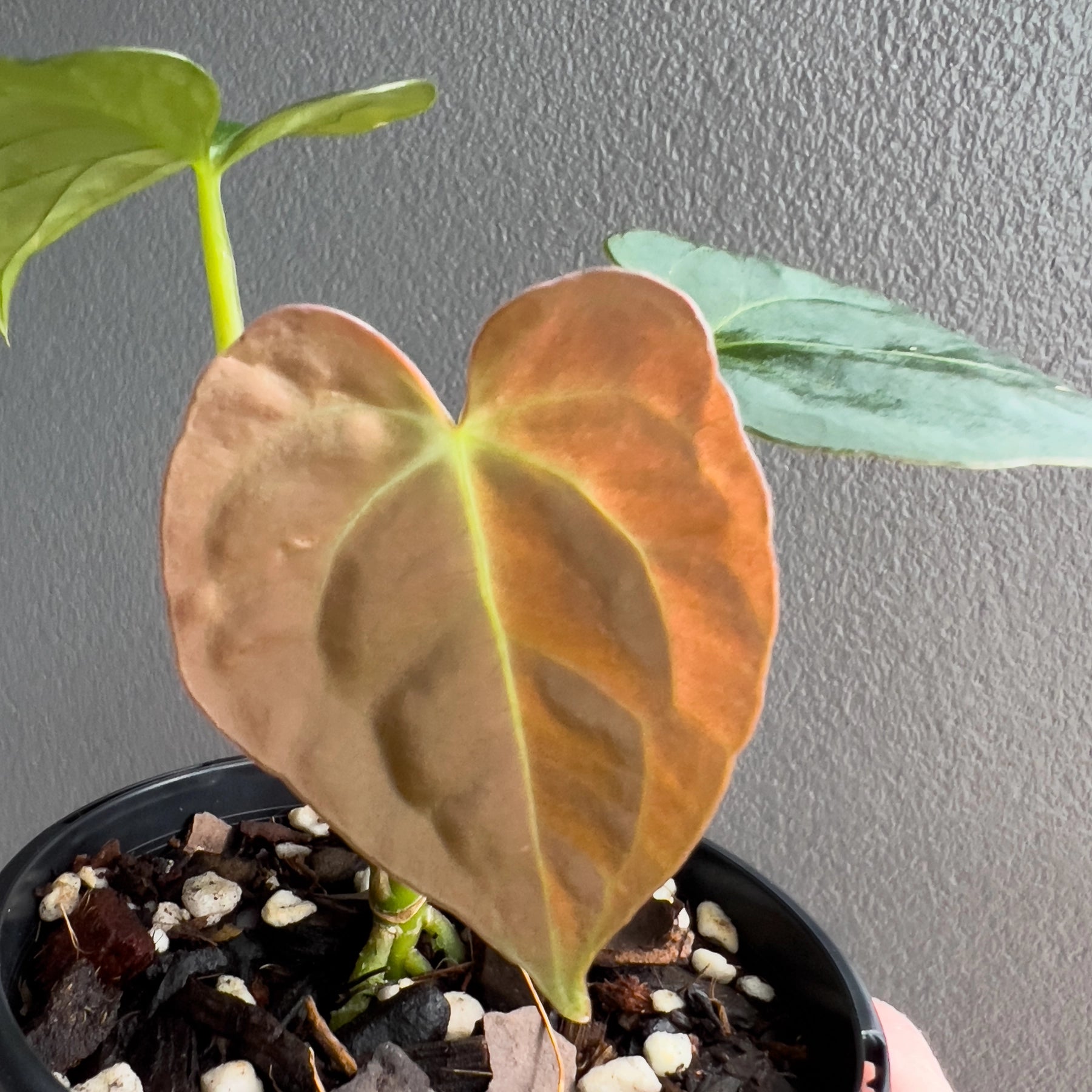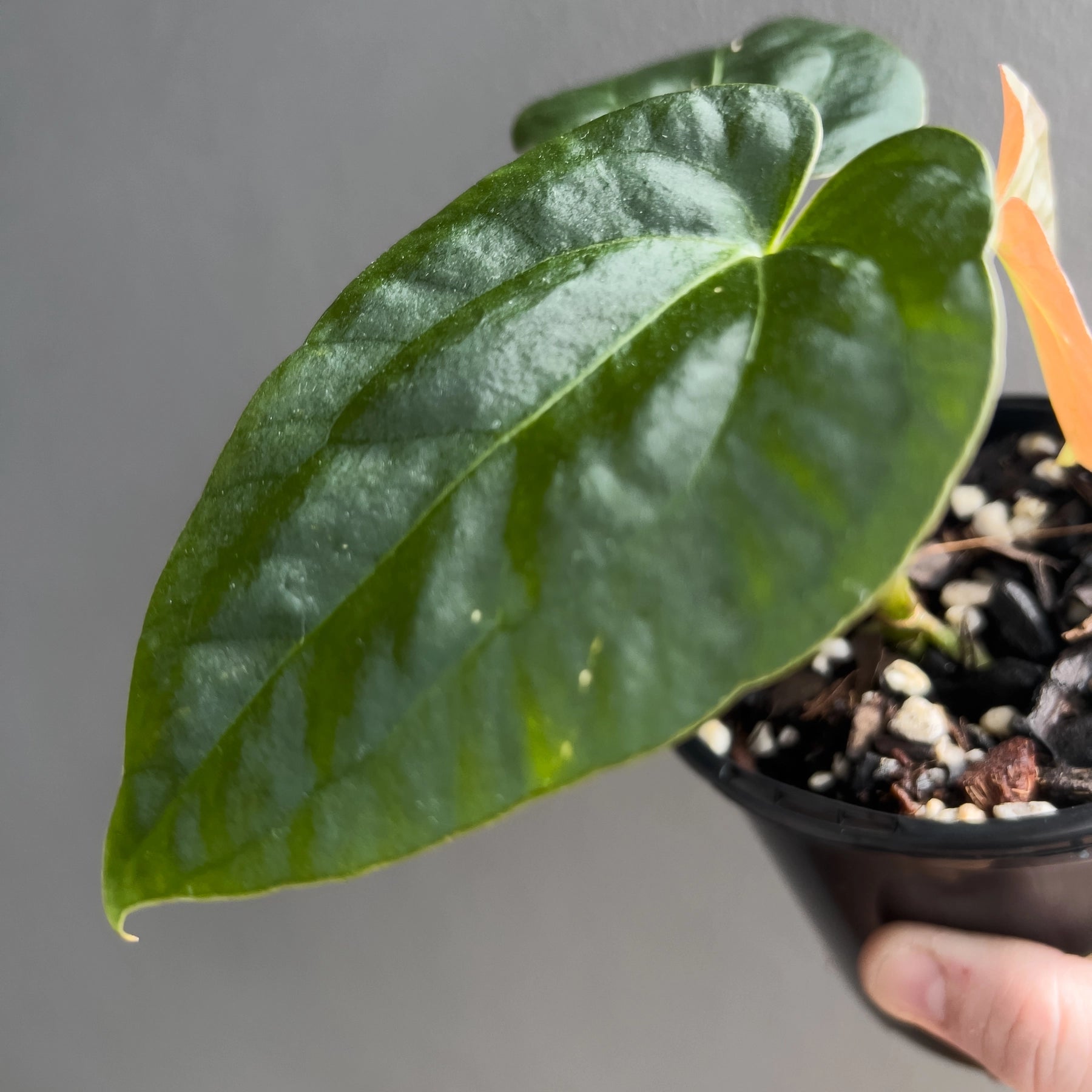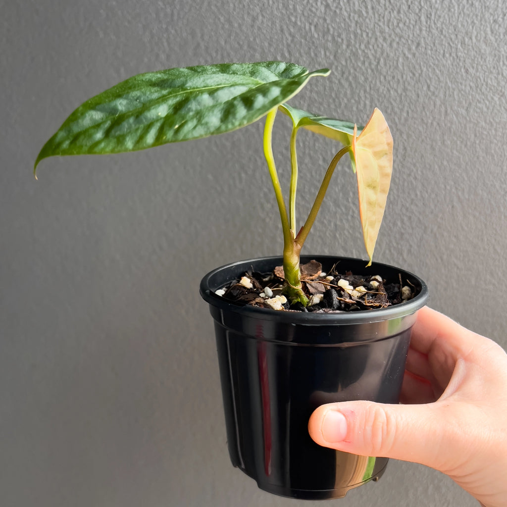 This Anthurium ((papillilaminum x dressleri) x dark crystallinum) combines Anthurium papillilaminum x dressleri from J & S Plant Pickers with Anthurium dark crystallinum from Decoflora. The seed parent was produced by Decoflora, making this cross a true collector’s piece. The foliage is broad and heart-shaped with a velvety surface and prominent venation. Mature leaves darken to a rich green, with striking silver-green veins, while new leaves often emerge with bronze tone before hardening off. The Anthurium papillilaminum x dressleri contributes refinement in shape and texture, while the crystallinum heritage strengthens the venation and structure. We expect this hybrid to be bold and a standout for collectors.