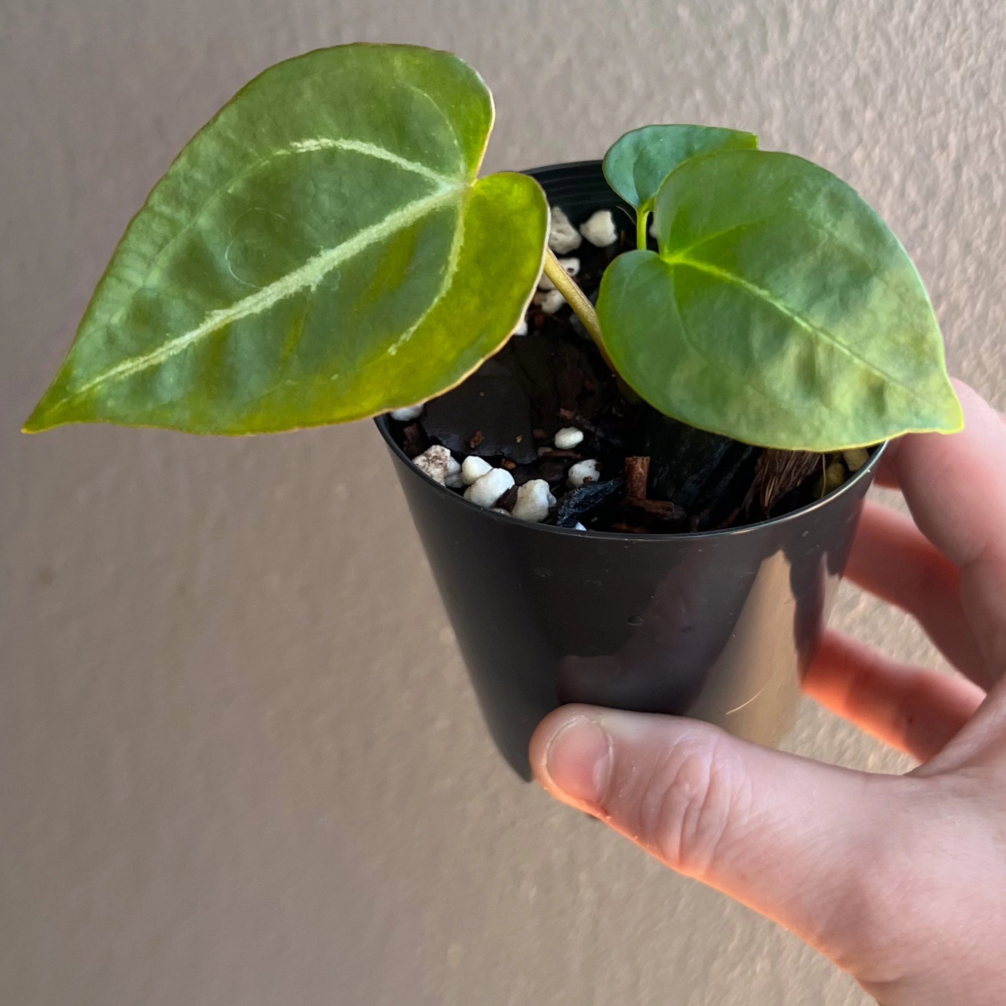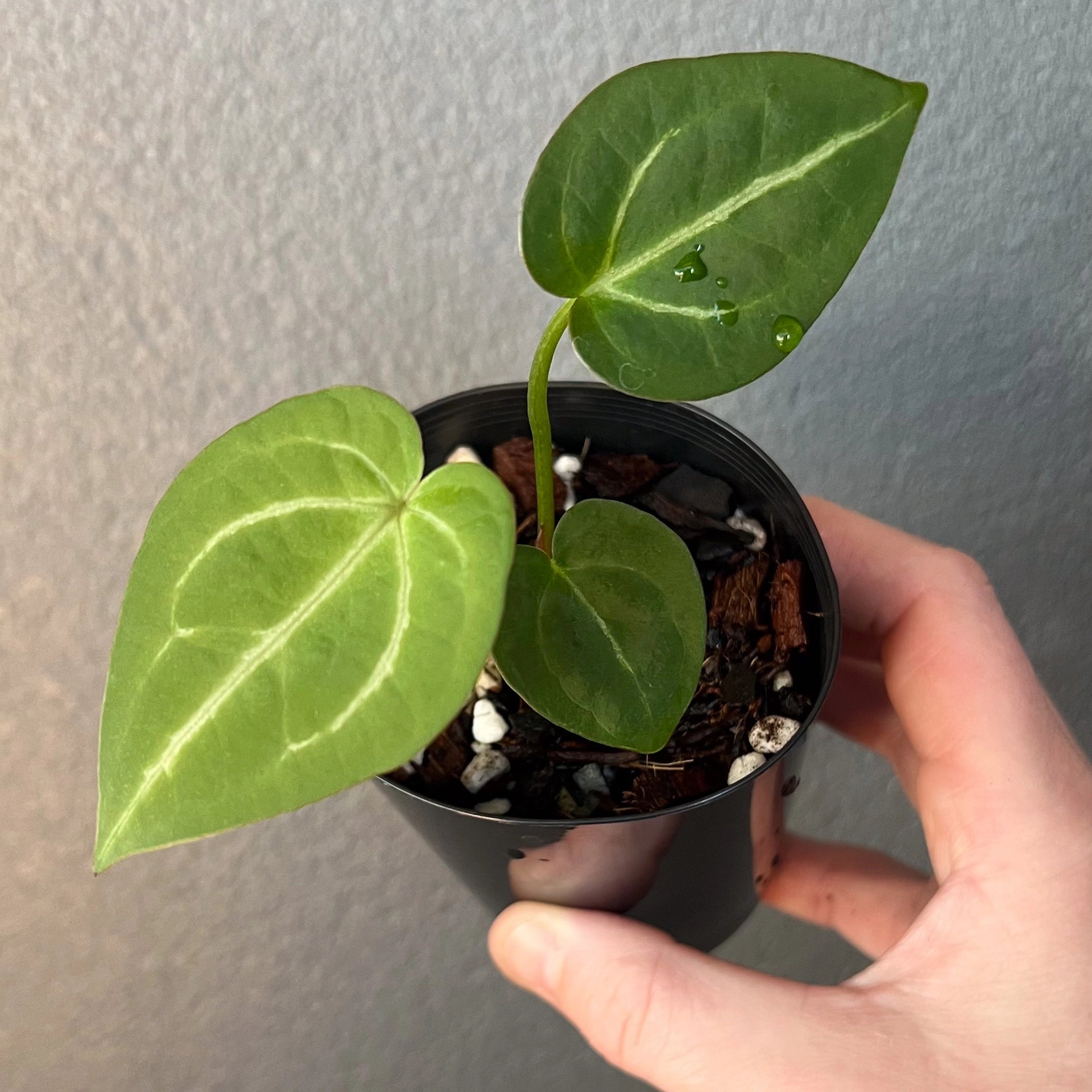 Anthurium ((crystallinum x magnificum) x warocqueanum) x Anthurium crystallinum Hybrid. Also known as the Anthurium 'Royal Gems' Hybrid, it brings together the striking qualities of Anthurium crystallinum, magnificum, and warocqueanum. Known by the grower as ‘Royal Gems’, these plants feature bold, velvety leaves with strong venation and a regal presence. The mix of genetics gives them a balance of large, elongated leaf shapes with shimmering silver veins and impressive structure. Each plant will show its own variation, making them a standout addition to any rare Anthurium collection.