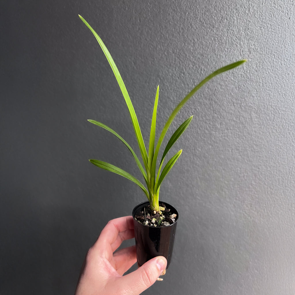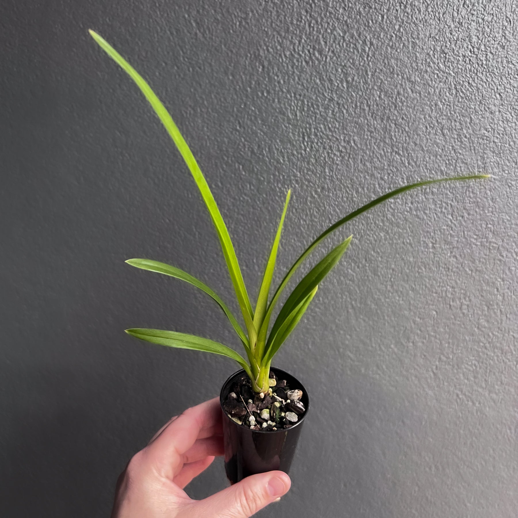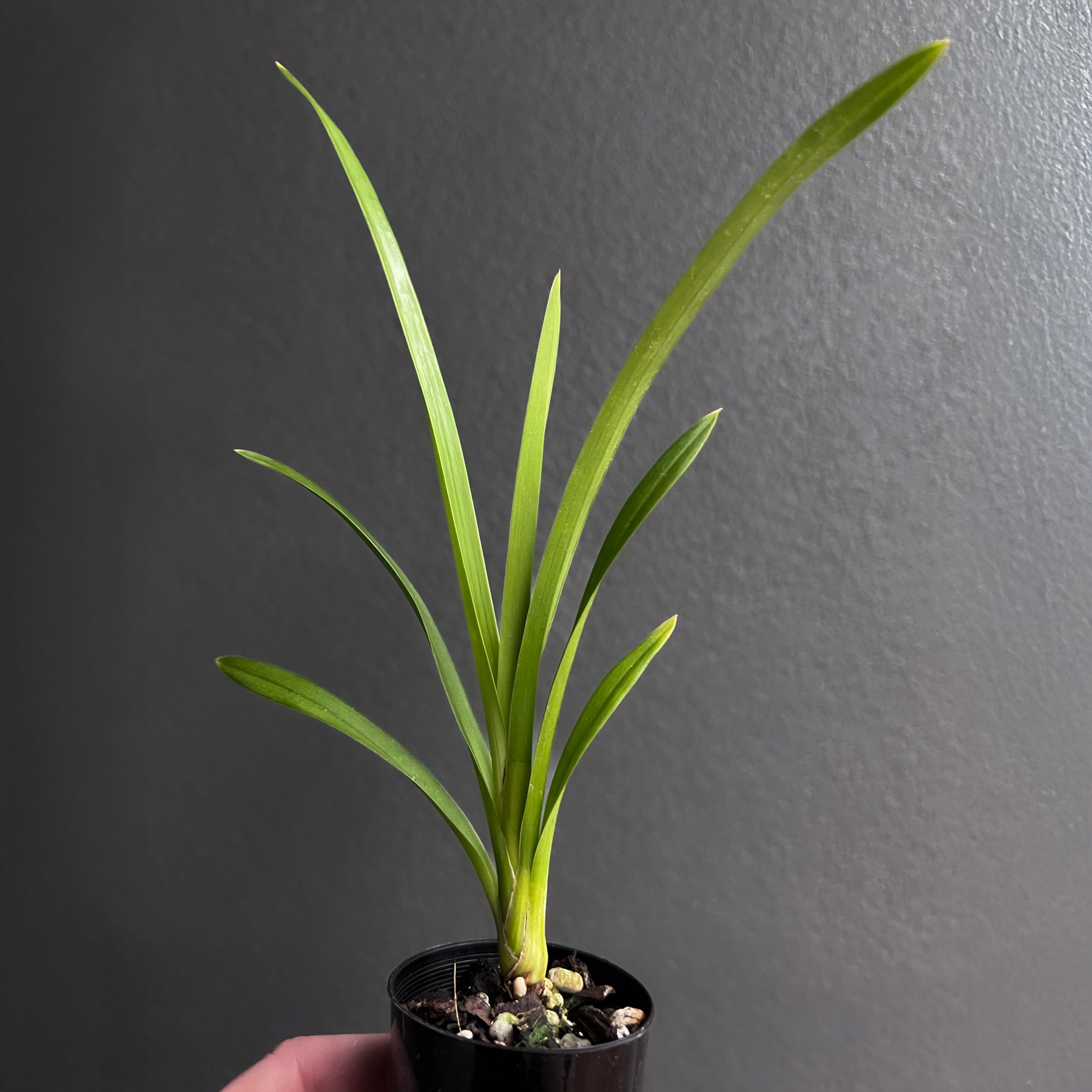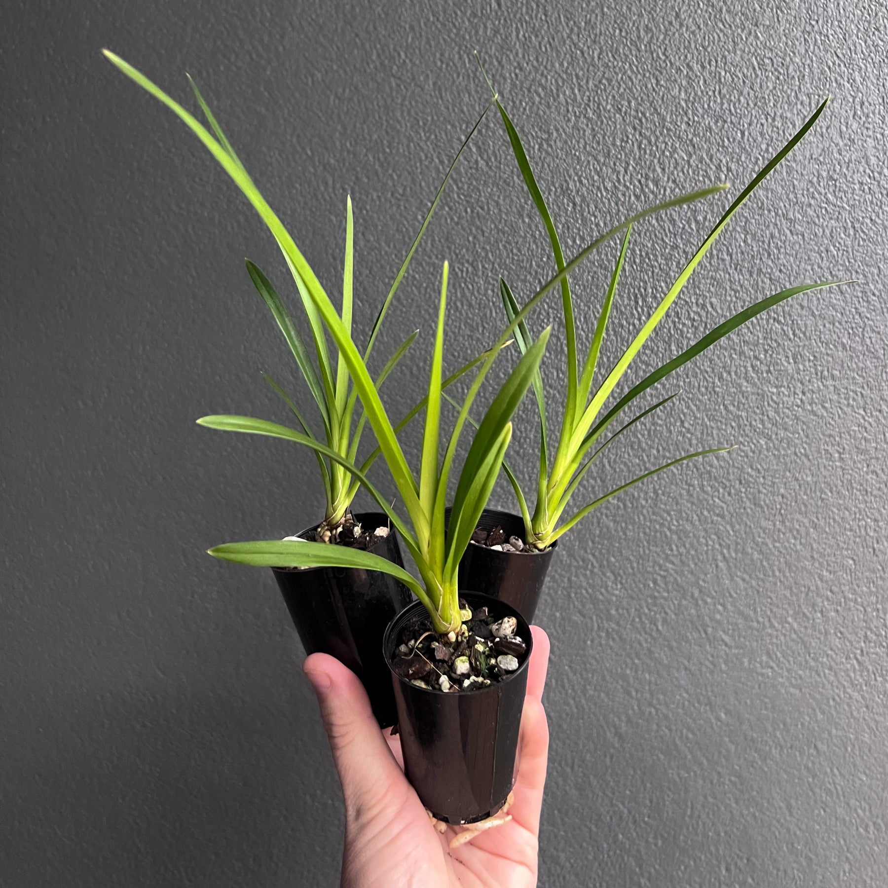 These are Cymbidium seedlings bred from two RHS-registered show lines. Cym. Ultimate Dream 'Sorbet' (Purely Dreaming x Ultimate Ray, registered 2021) carries a high contribution from insigne, lowianum and hookerianum, which give large, well-shaped blooms, strong stems and mid to late season timing. Its pastel tones and rounded form make it a favourite in exhibition breeding.