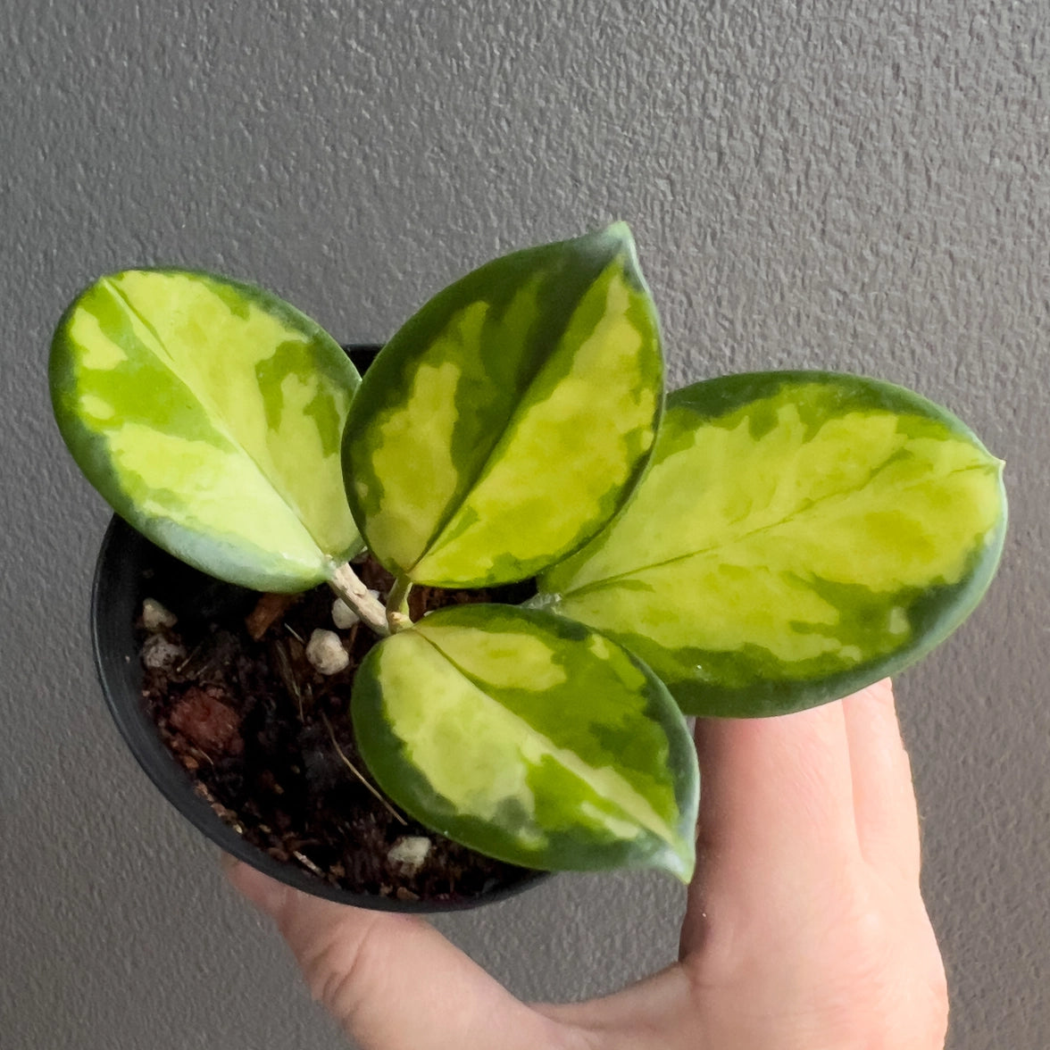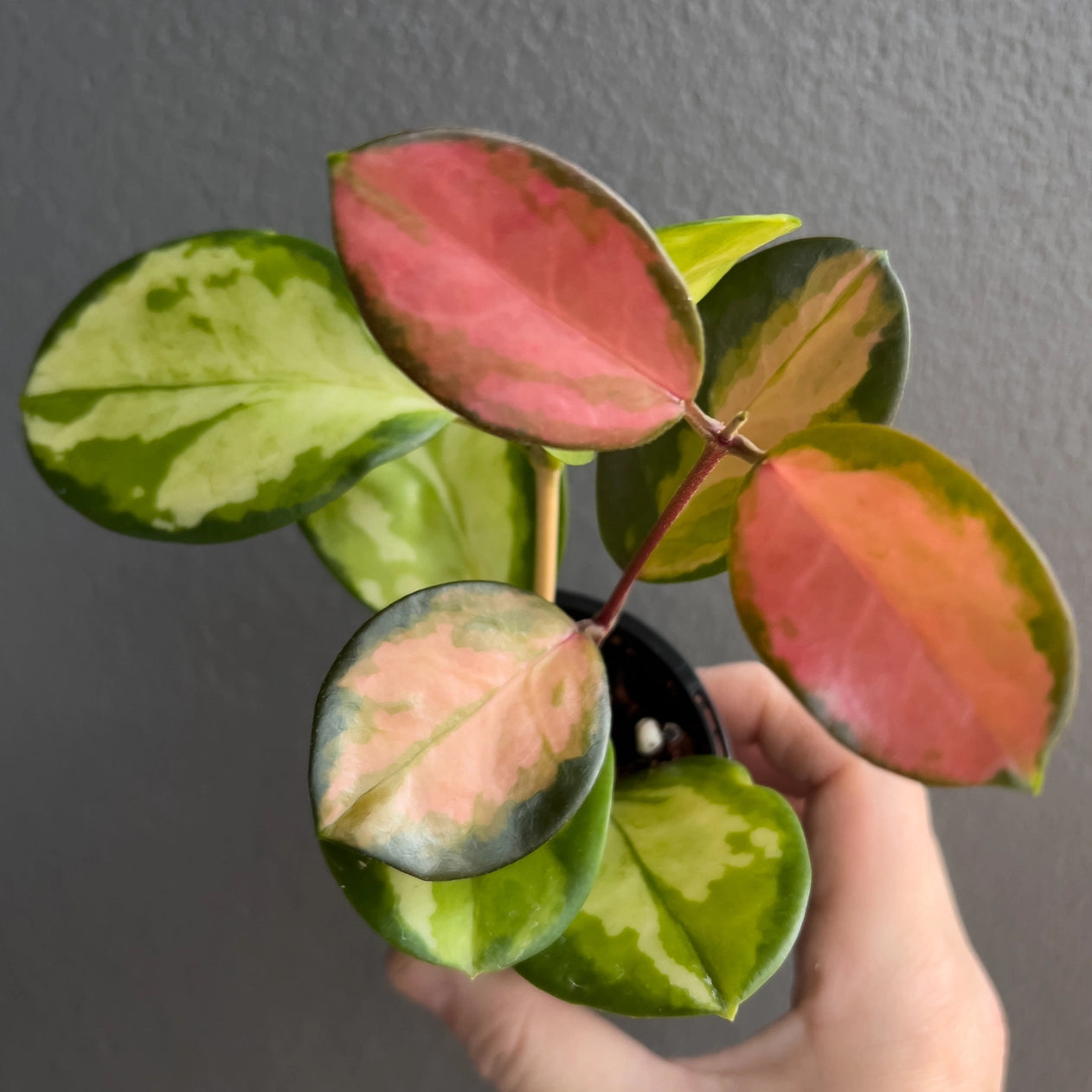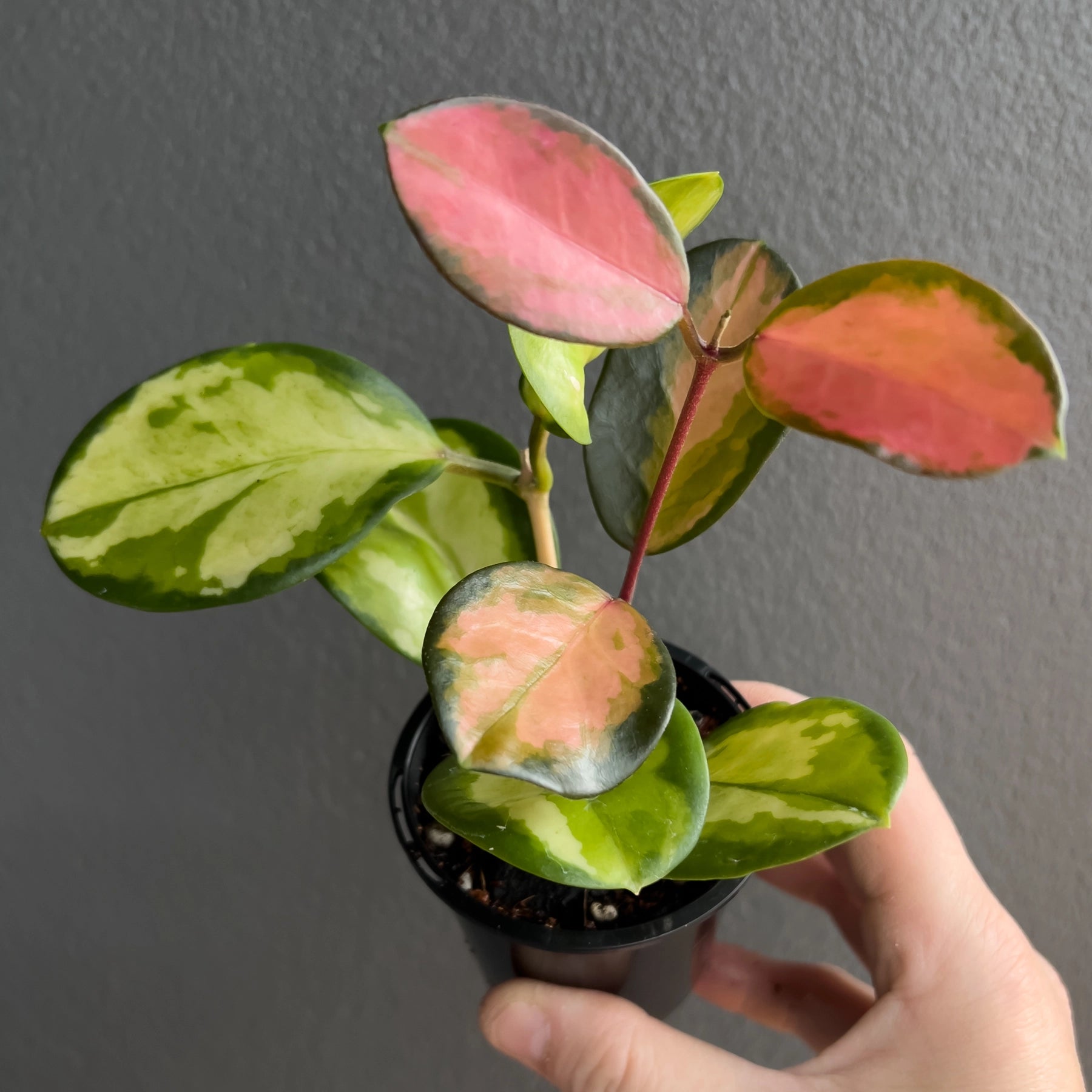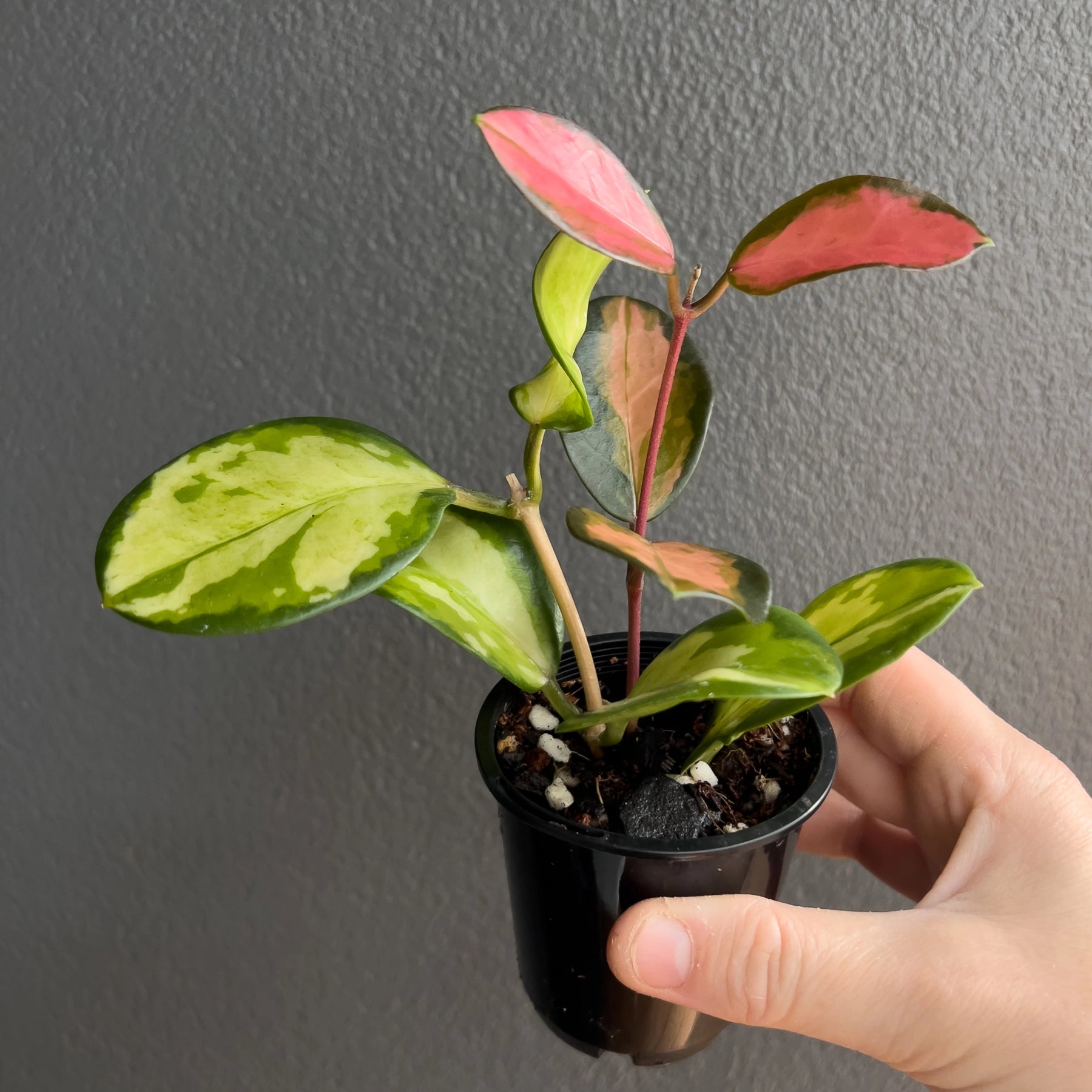 Hoya australis 'Lisa', commonly known as Hoya 'Lisa' is a striking variegated version of the Hoya australis. As a variegated plant, you may occasionally notice leaves that resemble the standard australis variety. What sets the Hoya 'Lisa' apart is its tricoloured leaves in shades of green, pink, and pale chartreuse. This particular variety showcases a natural climbing tendency, gracefully ascending any support it encounters.