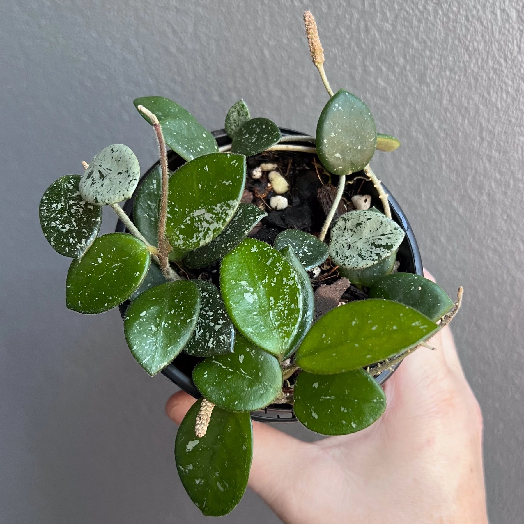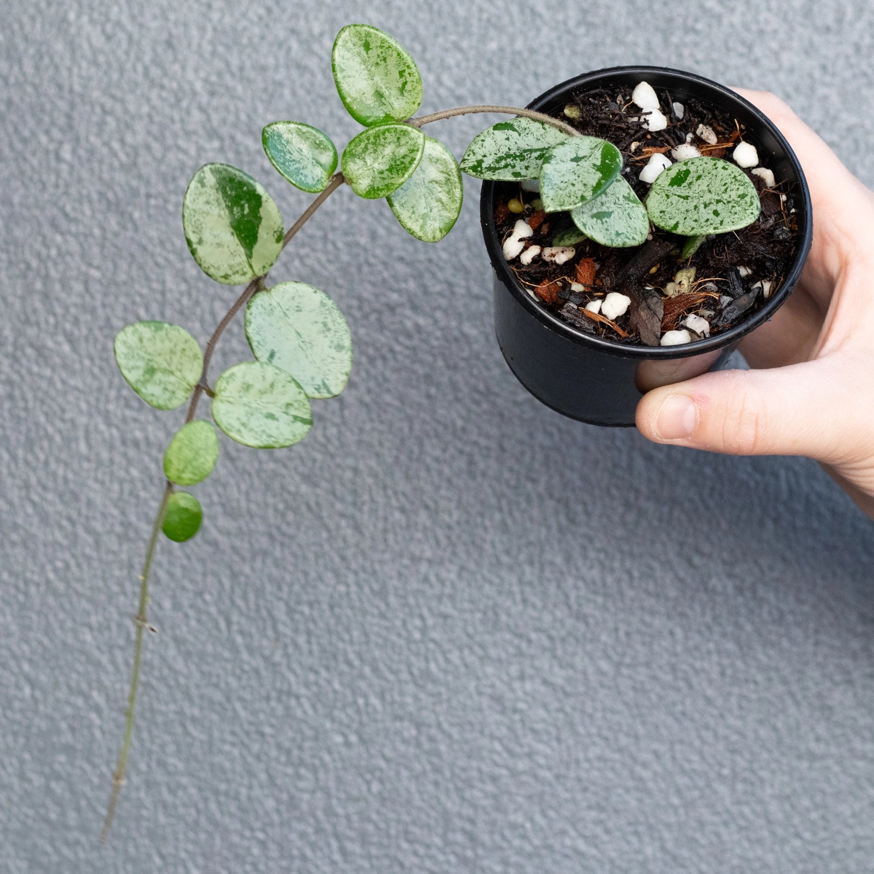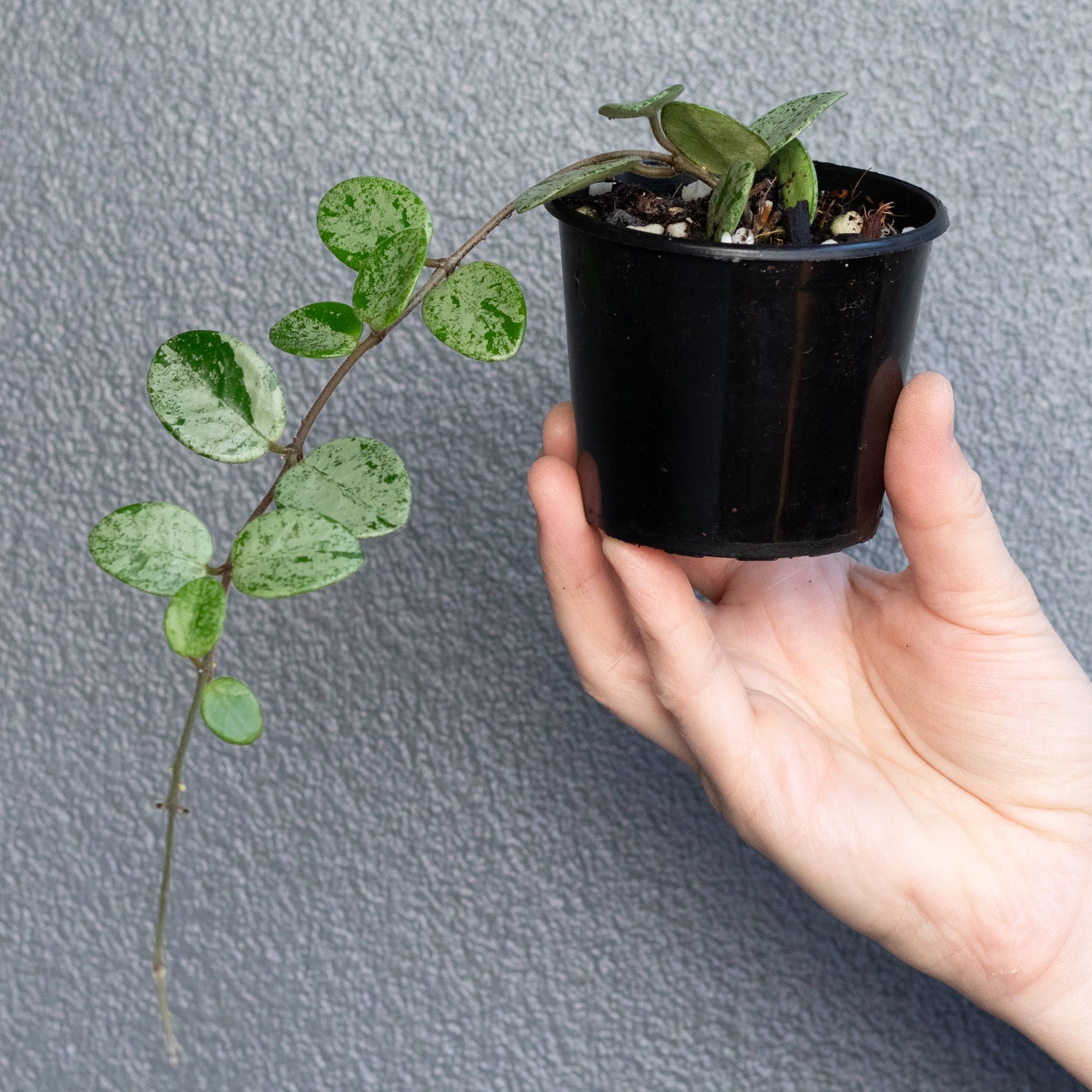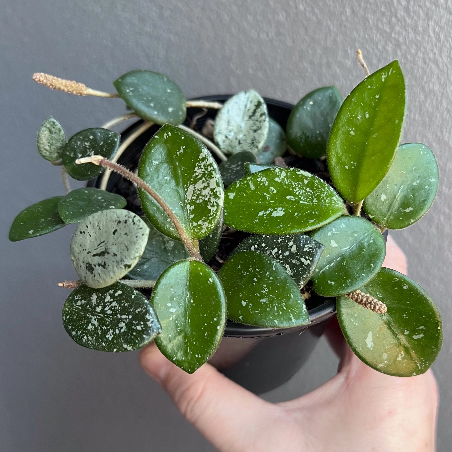The Hoya mathilde 'Splash' is a gorgeous plant with small, splashy leaves measuring approximately 2cm x 1.5cm. It is a resilient and fast-growing plant with thick, rounded green leaves. The leaves display random silver speckling, which can become more pronounced when the plant is positioned in a well-lit area. While it can trail downwards, it readily climbs nearby structures. The Hoya mathilde 'Splash' produces lovely baby pink flowers that emit a gentle and sweet fragrance. It blooms early and frequently. The Hoya mathilde 'Splash' is a hybrid of the Hoya carnosa and the Hoya serpens. The flowers are flat and pubescent, measuring up to 15mm in diameter. They feature a red-centred baby pink corona and typically appear in clusters of up to 16 flowers per umbel. These nectar-producing flowers exude a delightful scent lasting up to five days.