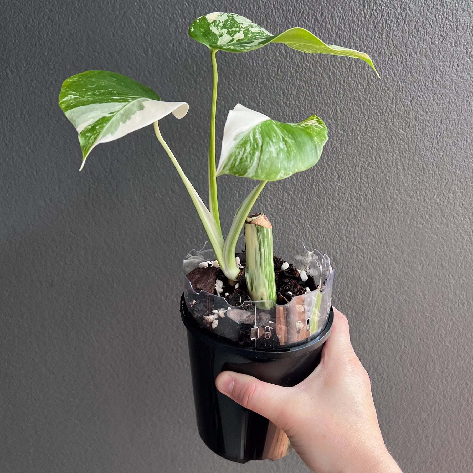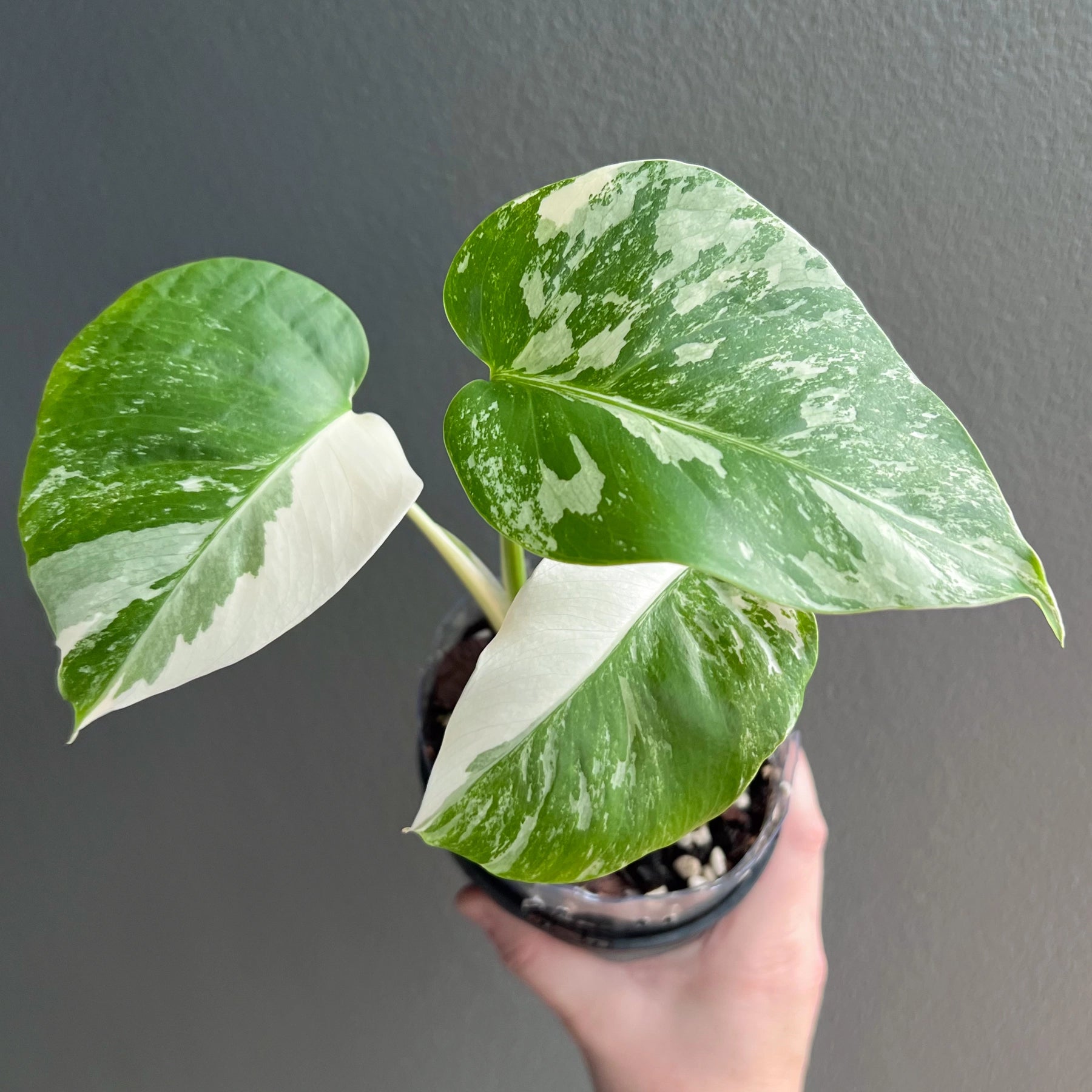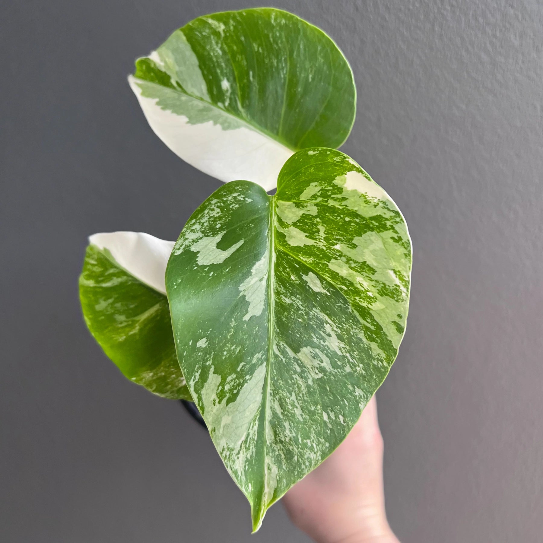 These Monstera deliciosa Borsigiana Albo are from the enliven Platinum Collection. The Monstera deliciosa Borsigiana Albo has variegated green and white leaves, which are either splashes or blocked areas of white on the green leaves. Much like its close relative, the Monstera deliciosa, the leaves of Monstera deliciosa Borsigiana Albo fenestrate as the plant matures. They thrive in bright, indirect light, a higher humidity of around 70%, a warm environment over 18deg, and evenly moist soil. The variegation in Monstera deliciosa Borsigiana Albo is caused by a genetic mutation that affects chlorophyll production. The result is those beautiful white or pale green variegated areas on the leaves.