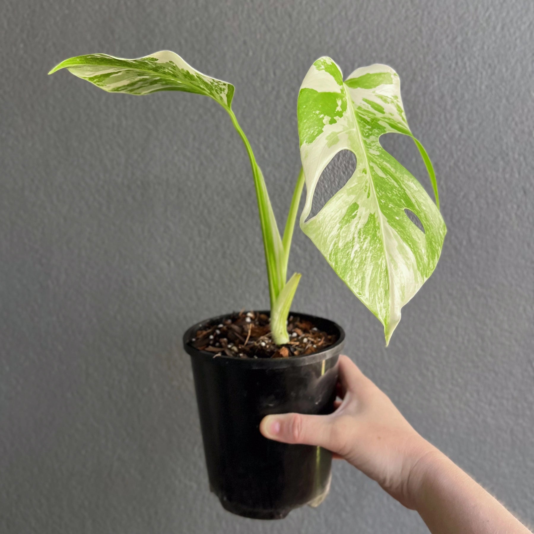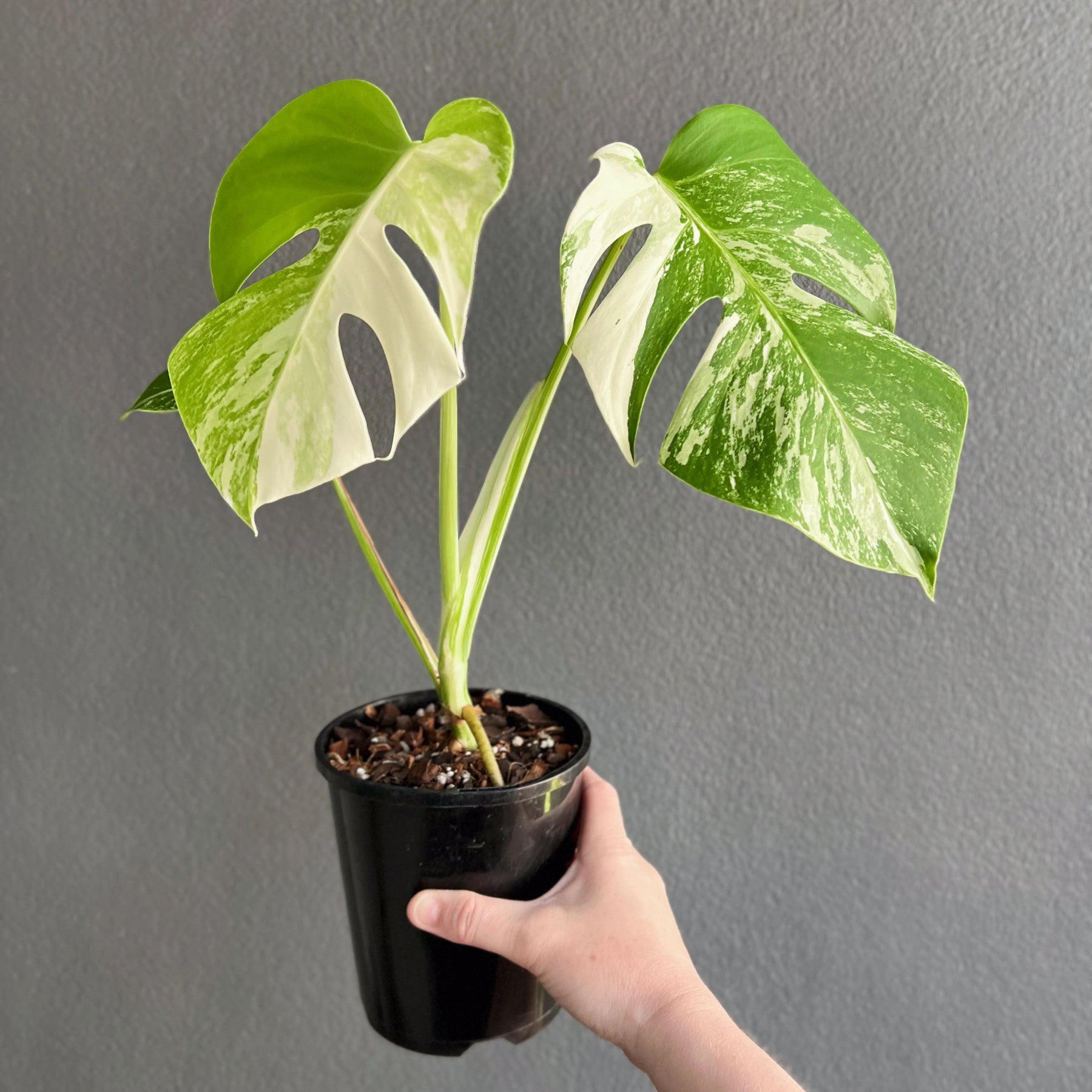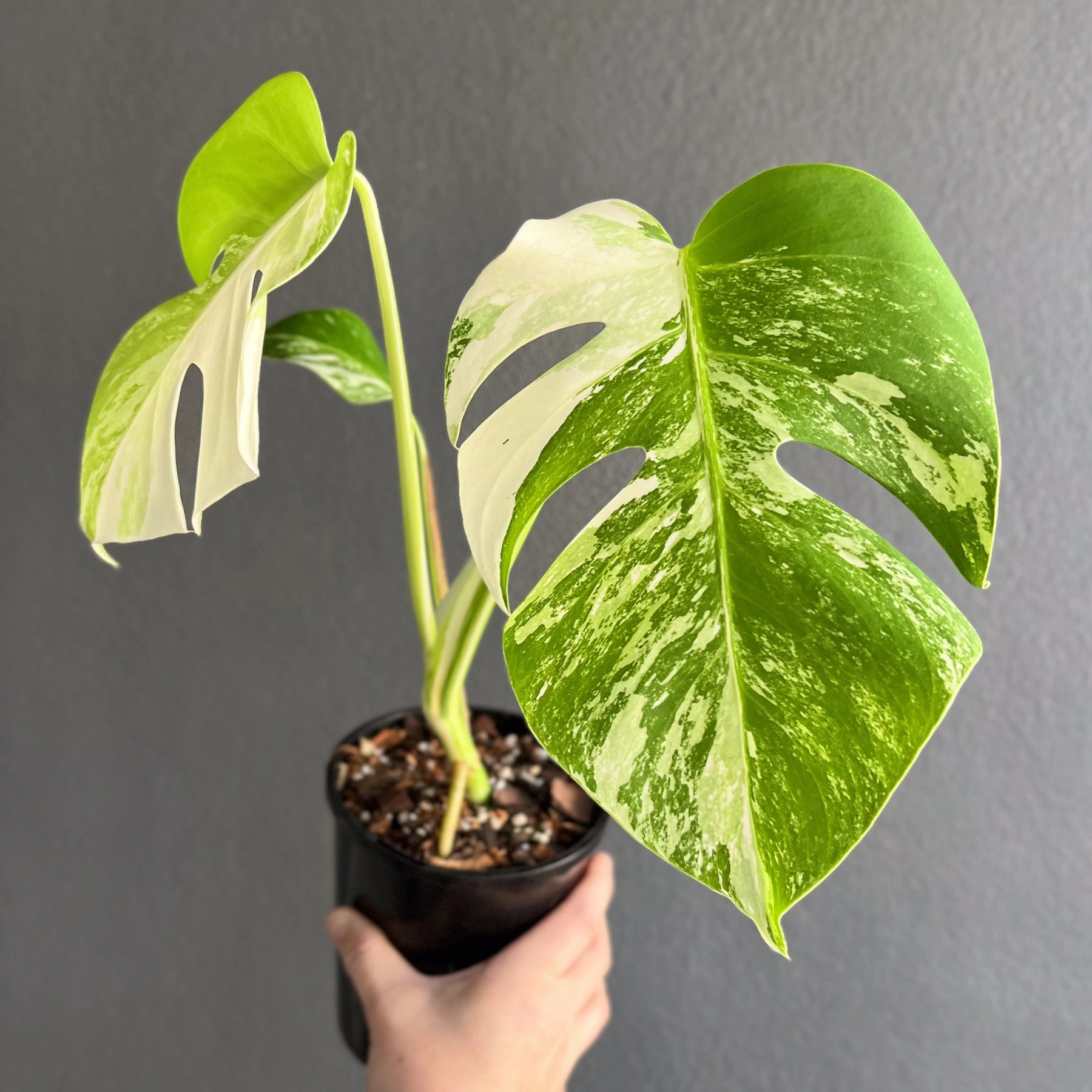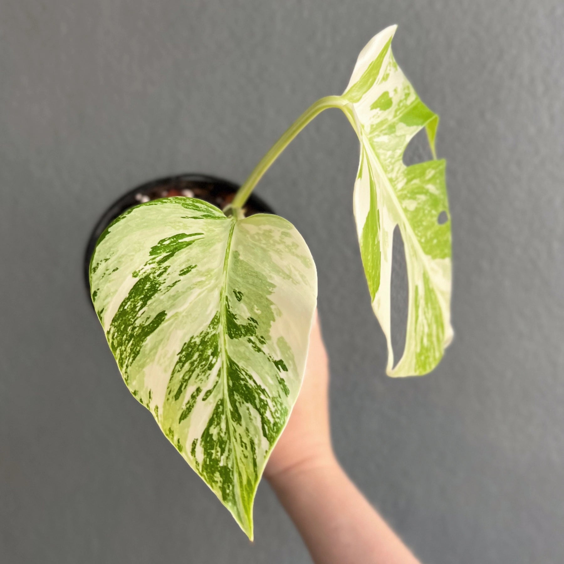 These Monstera deliciosa Borsigiana Albo are from the enliven Platinum Collection. The Monstera deliciosa Borsigiana Albo has variegated green and white leaves, which are either splashes or blocked areas of white on the green leaves. Much like its close relative, the Monstera deliciosa, the leaves of Monstera deliciosa Borsigiana Albo fenestrate as the plant matures. They thrive in bright, indirect light, a higher humidity of around 70%, a warm environment over 18deg, and evenly moist soil. The variegation in Monstera deliciosa Borsigiana Albo is caused by a genetic mutation that affects chlorophyll production. The result is those beautiful white or pale green variegated areas on the leaves.