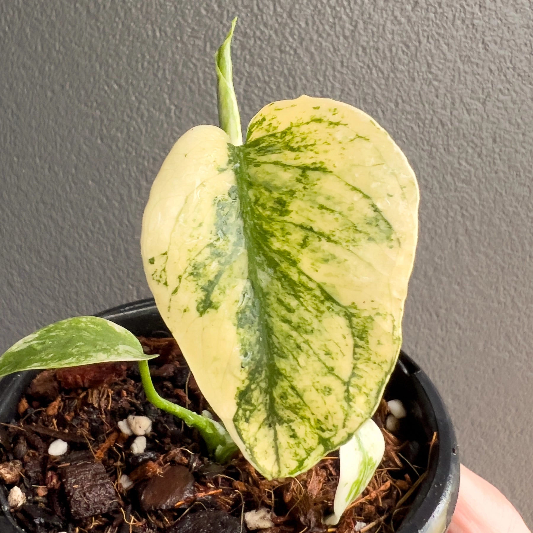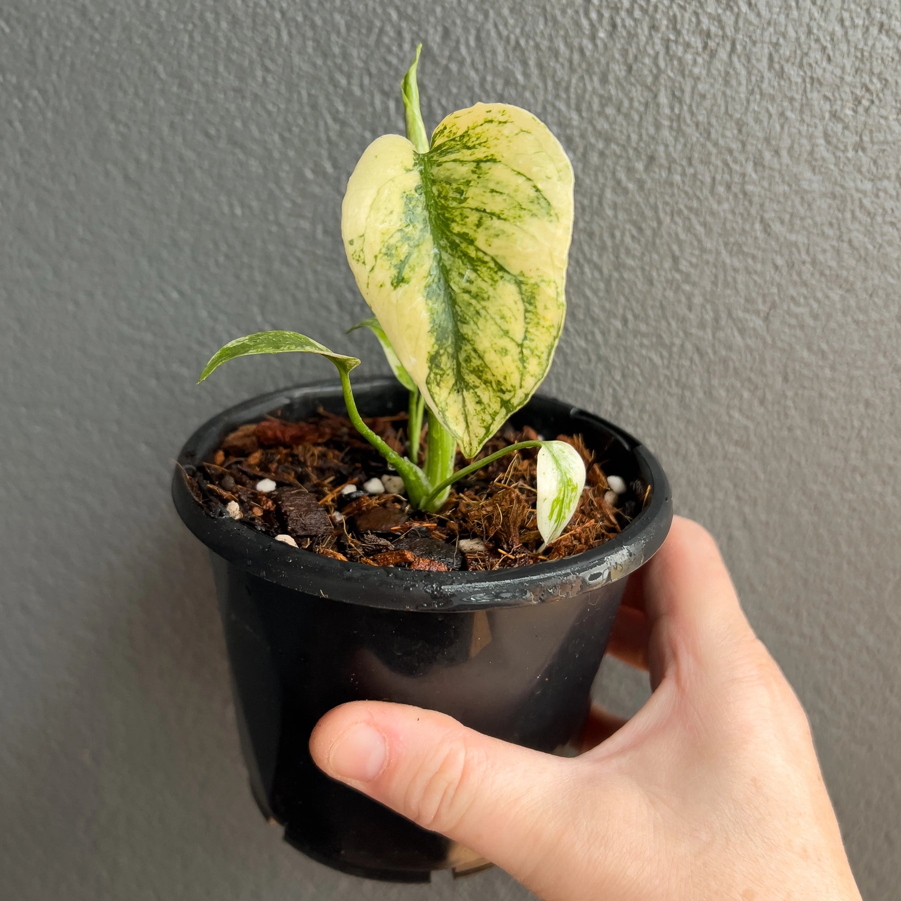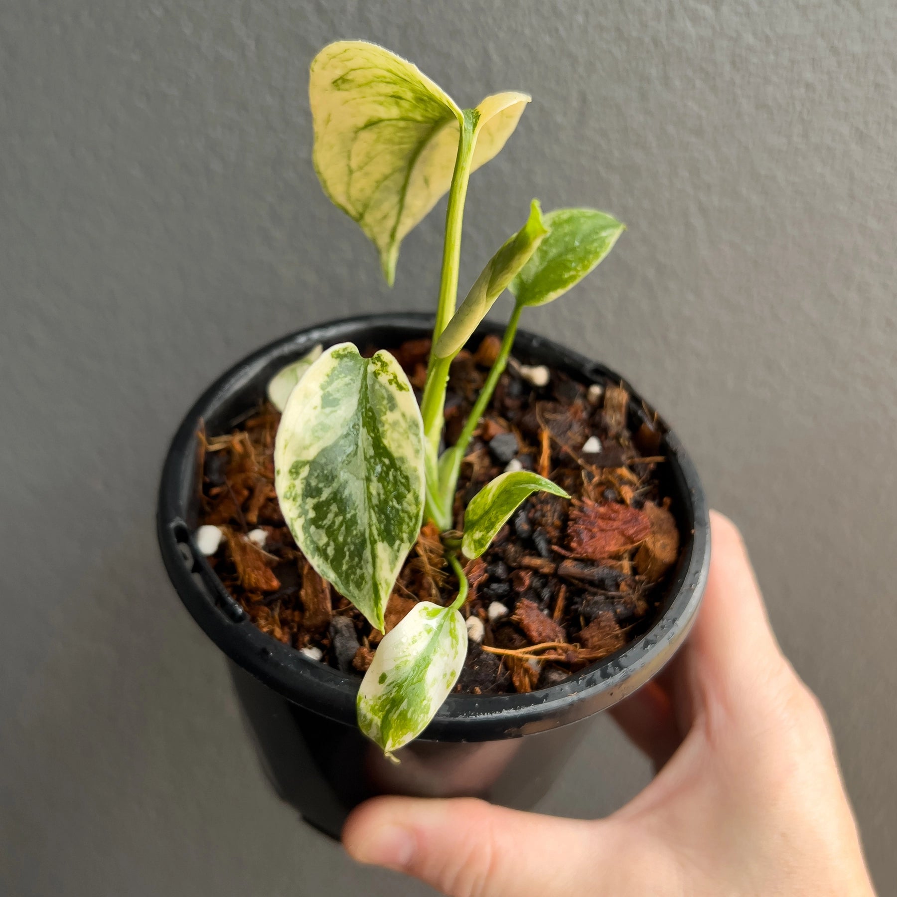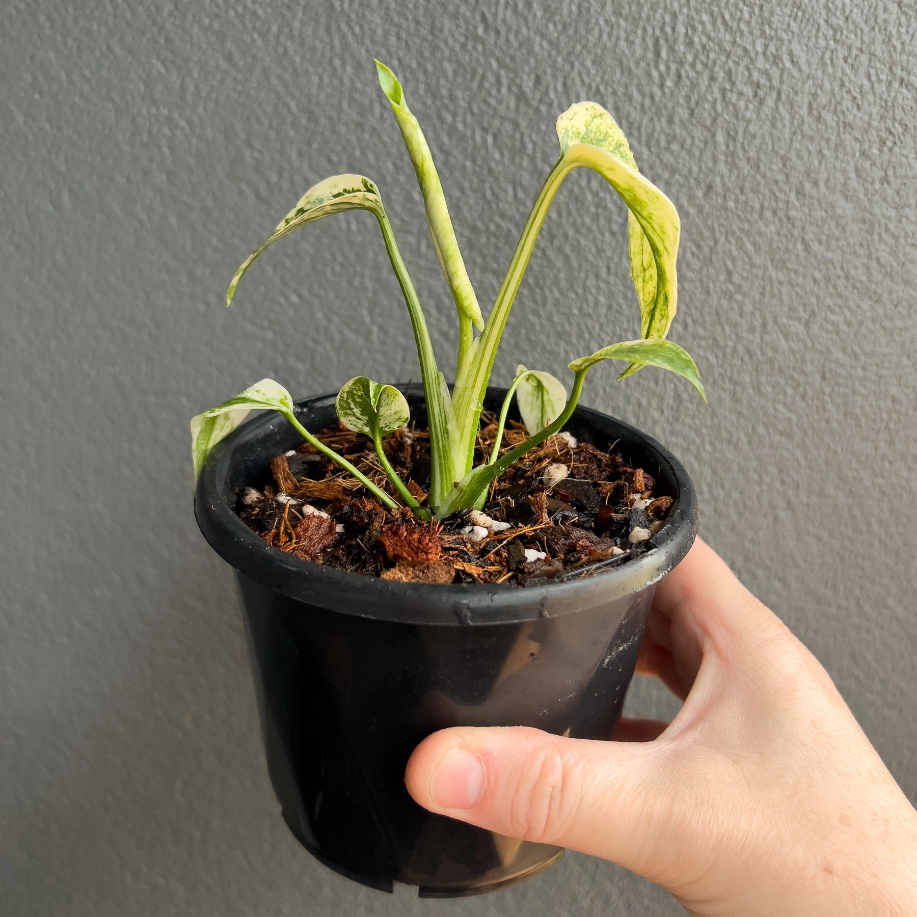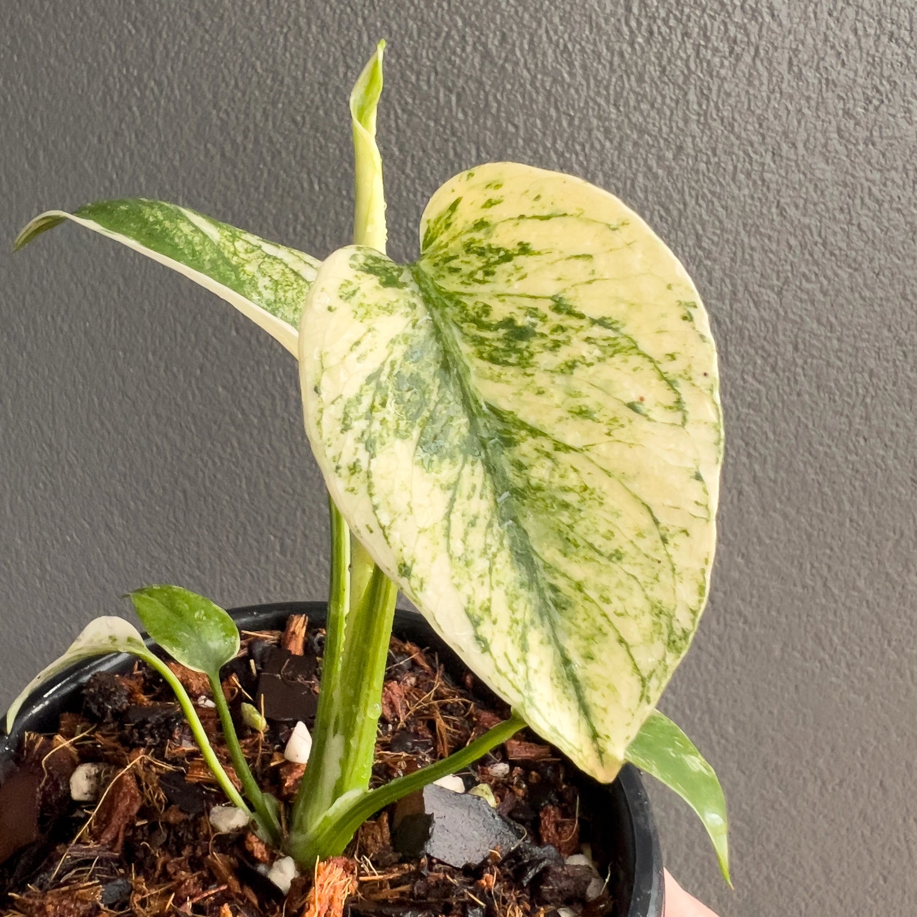 Monstera deliciosa Mint Variegated is a highly sought after form of Monstera with soft mint to pale green variegation layered through broad, fenestrated leaves. Variegation appears as marbling, mottling, and gentle sectoral patches, giving each leaf a slightly different look. Best grown in bright indirect light to maintain colour, this plant will climb with support and develop larger, fenestrated foliage over time.