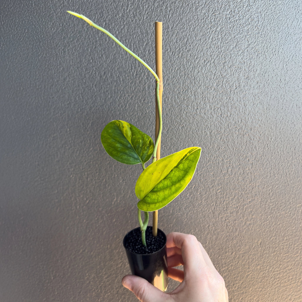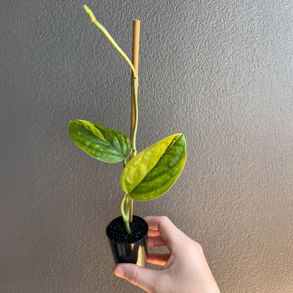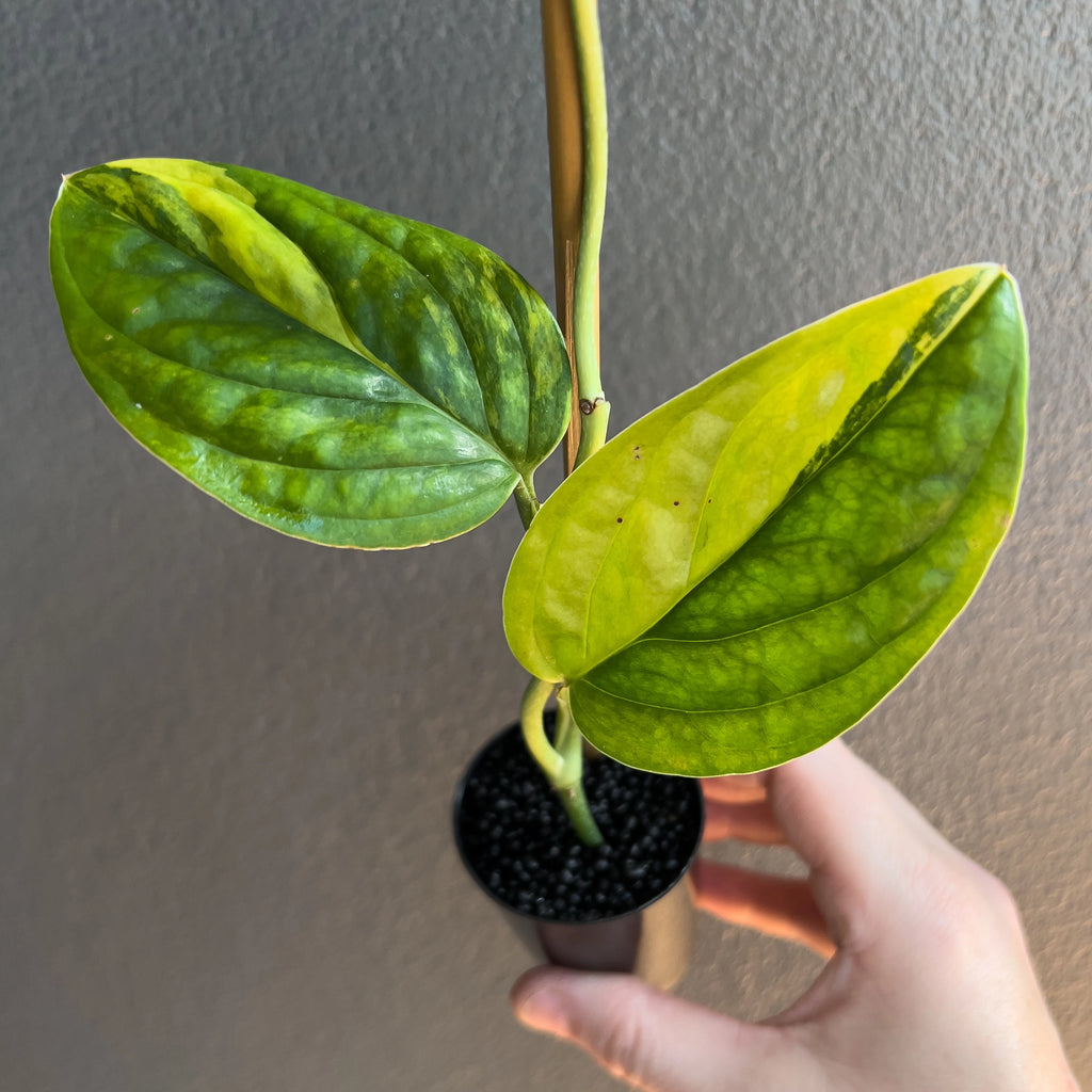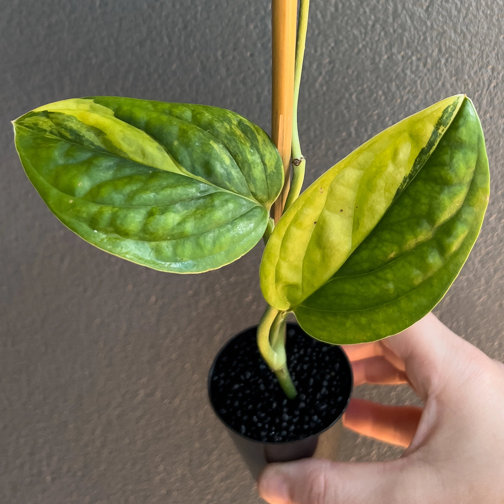 Monstera Peru variegated (Early Stage Start) shows bright cream and lime variegation across the textured leaves and has established node roots ready to grow on in a perlite base with a stratum topper. This is a small early stage tip cutting with strong colour and many growth point. It will continue to root quickly once kept warm with steady moisture.