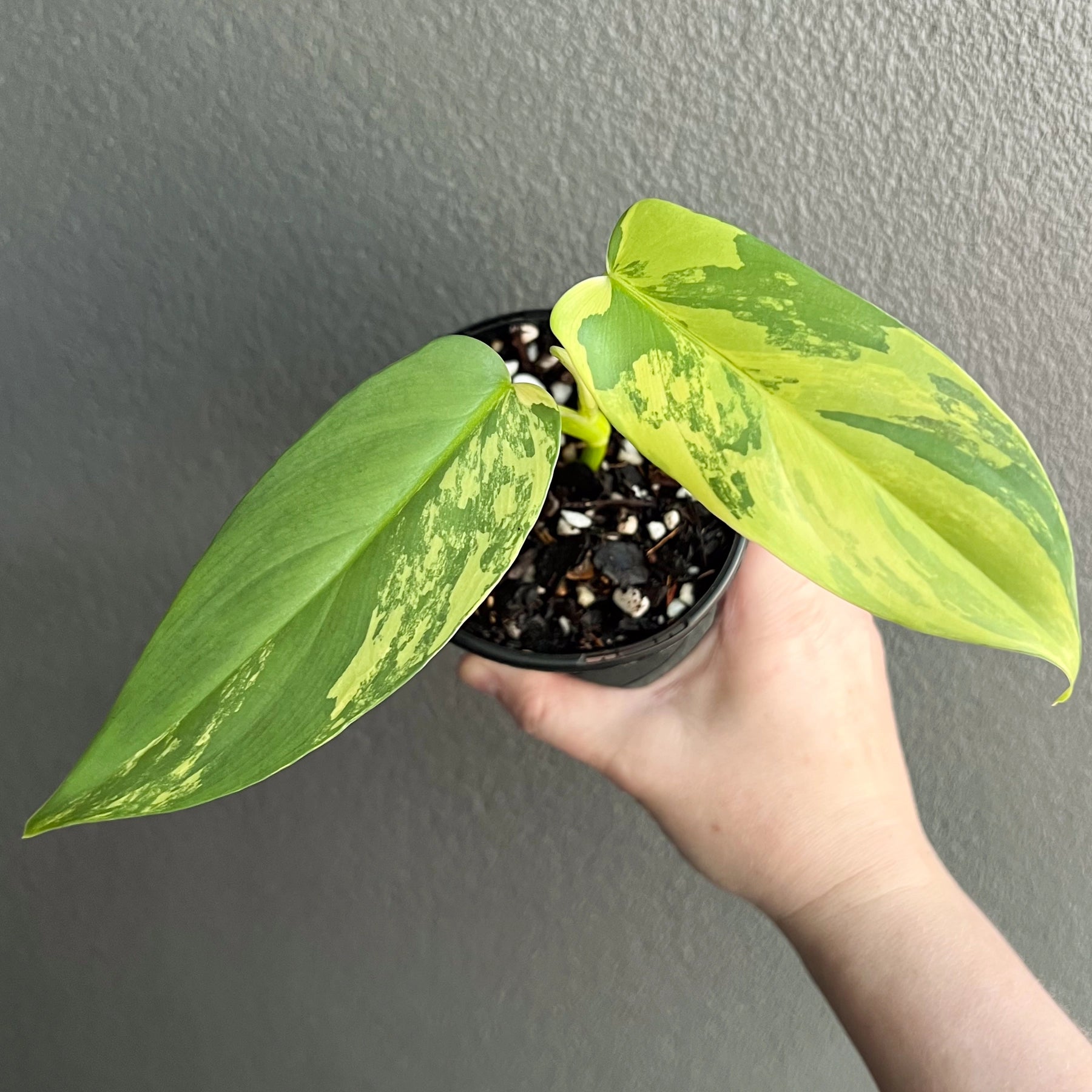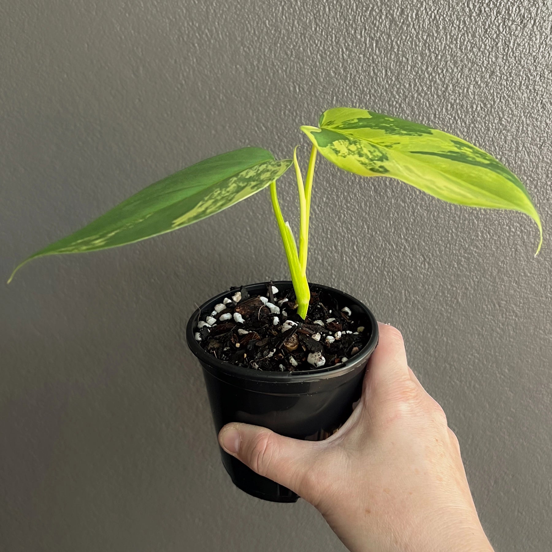 The Philodendron bipennifolium variegated is a true collector’s piece, with its distinctive horsehead-shaped leaves and stunning cream, mint, and green marbling. No two leaves are alike, with each new leaf bringing fresh variation and surprise. This climber thrives in bright, indirect light and benefits from support as it matures. Known for its impressive leaf shape and variegation pattern, this variety is highly sought after and performs best with consistent warmth and humidity. A rewarding plant that adds dramatic interest to any rare aroid collection.
