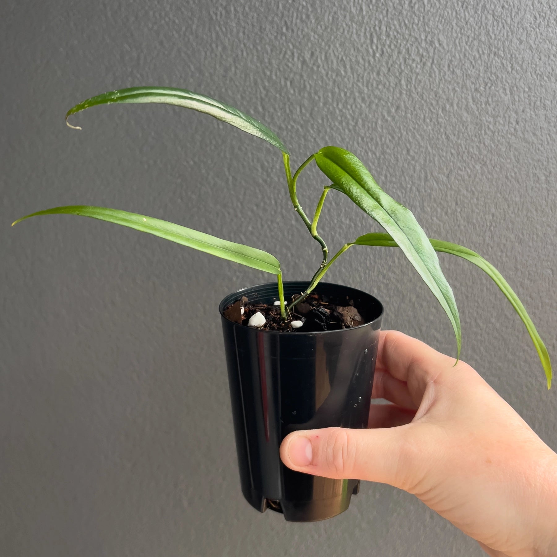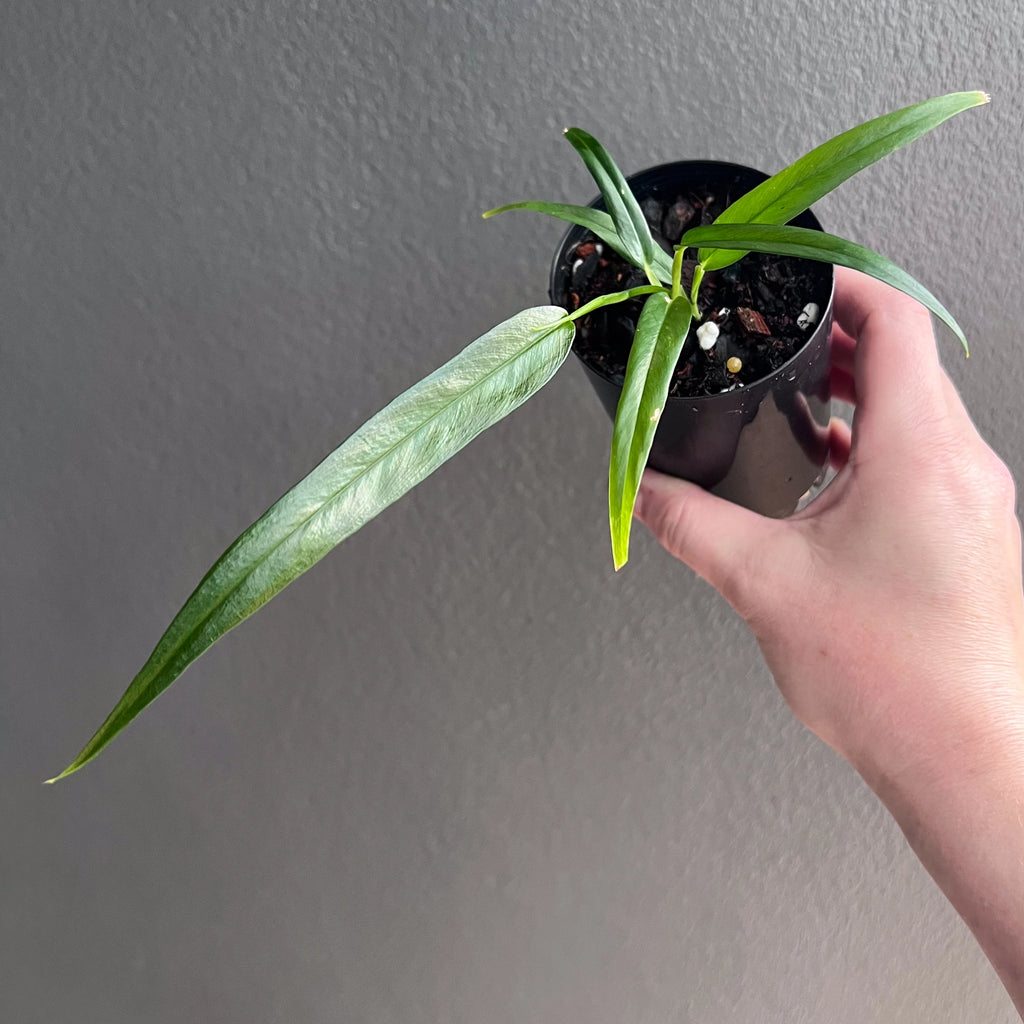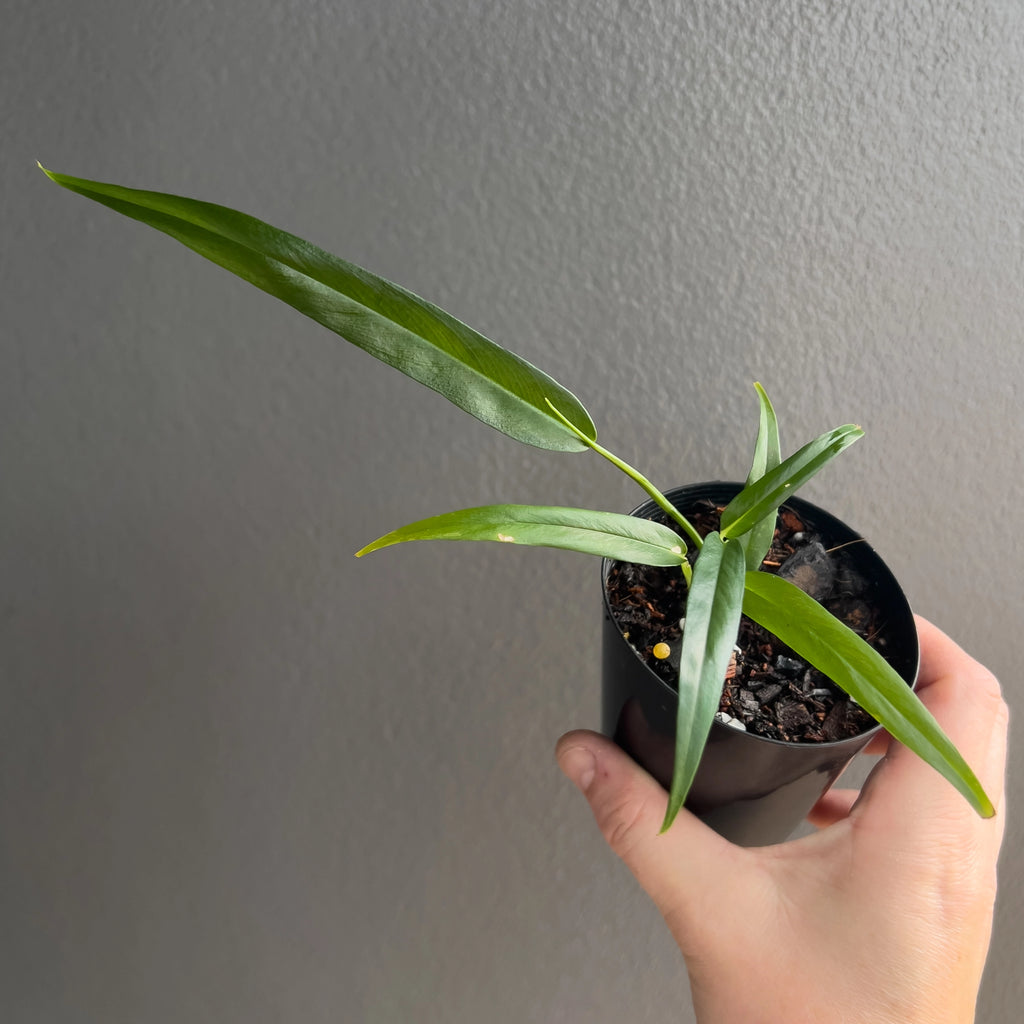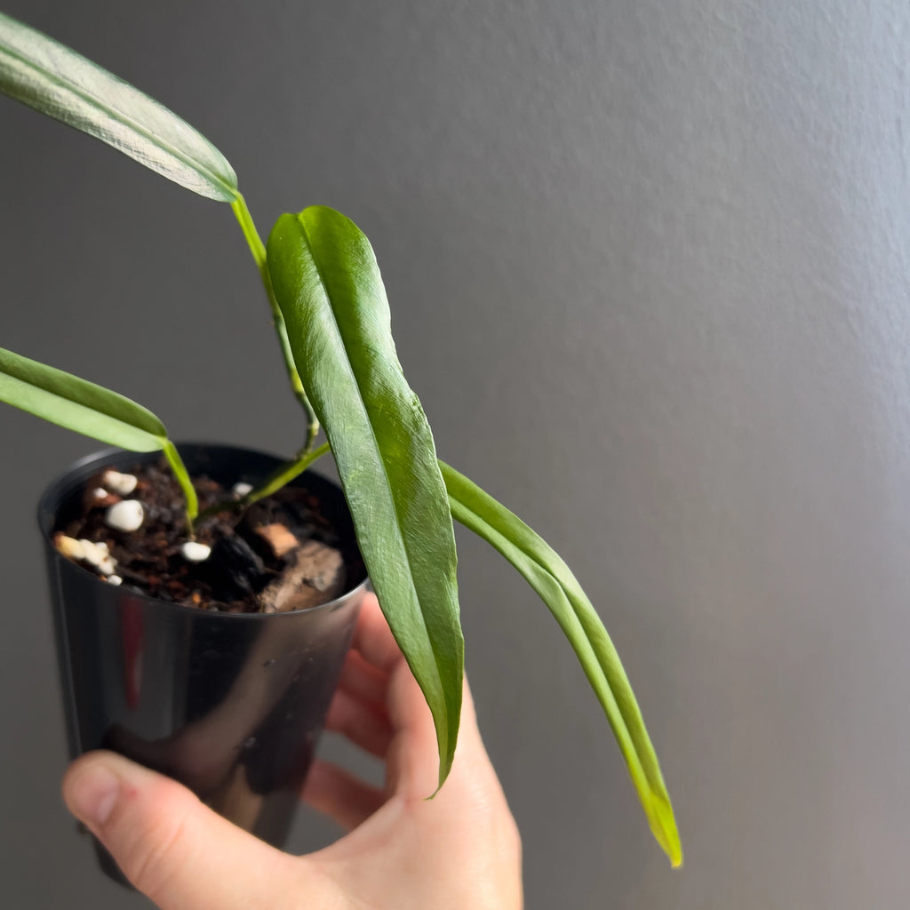 Philodendron chinchamayense is a rare climbing aroid, prized for its stunning, elongated leaves with deep green hues. This collector's plant thrives in bright, indirect light and prefers high humidity. It grows best with a support moss pole or trellis to showcase its climbing nature. A must-have for any indoor plant enthusiast, it adds a tropical touch to your space.