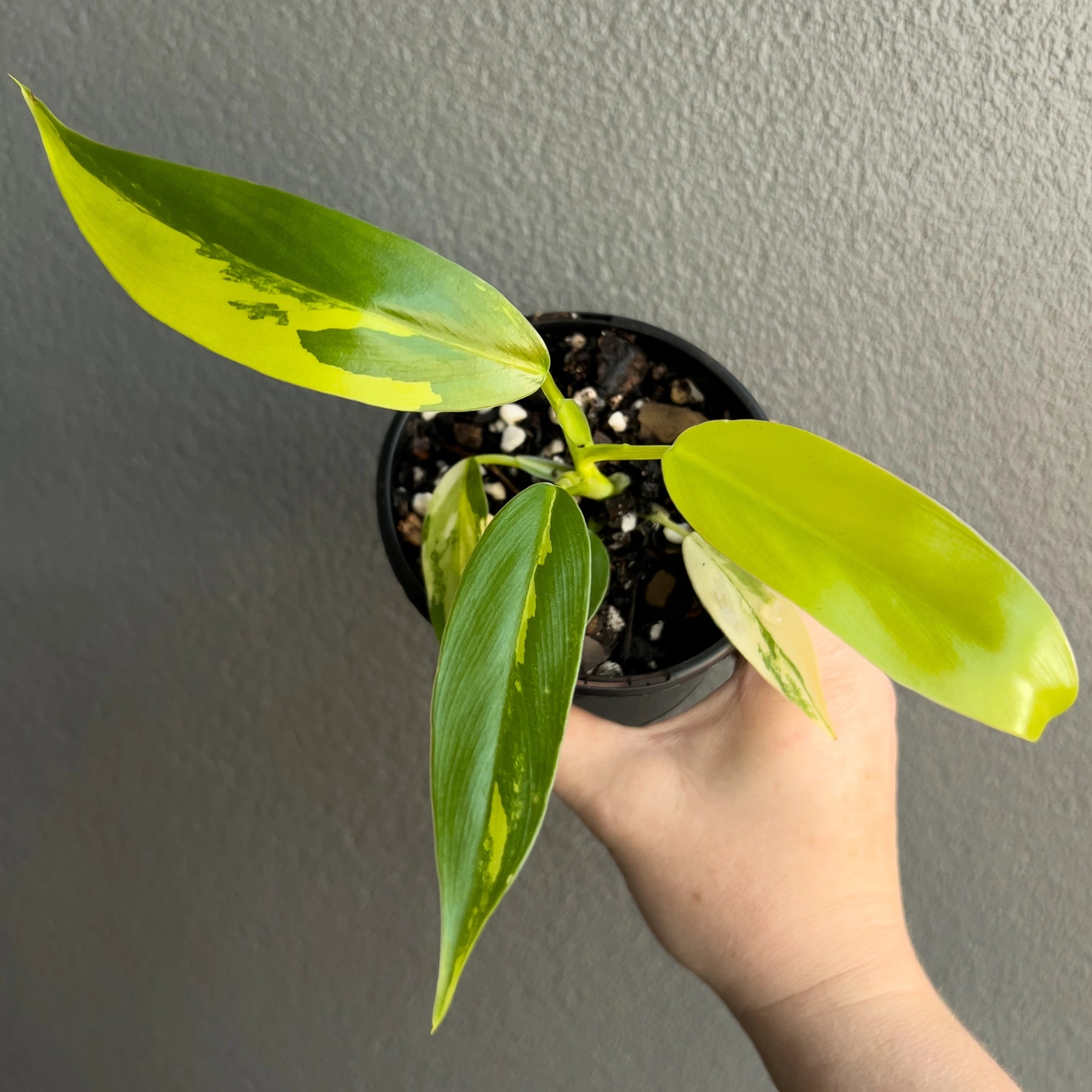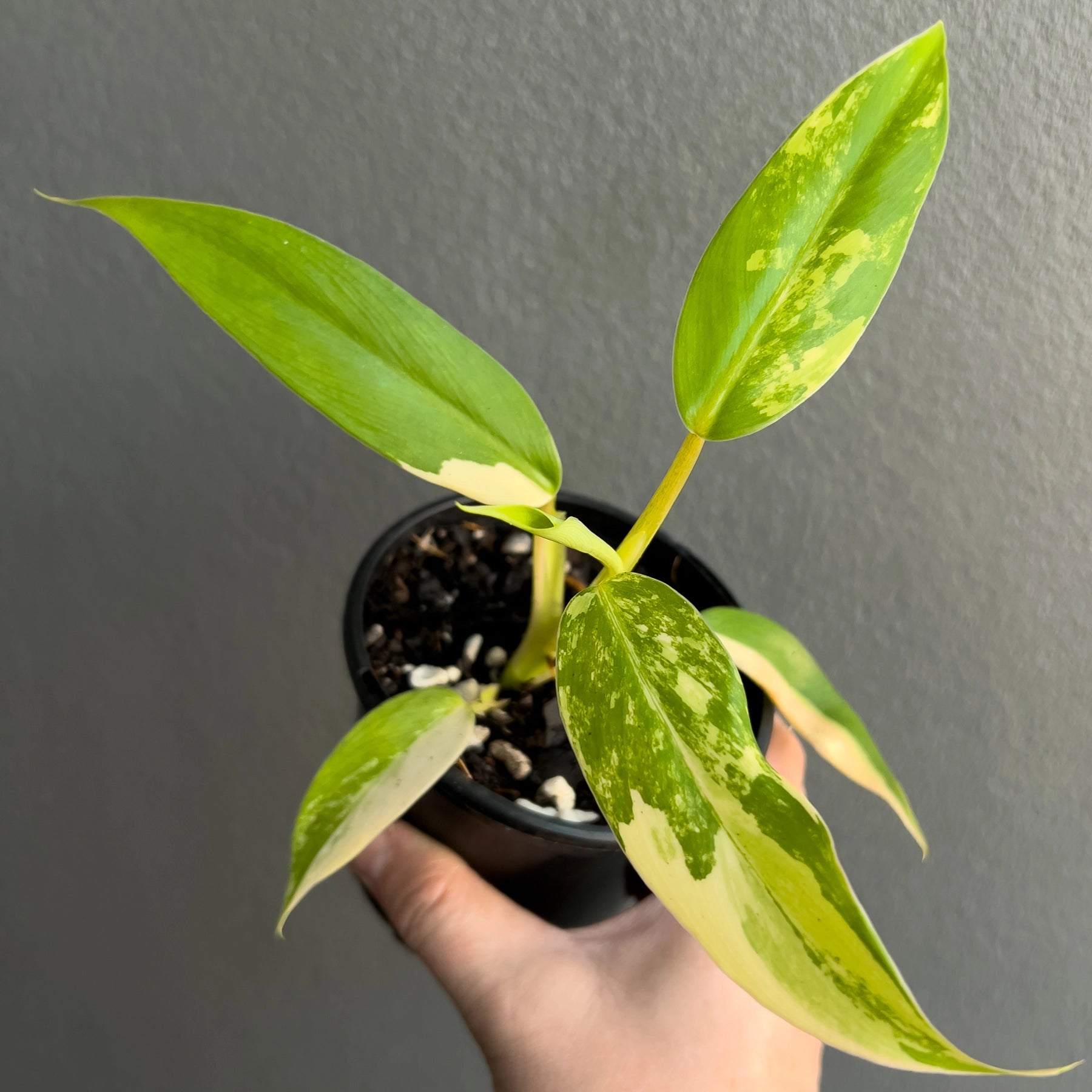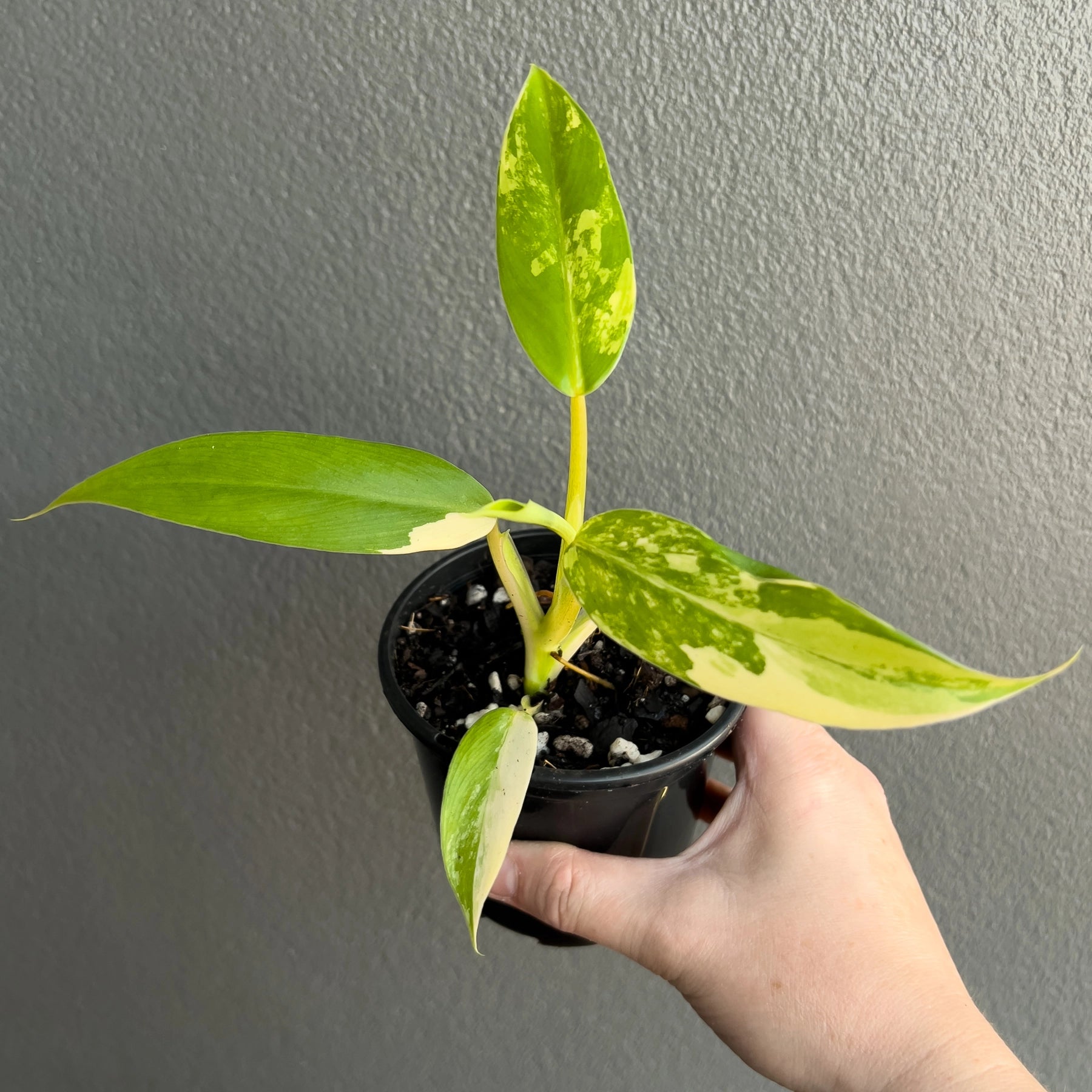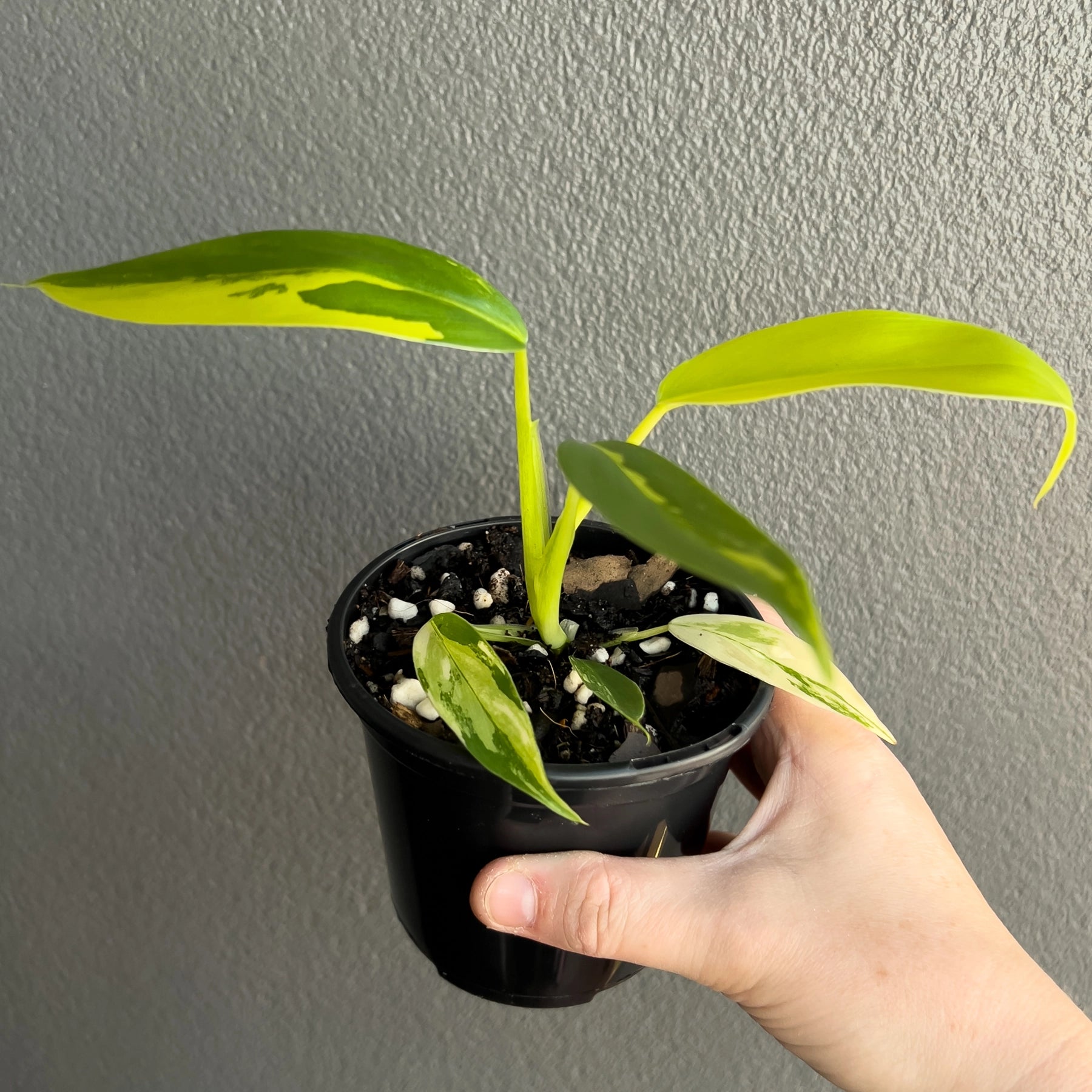 The Philodendron domesticum variegata is a climbing philodendron with eye-catching variegated leaves. Its large, glossy leaves are spade-shaped, featuring splashes and blocked bright green and yellow areas. These plants will need to be provided with bright, indirect light. They are fast growers, especially when given a moss pole or support to climb. The leaves can reach up to 56 cm in length and 23 cm in width once fully mature. Overall, the Philodendron domesticum variegata is a true collector’s plant that is easy to care for. Being higher variegated plants, these may require a grow light setup or a brighter indirect light environment. Propagated via cutting from our mother plant.
