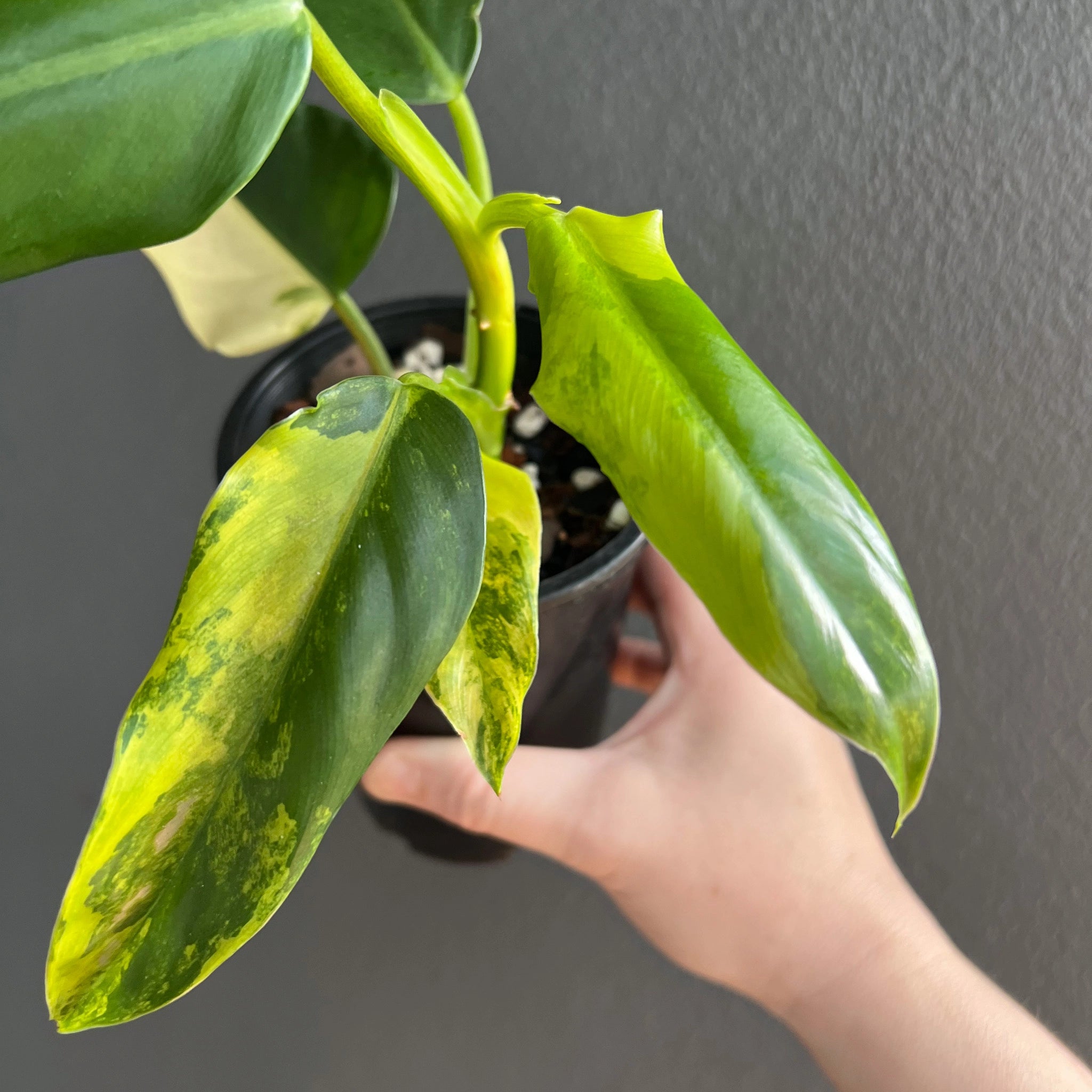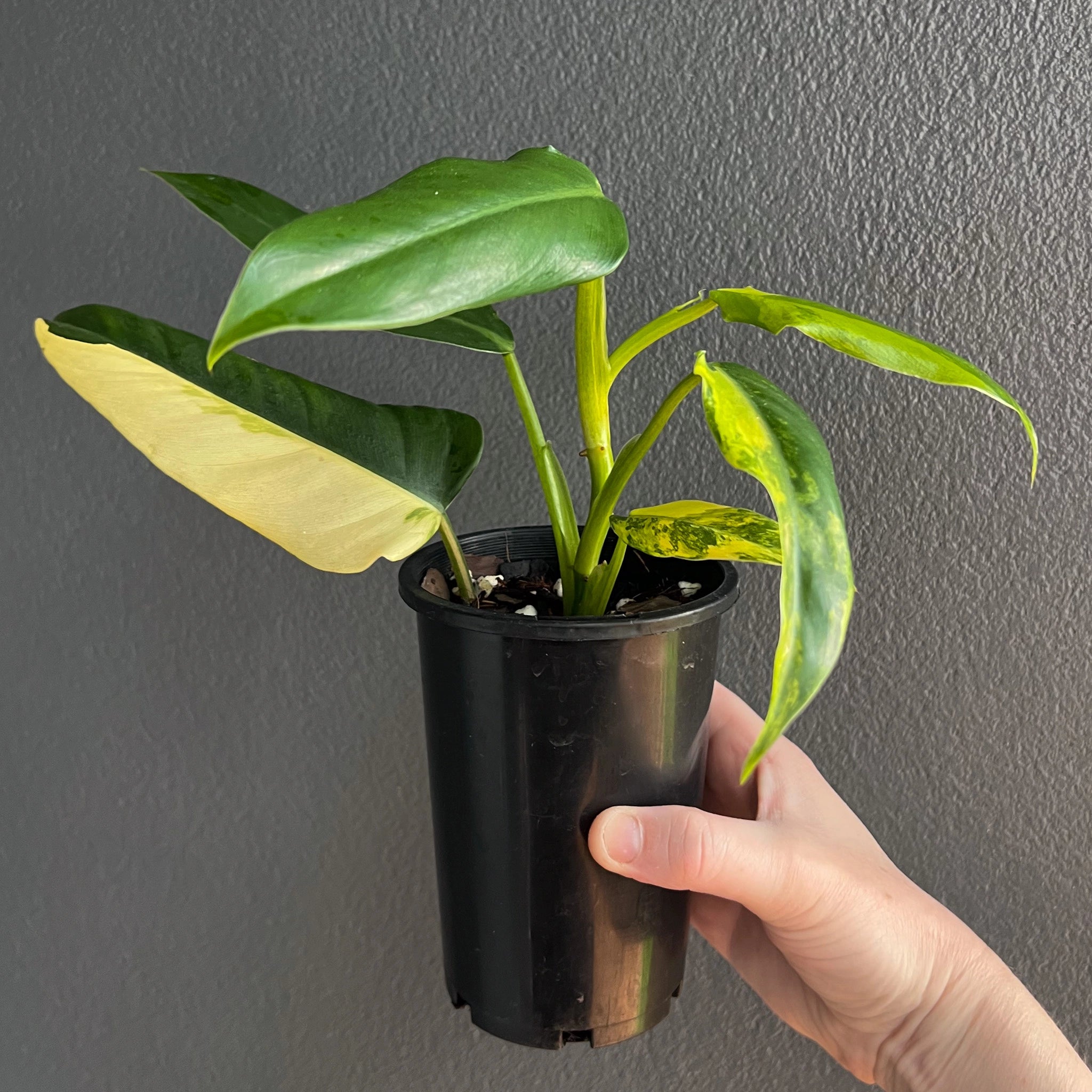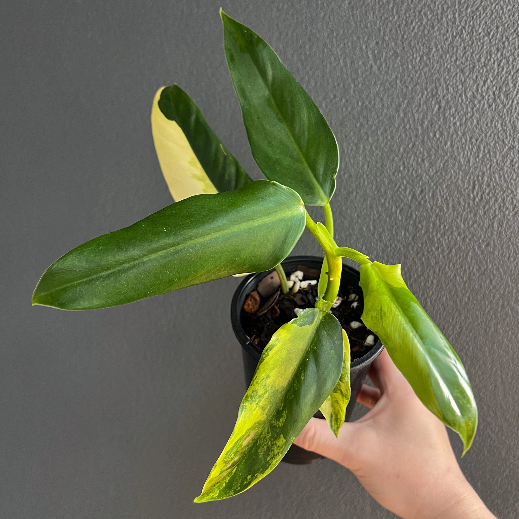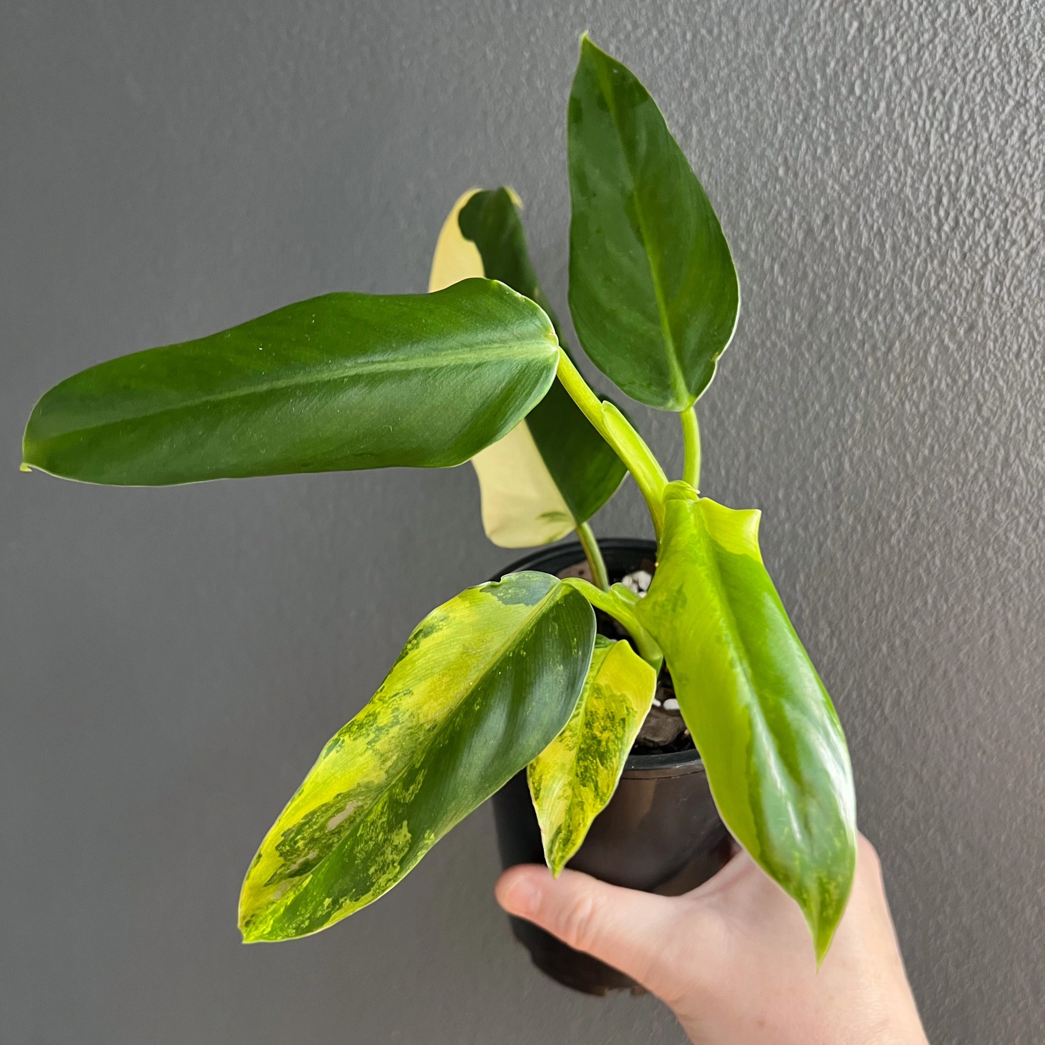 The Philodendron domesticum variegata is a climbing philodendron with eye-catching variegated leaves. Its large, glossy leaves are spade-shaped, featuring splashes and blocked bright green and yellow areas. These plants will need to be provided with bright, indirect light. They are fast growers, especially when given a moss pole or support to climb. The leaves can reach up to 56 cm in length and 23 cm in width once fully mature. Overall, the Philodendron domesticum variegata is a true collector’s plant that is easy to care for. Being higher variegated plants, these may require a grow light setup or a brighter indirect light environment. Propagated via cutting from our mother plant.