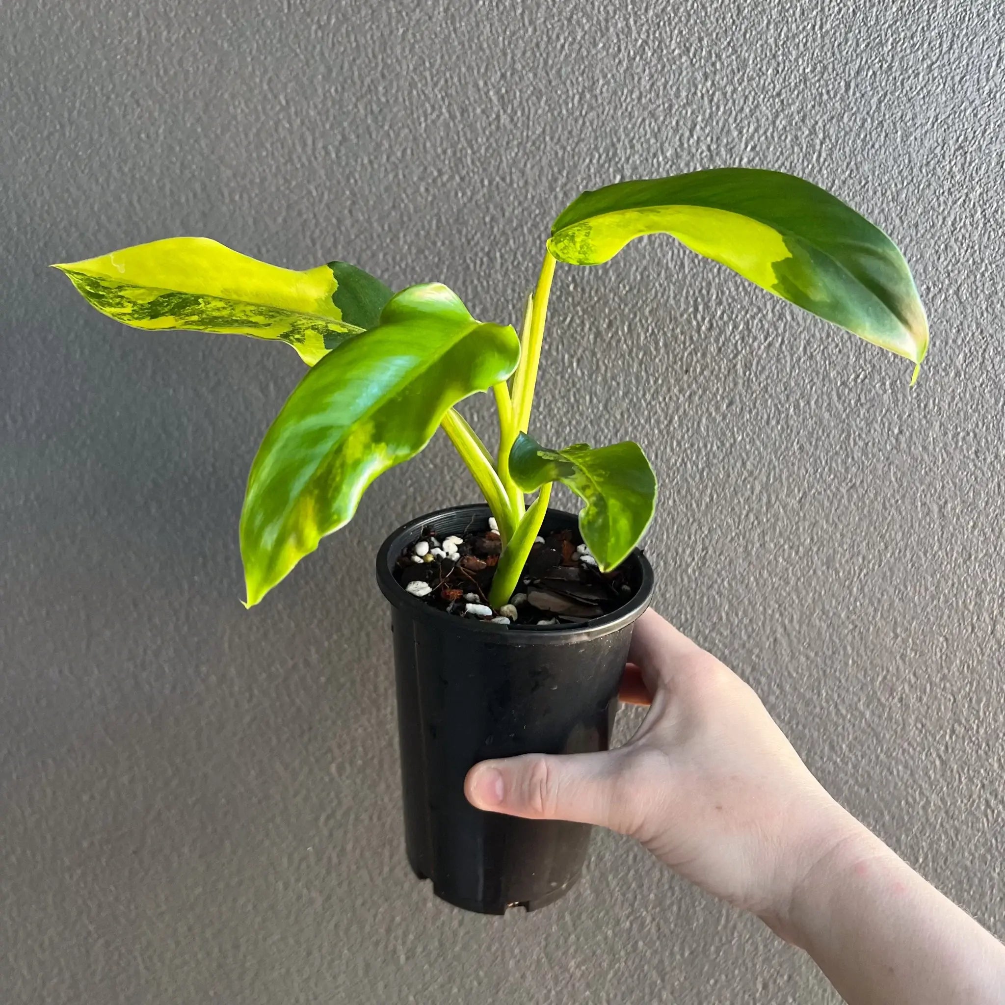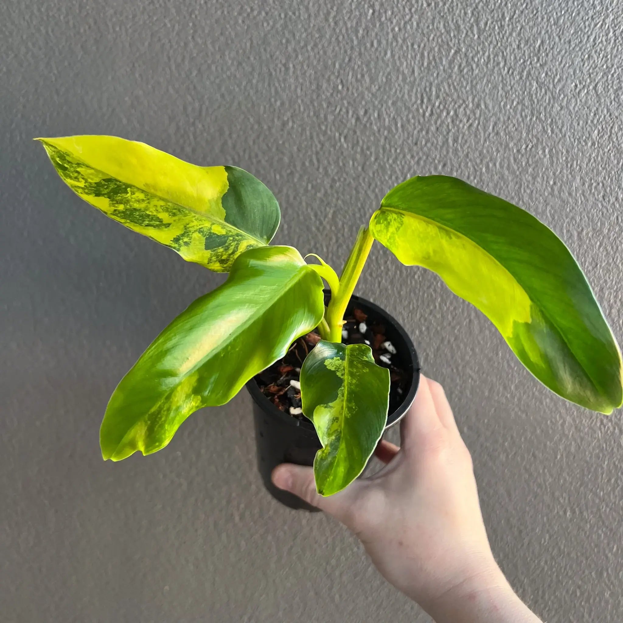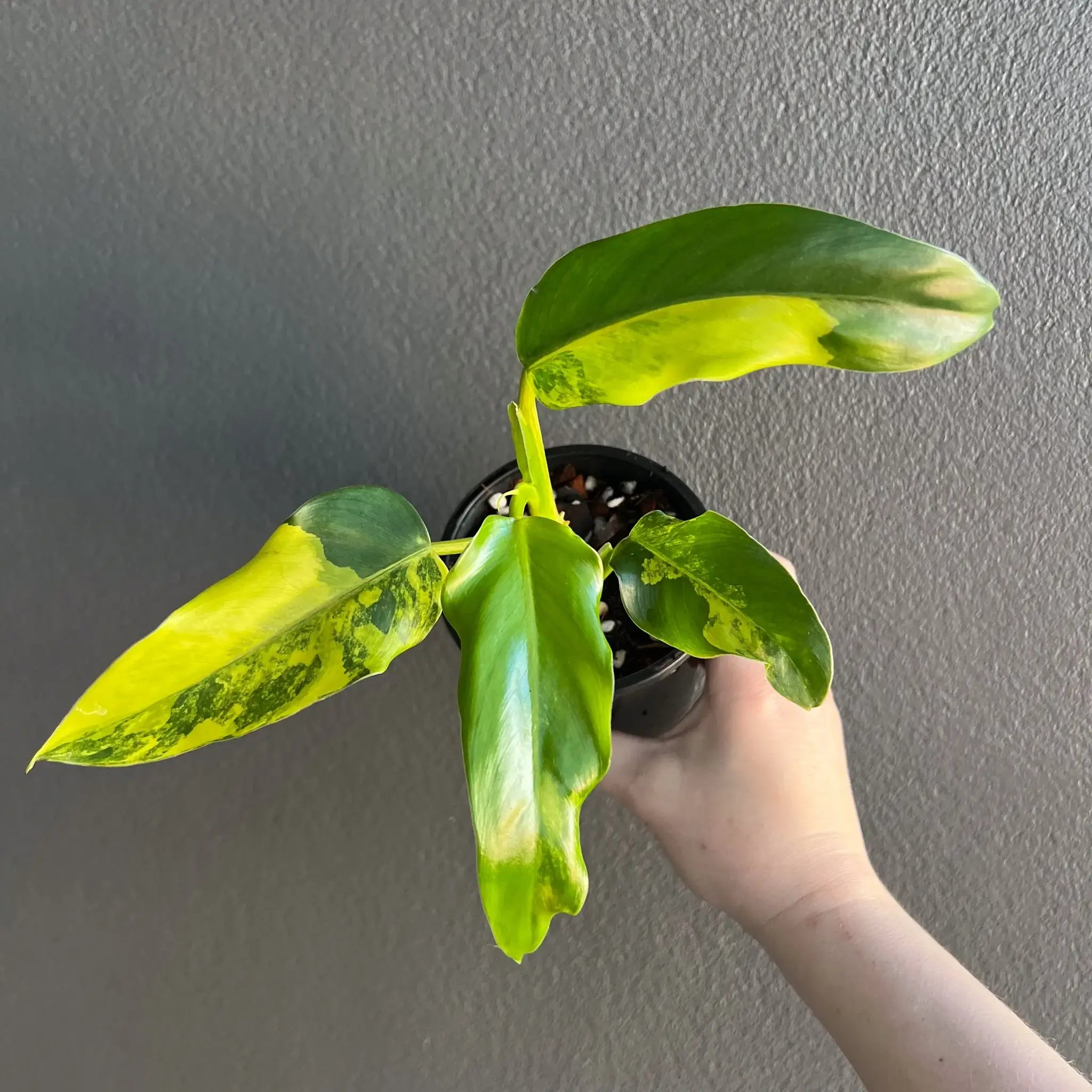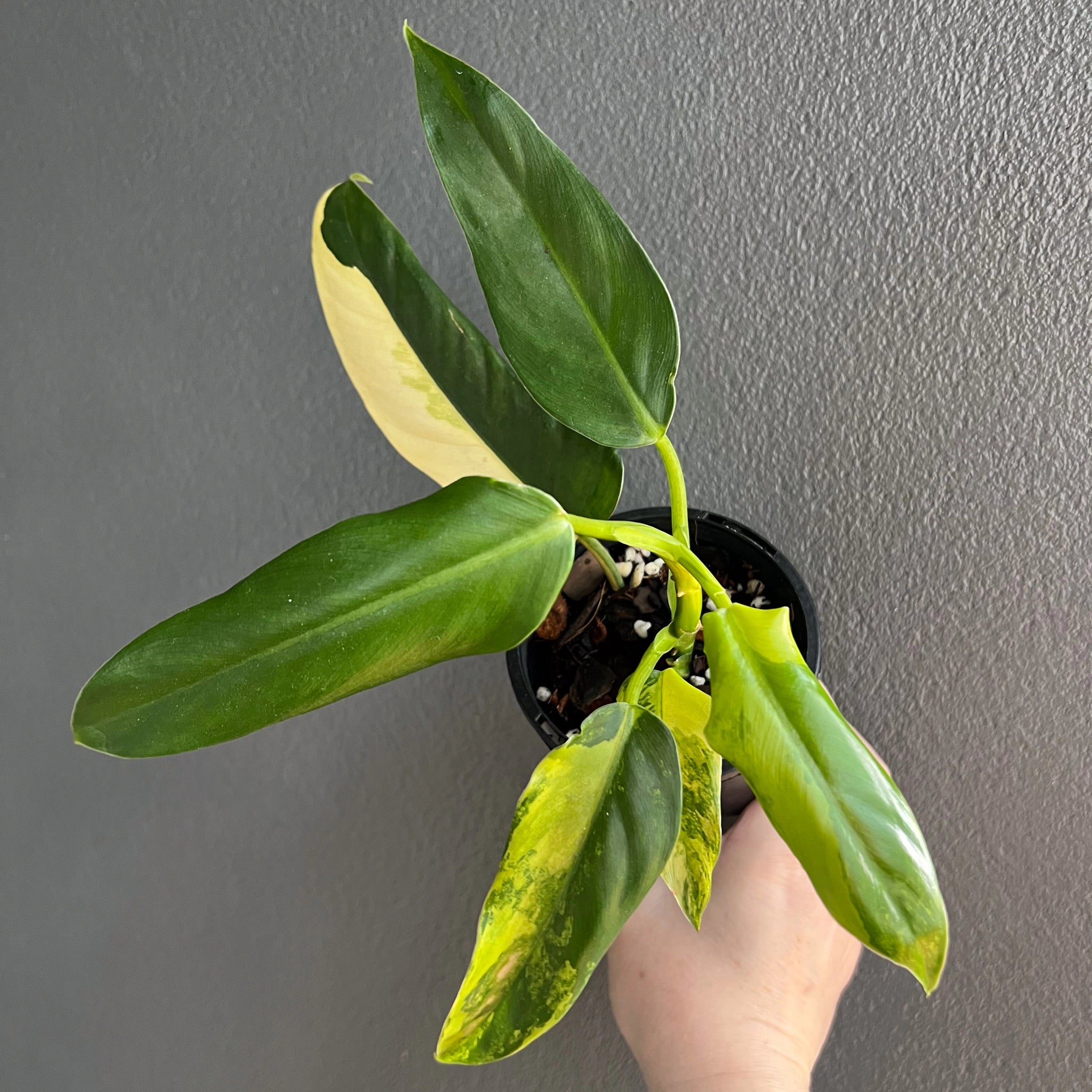 The Philodendron domesticum variegata is a climbing philodendron with eye-catching variegated leaves. Its large, glossy leaves are spade-shaped, featuring splashes and blocked bright green and yellow areas. These plants will need to be provided with bright, indirect light. They are fast growers, especially when given a moss pole or support to climb. The leaves can reach up to 56 cm in length and 23 cm in width once fully mature. Overall, the Philodendron domesticum variegata is a true collector’s plant that is easy to care for. Being higher variegated plants, these may require a grow light setup or a brighter indirect light environment. Propagated via cutting from our mother plant.