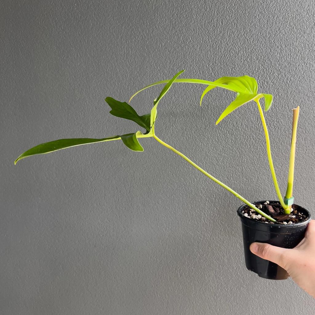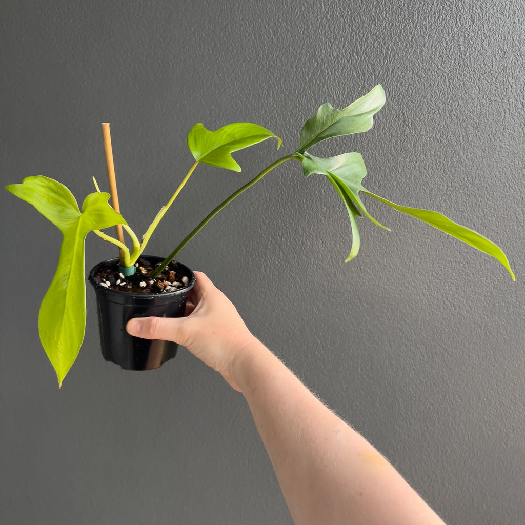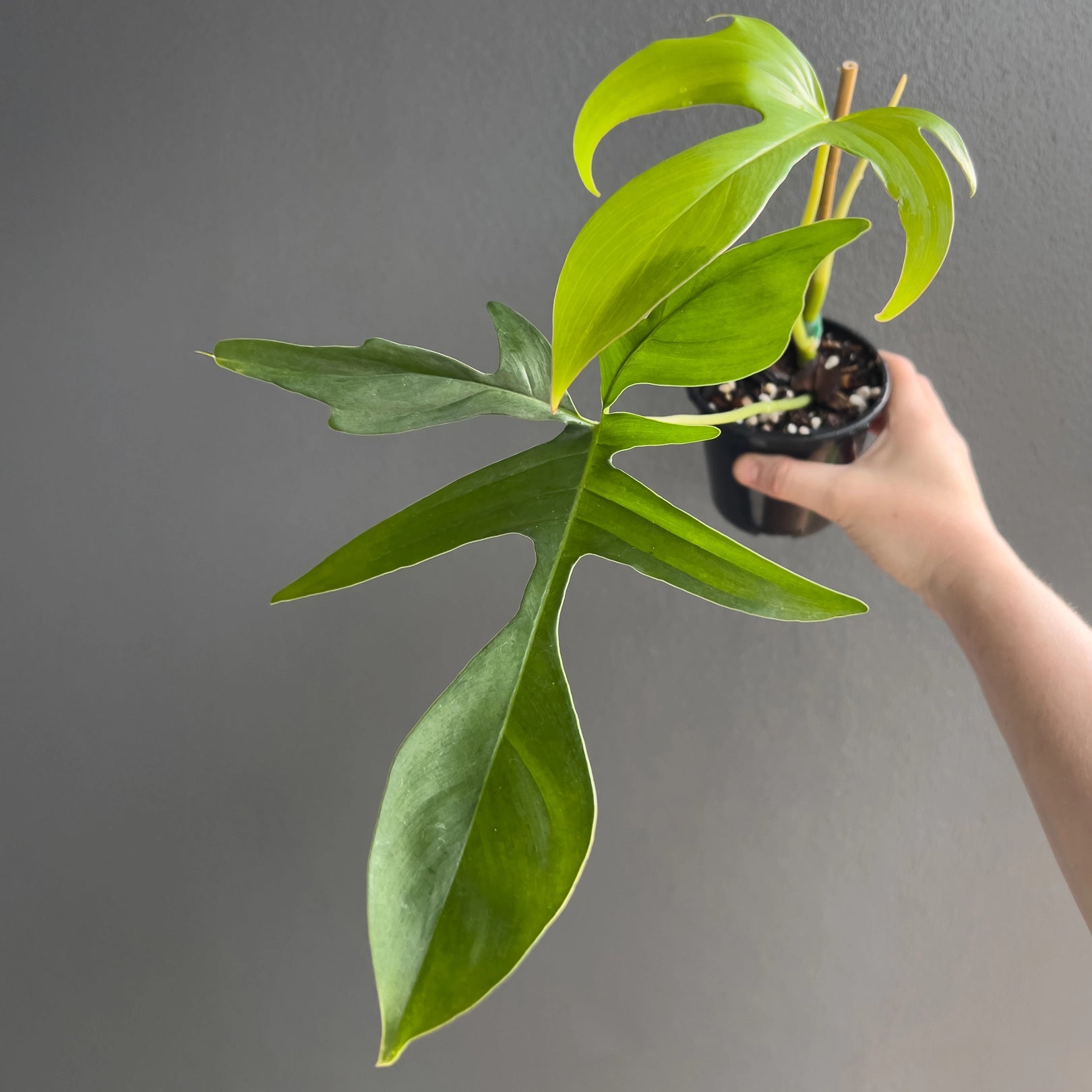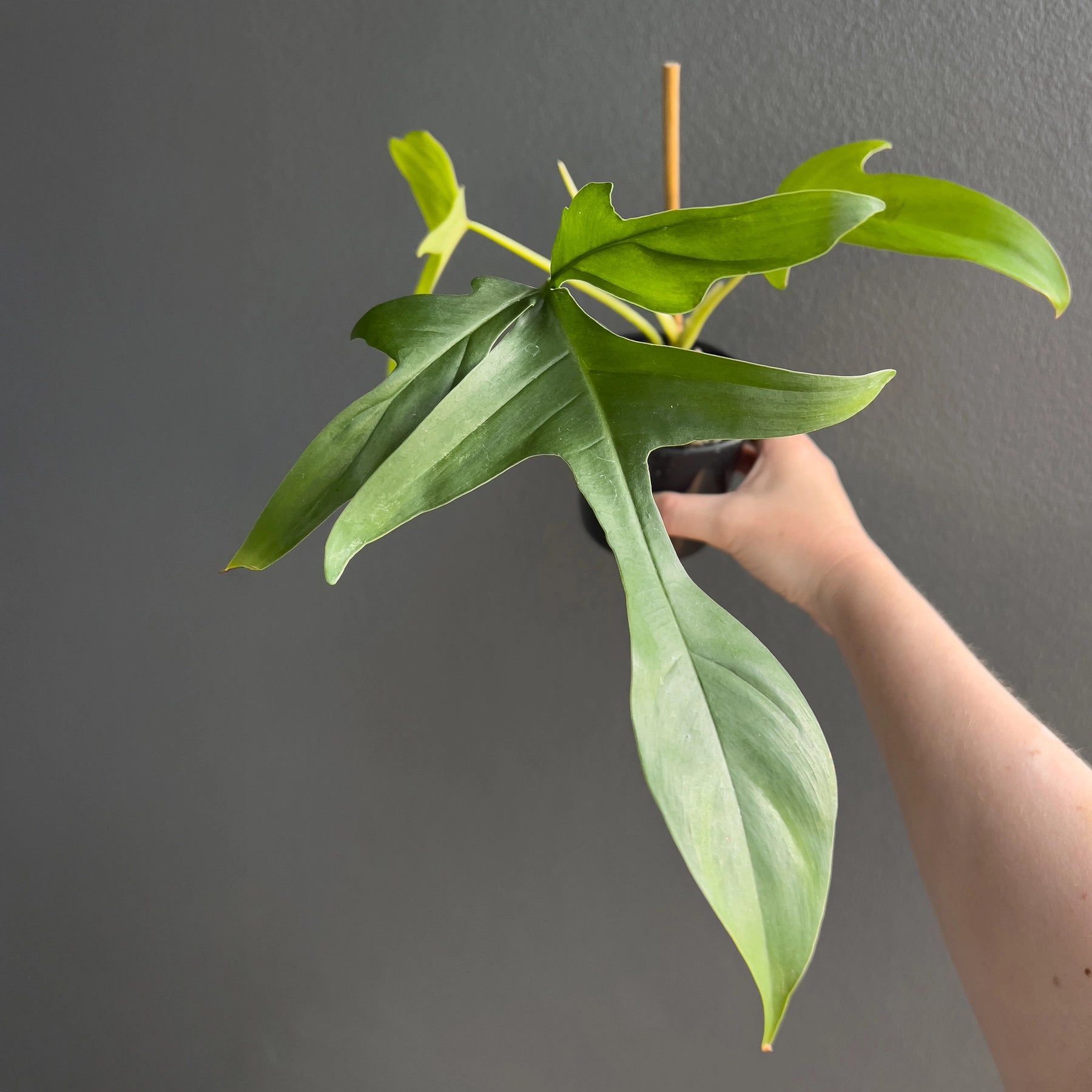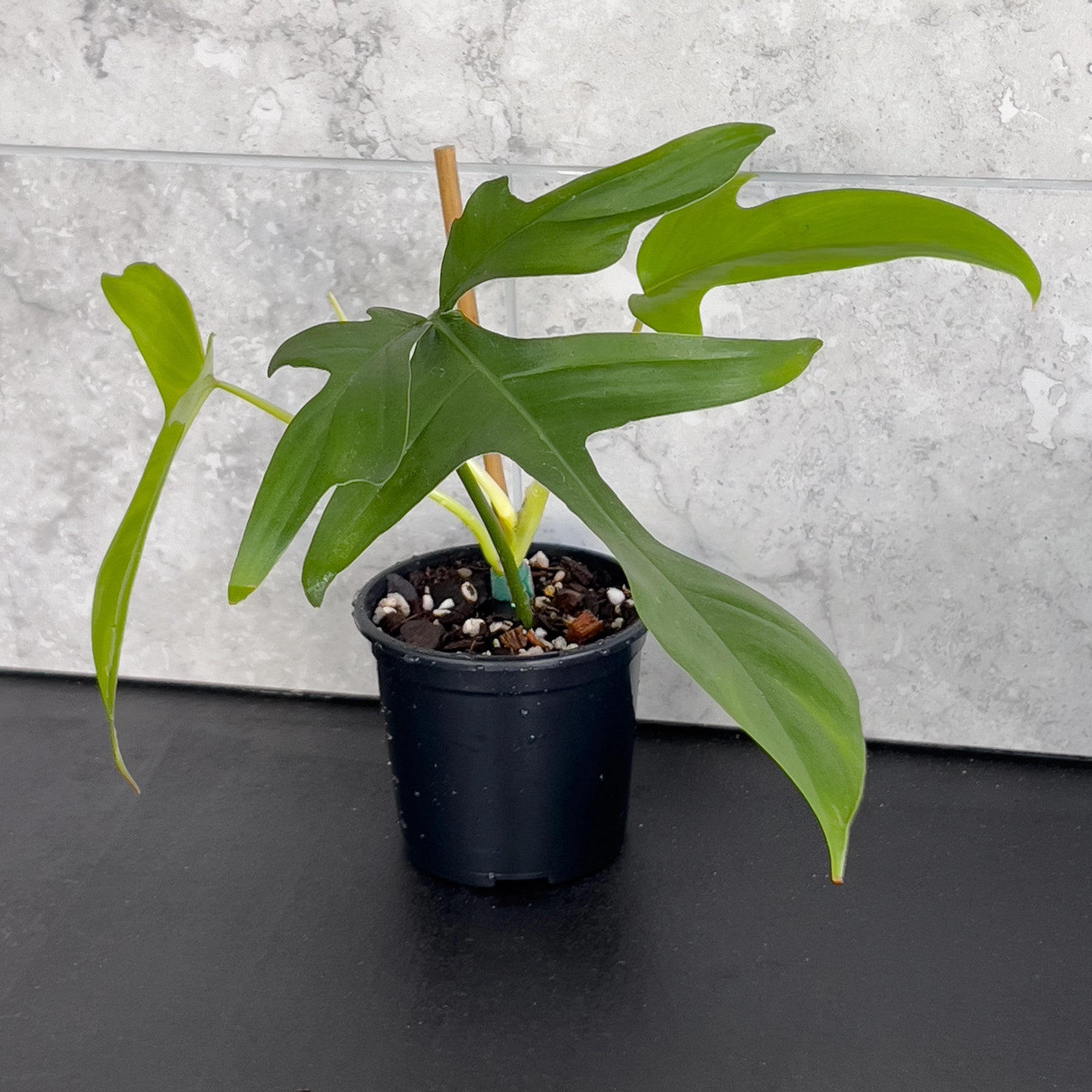 Philodendron pedatum 'Glad Hands', also known as Philodendron quercifolium, is a striking climbing species with deeply lobed, oak-like leaves that become more defined as the plant matures. The foliage starts out smaller and more simple in shape before developing elongated, finger-like lobes that give it a unique, sculptural appearance. The leaves are a deep green with a slightly glossy surface, and the plant thrives when given support to climb, producing increasingly larger foliage over time. With its vining growth habit and distinctive leaf form, Philodendron pedatum 'Glad Hands' makes an eye-catching addition to any indoor plant collection.
