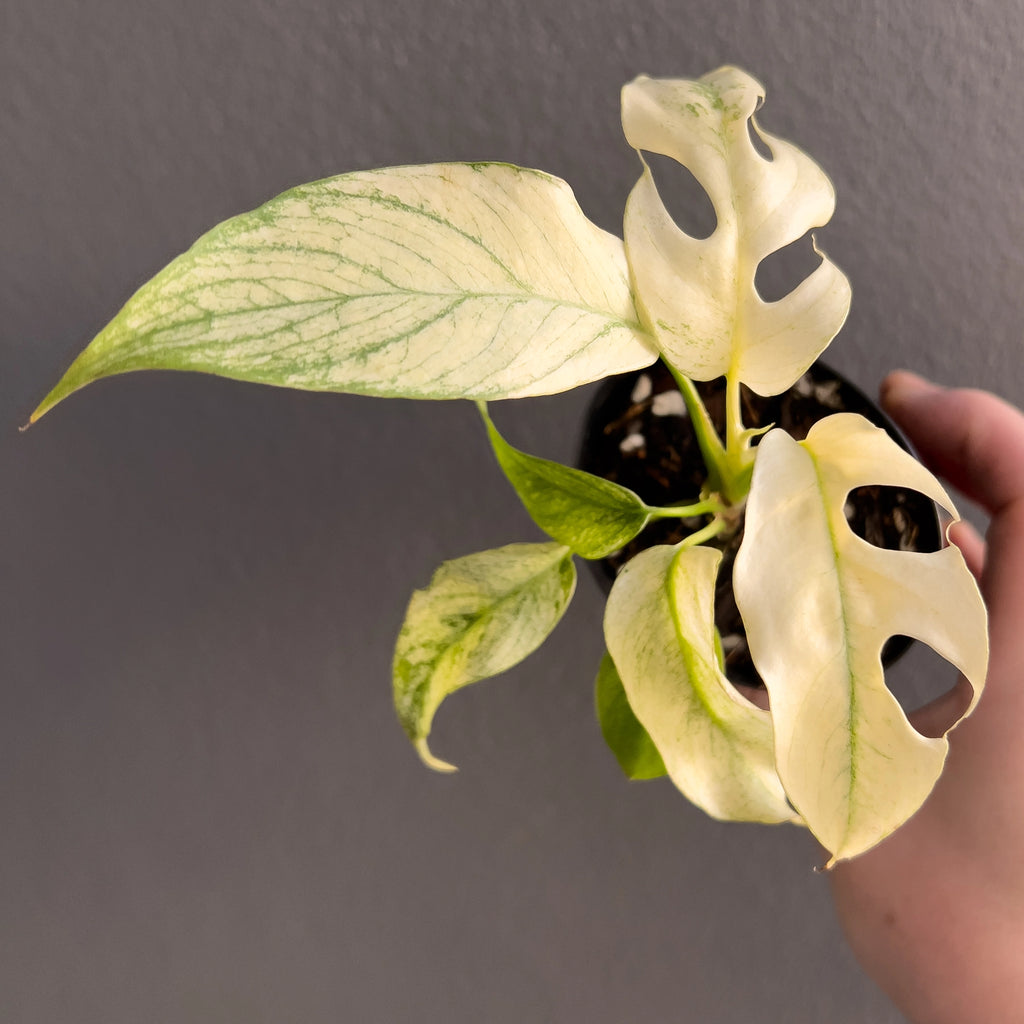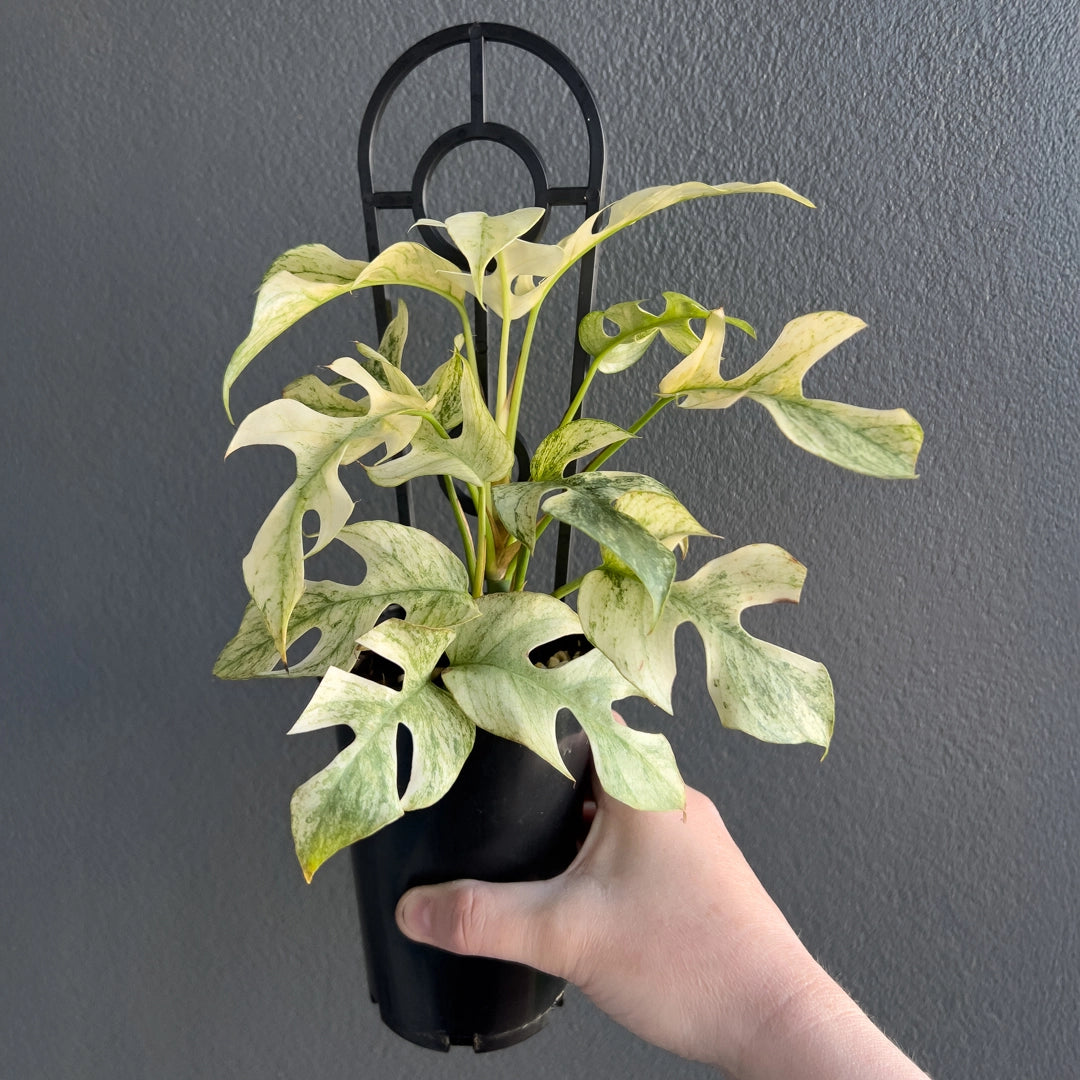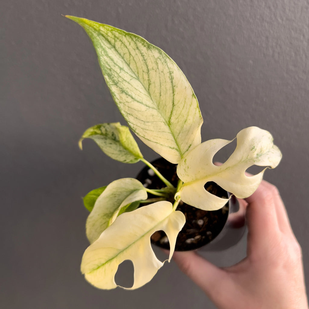 The Rhaphidophora Tetrasperma Mint Variegated is a highly variegated, rare collector’s plant with striking white and mint-green foliage. Leaves emerge bright white with mint variegation and mature to deeper greens. Due to its delicate variegation, it requires experienced care in stable humidity (70%), warm temperatures (25°C+), and bright, consistent lighting such as a quality LED grow light. Ideal conditions include a grow tent, greenhouse, or plant cabinet, as environmental fluctuations may cause browning or complete leaf whitening. Please note, these plant were propagated through stem cuttings, and its beautiful variegation is naturally unique and may vary over time. Some leaves may emerge all-white, which can be trimmed back to encourage balanced growth. While we take great care in cultivating these plants, the final level of variegation is random and can’t be guaranteed, as it’s part of what makes each plant one-of-a-kind.