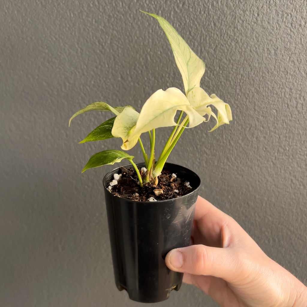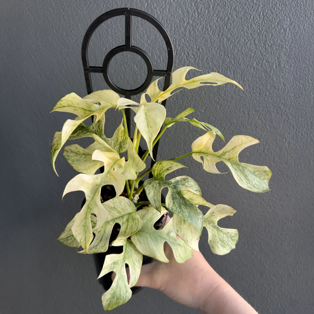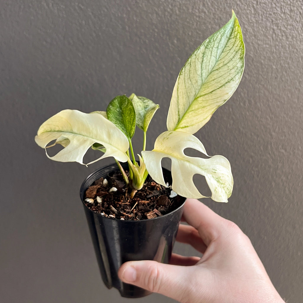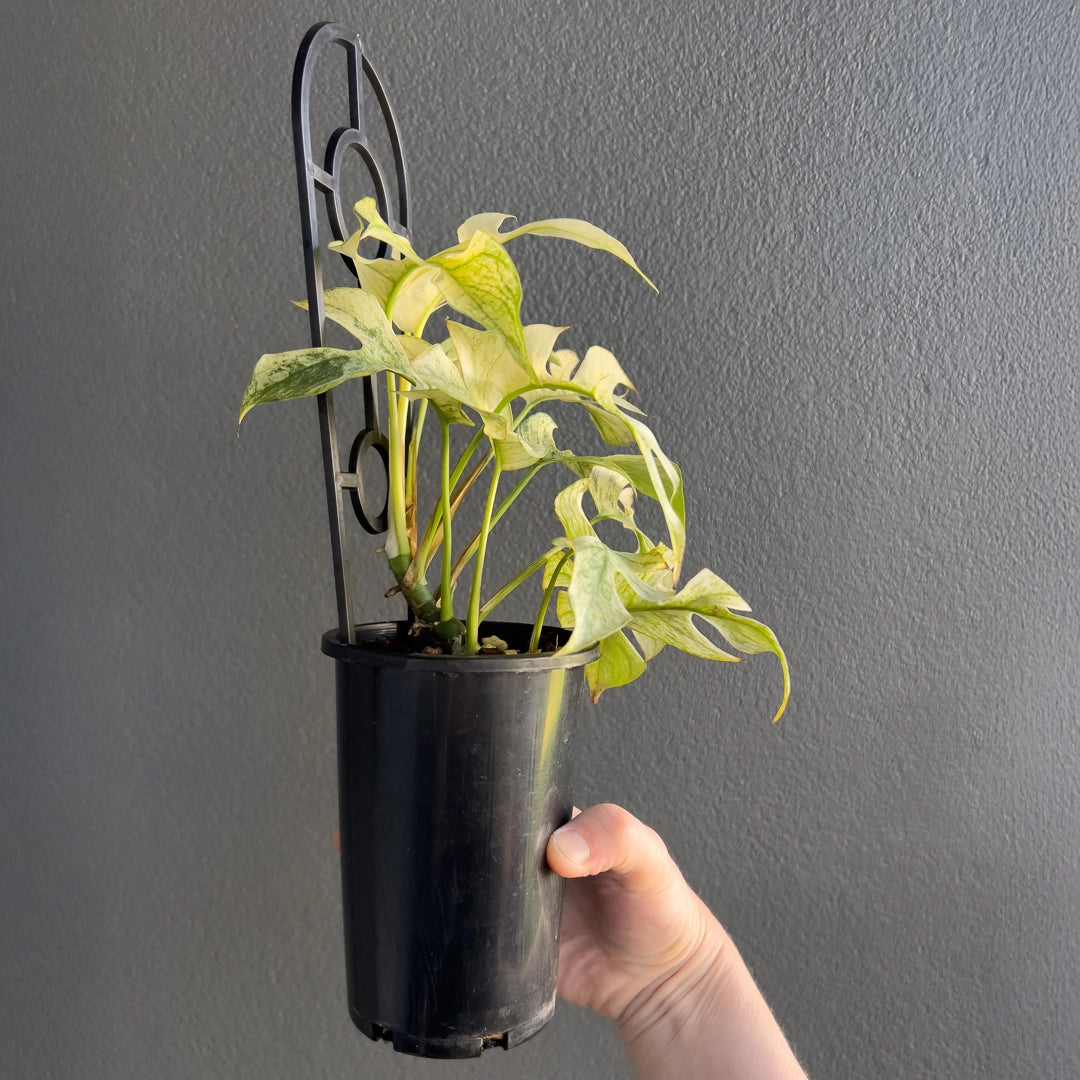 The Rhaphidophora Tetrasperma Mint Variegated is a highly variegated, rare collector’s plant with striking white and mint-green foliage. Leaves emerge bright white with mint variegation and mature to deeper greens. Due to its delicate variegation, it requires experienced care in stable humidity (70%), warm temperatures (25°C+), and bright, consistent lighting such as a quality LED grow light. Ideal conditions include a grow tent, greenhouse, or plant cabinet, as environmental fluctuations may cause browning or complete leaf whitening. Please note, these plant were propagated through stem cuttings, and its beautiful variegation is naturally unique and may vary over time. Some leaves may emerge all-white, which can be trimmed back to encourage balanced growth. While we take great care in cultivating these plants, the final level of variegation is random and can’t be guaranteed, as it’s part of what makes each plant one-of-a-kind.