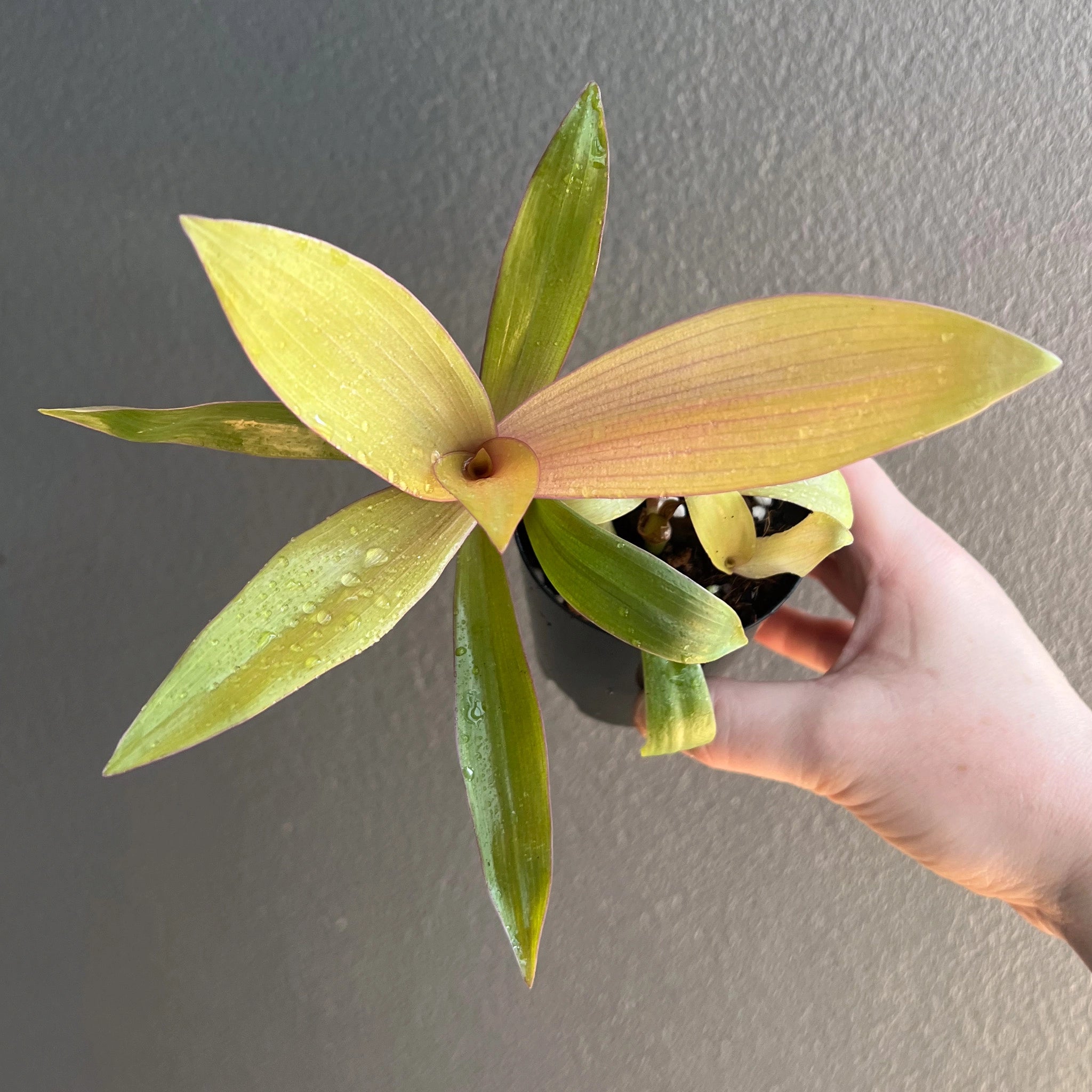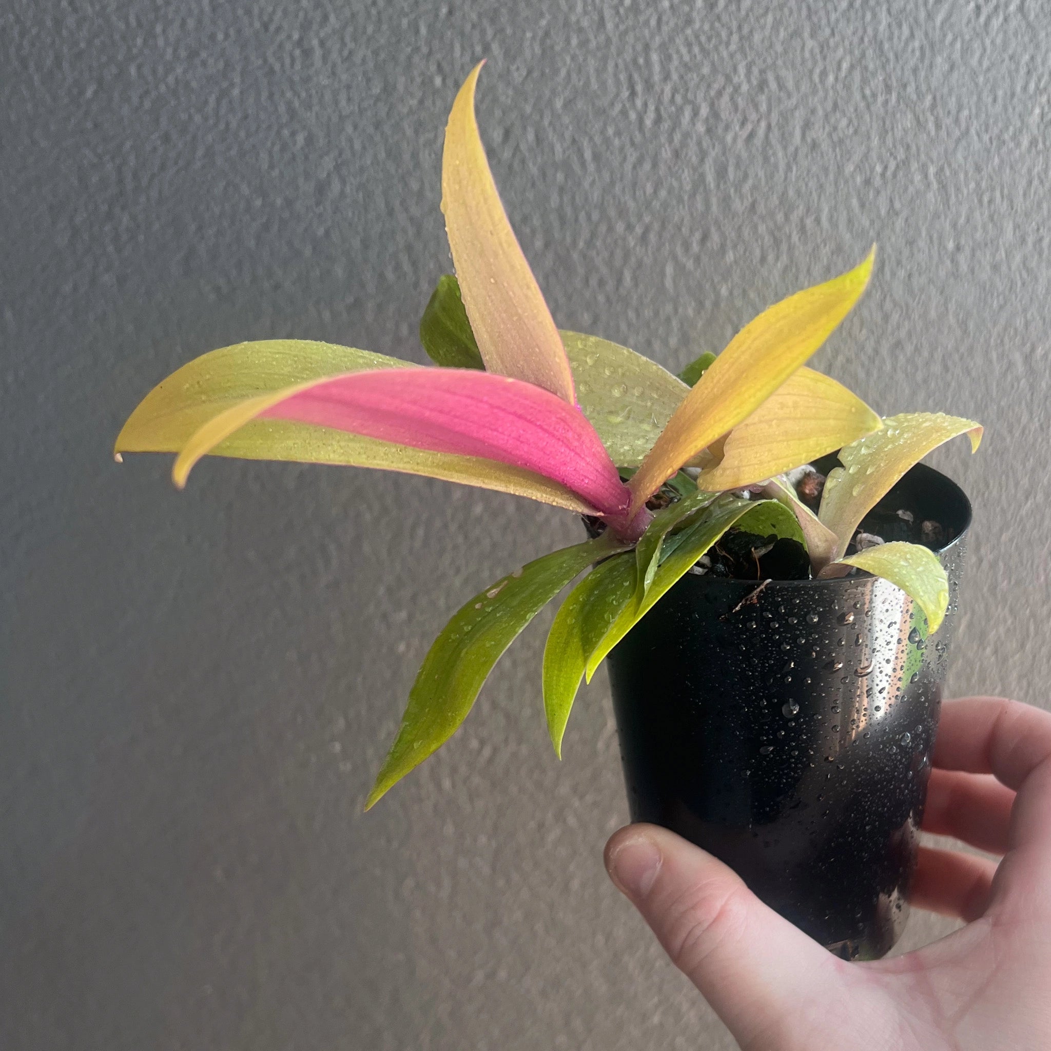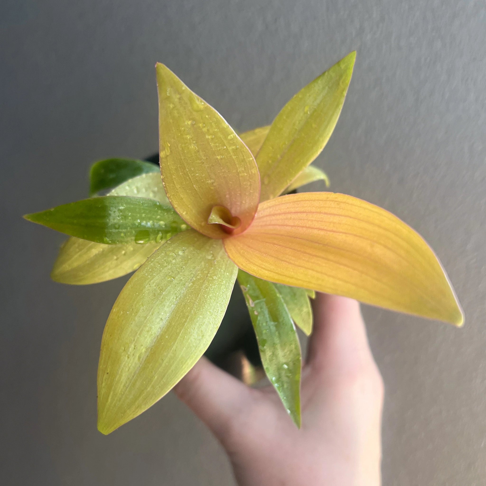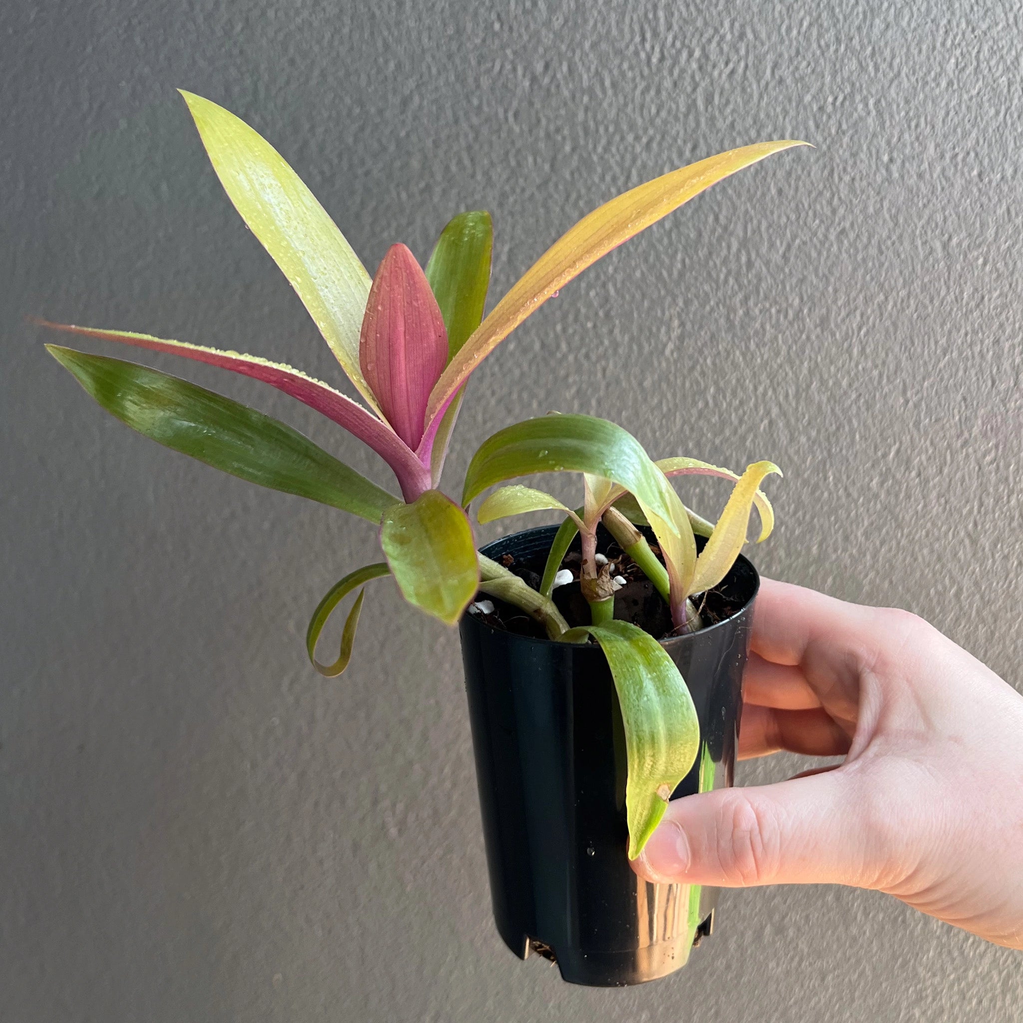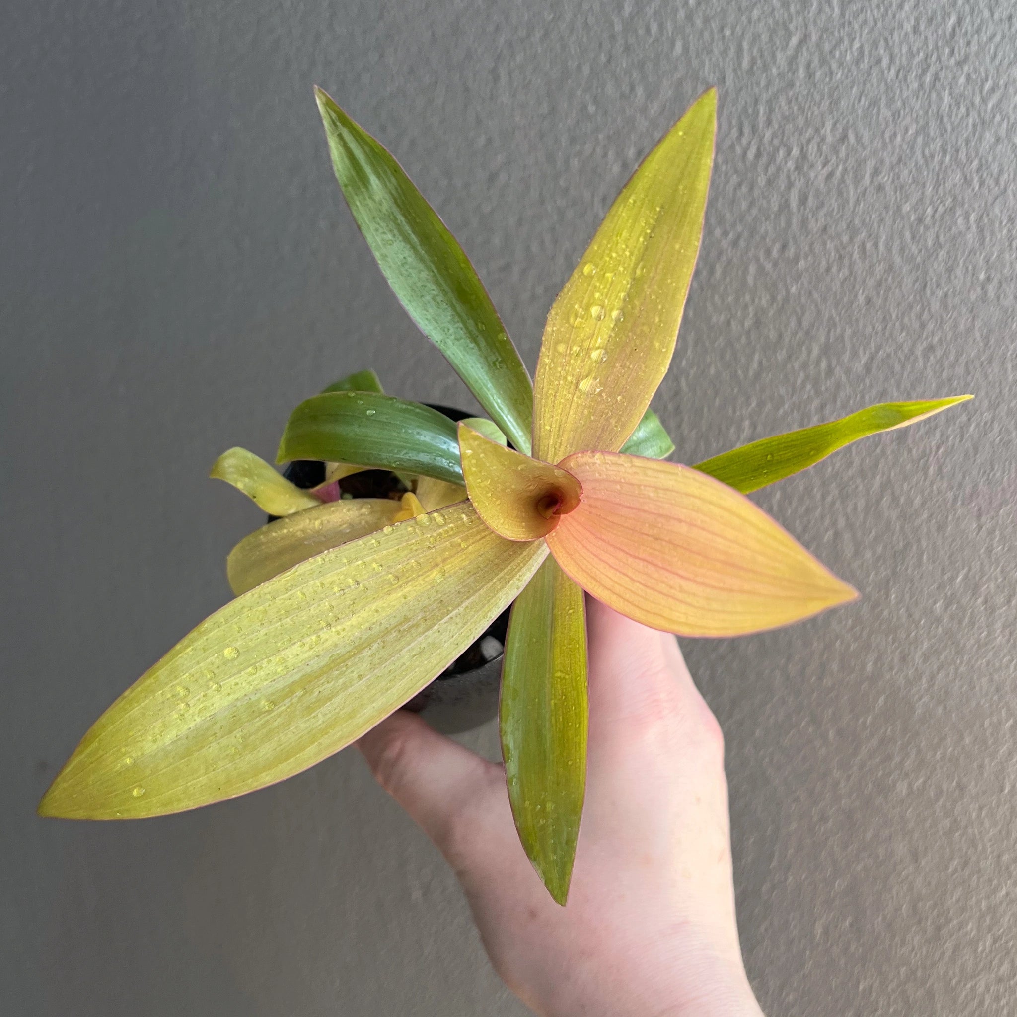 Rhoeo 'Gold' is a compact, clumping plant with striking, elongated leaves that grow in a rosette pattern. Its foliage is vibrant golden-yellow to chartreuse, sometimes featuring subtle green undertones. Leaves are sword-shaped, slightly fleshy, and glossy, typically reaching around 20–30 cm in length. The plant maintains its bright colouration best in bright, indirect light. Ideal for adding colour contrast to indoor collections, it grows neatly, forming attractive clusters.